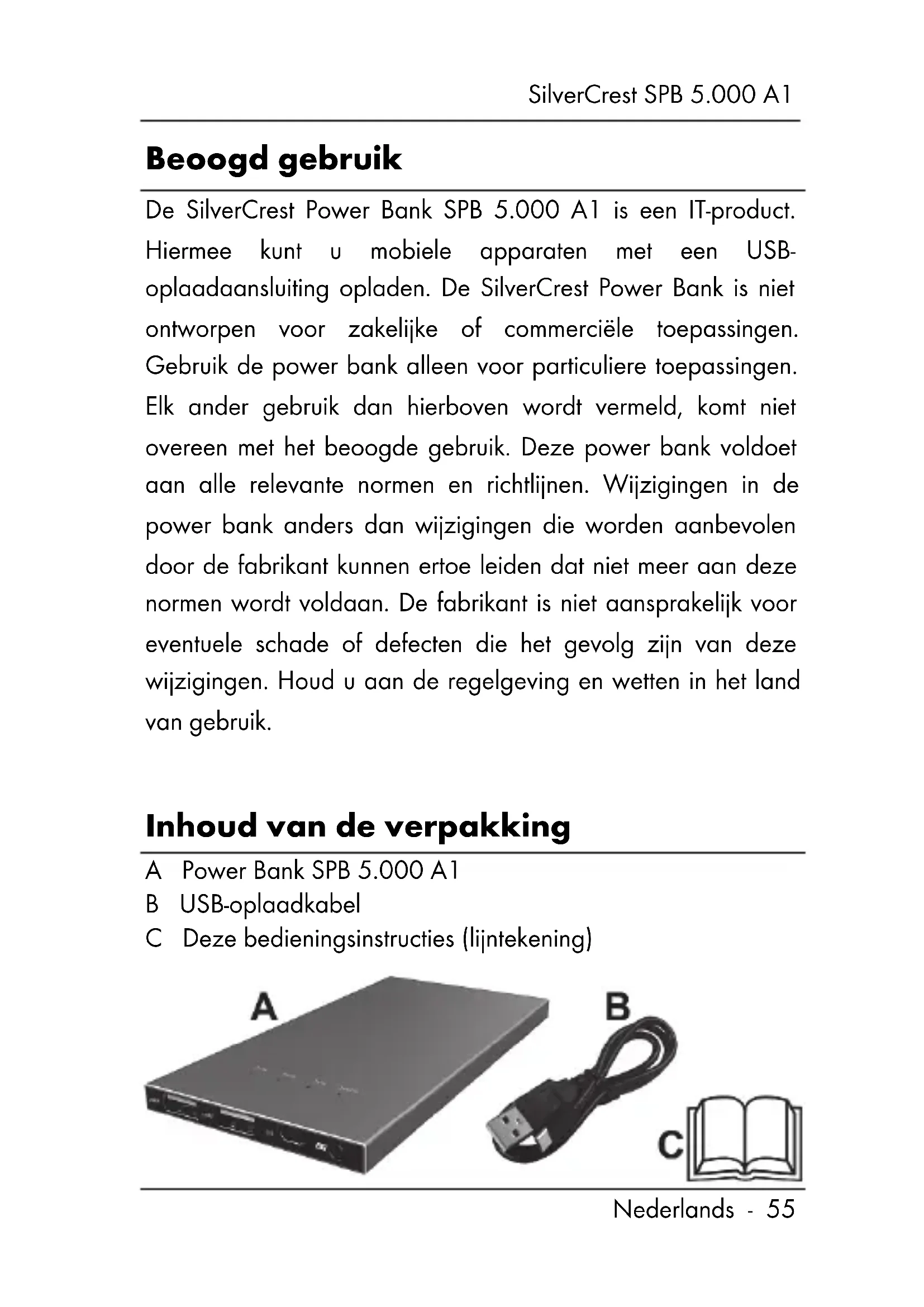 Milieuvoorschriften en afvalverwijdering .......... 68 Conformiteit ....................................................... 68 Garantie- en service-informatie .......................... 69 Inleiding Bedankt dat u hebt gekozen voor een product van SilverCrest. Met de SilverCrest Power Bank SPB 5.000 A1 kunt u de lege accu van bijvoorbeeld een telefoon opladen wanneer u onderweg bent en er geen stopcontact beschikbaar is.SilverCrest SPB 5.000 A1 Nederlands - 55 Beoogd gebruik De SilverCrest Power Bank SPB 5.000 A1 is een IT-product. Hiermee kunt u mobiele apparaten met een USB- oplaadaansluiting opladen. De SilverCrest Power Bank is niet ontworpen voor zakelijke of commerciële toepassingen. Gebruik de power bank alleen voor particuliere toepassingen. Elk ander gebruik dan hierboven wordt vermeld, komt niet overeen met het beoogde gebruik. Deze power bank voldoet aan alle relevante normen en richtlijnen. Wijzigingen in de power bank anders dan wijzigingen die worden aanbevolen door de fabrikant kunnen ertoe leiden dat niet meer aan deze normen wordt voldaan. De fabrikant is niet aansprakelijk voor eventuele schade of defecten die het gevolg zijn van deze wijzigingen. Houd u aan de regelgeving en wetten in het land van gebruik. Inhoud van de verpakking A Power Bank SPB 5.000 A1 B USB-oplaadkabel C Deze bedieningsinstructies (lijntekening)SilverCrest SPB 5.000 A1