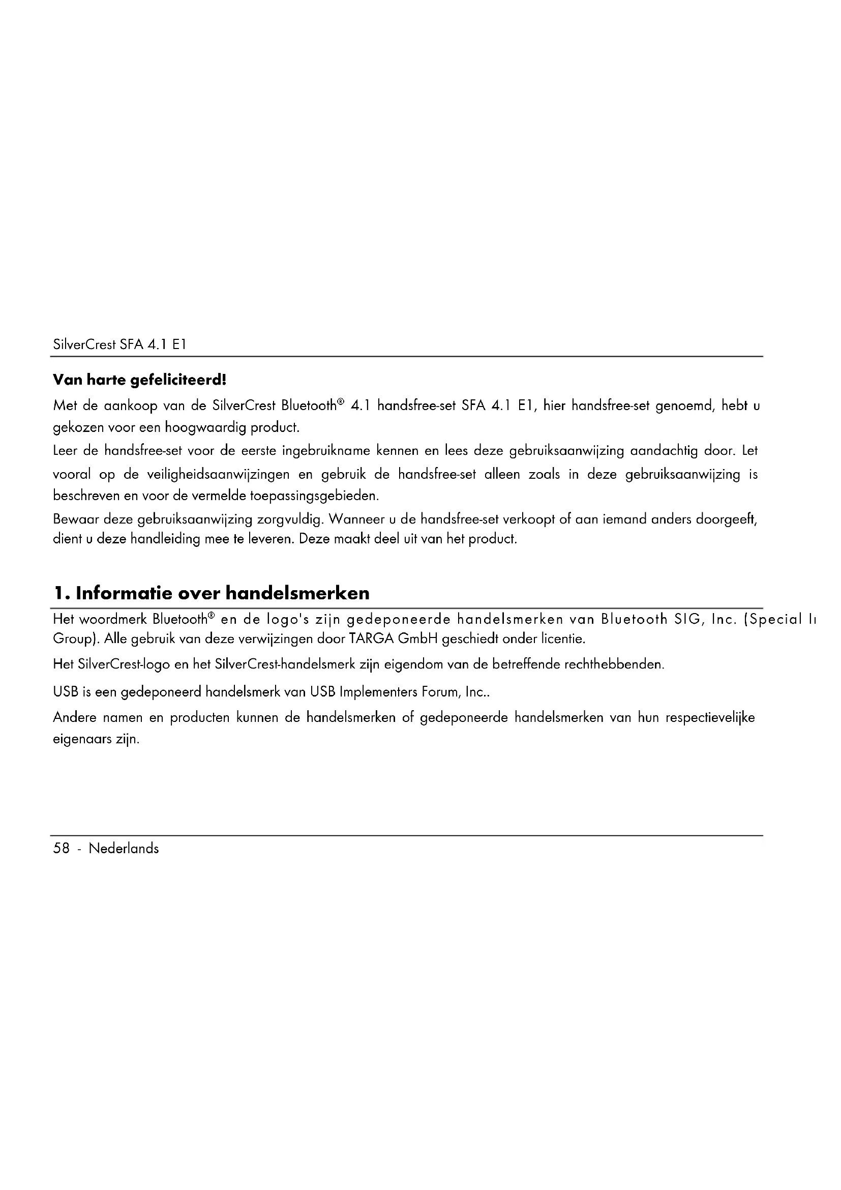 De handsfree-set stemt overeen met de fundamentele vereisten en andere relevante voorschriften die zijn vastgelegd in de RE-richtlijn 2014/53/EU en de RoHS-richtlijn 2011/65/EU. De volledige EU-conformiteitsverklaring kan via de volgende link worden gedownload: www.targa.de/downloads/conformity/311608.pdfSilverCrest SFA 4.1 E1