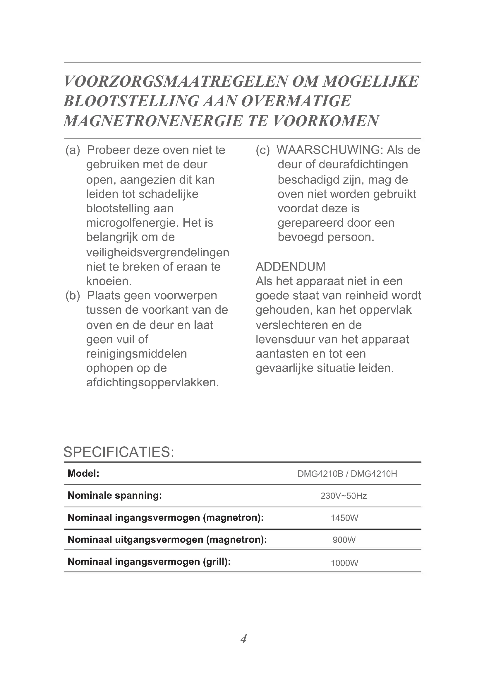 (a) Probeer deze oven niet te gebruiken met de deur open, aangezien dit kan leiden tot schadelijke blootstelling aan microgolfenergie. Het is belangrijk om de veiligheidsvergrendelingen niet te breken of eraan te knoeien. (b) Plaats geen voorwerpen tussen de voorkant van de oven en de deur en laat geen vuil of reinigingsmiddelen ophopen op de afdichtingsoppervlakken. (c) WAARSCHUWING: Als de deur of deurafdichtingen beschadigd zijn, mag de oven niet worden gebruikt voordat deze is gerepareerd door een bevoegd persoon. ADDENDUM Als het apparaat niet in een goede staat van reinheid wordt gehouden, kan het oppervlak verslechteren en de levensduur van het apparaat aantasten en tot een gevaarlijke situatie leiden. SPECIFICATIES: 230V~50Hz1450W 900W 1000W Model: Nominale spanning: Nominaal ingangsvermogen (magnetron): Nominaal uitgangsvermogen (magnetron): Nominaal ingangsvermogen (grill):