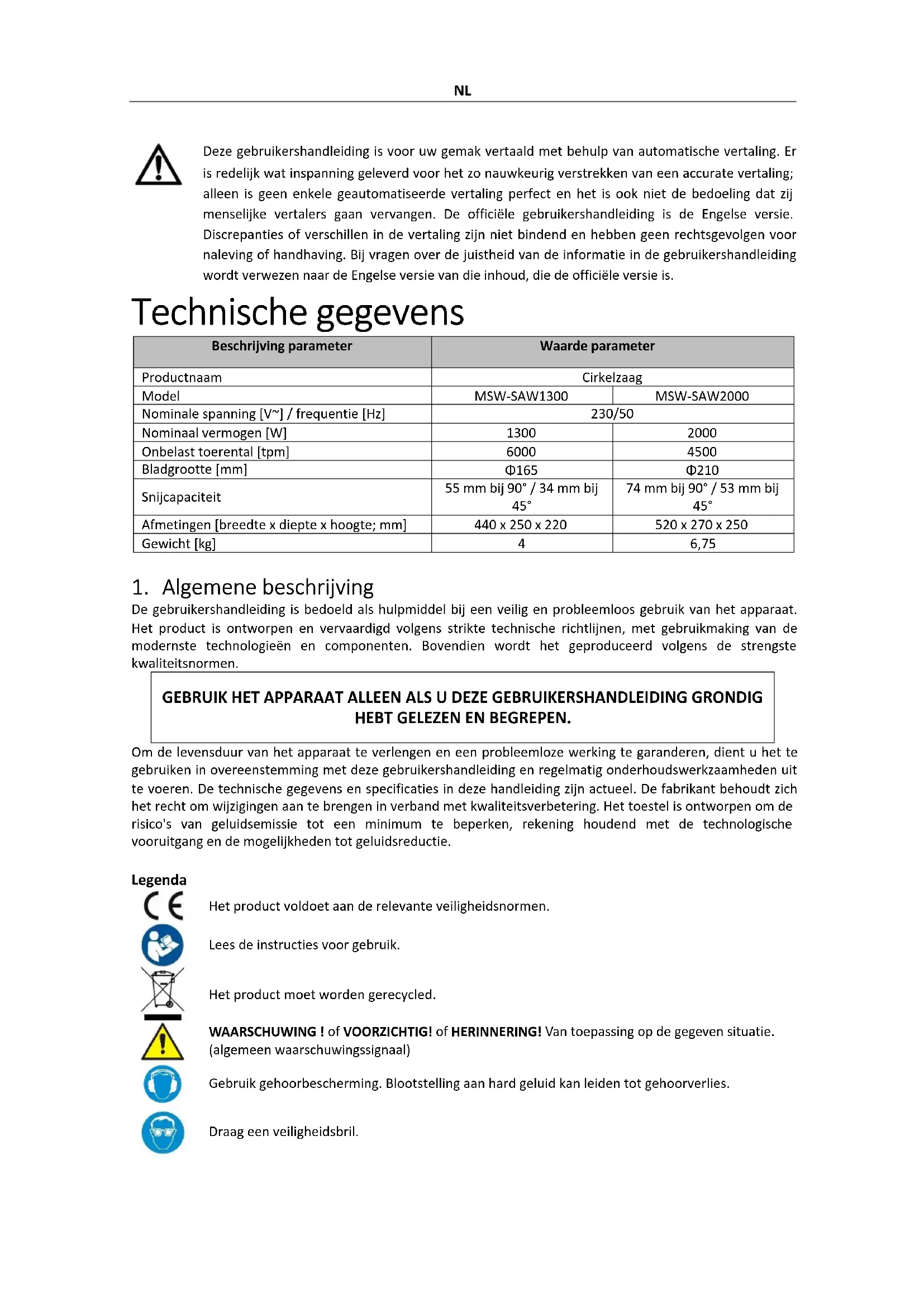 j) Gebruik voor het schoonmaken geen scherpe en/of metalen voorwerpen (bijv. een staalborstel of een metalen spatel) omdat deze het oppervlaktemateriaal van het apparaat kunnen beschadigen. k) Reinig het apparaat niet met een zure substantie, middelen voor medische doeleinden, verdunners, brandstof, olie of andere chemische stoffen, omdat dit het apparaat kan beschadigen. VERWIJDERING VAN GEBRUIKTE APPARATEN: Gooi dit apparaat niet in gemeentelijke afvalsystemen. Lever het in bij een recycling- en verzamelpunt voor elektrische apparaten. Controleer het symbool op het product, de gebruiksaanwijzing en de verpakking. De kunststoffen die voor de bouw van het apparaat zijn gebruikt, kunnen overeenkomstig hun markering worden gerecycleerd. Door te kiezen voor recycling levert u een belangrijke bijdrage aan de bescherming van het milieu. Neem contact op met plaatselijke autoriteiten voor informatie over plaatselijke recycling.NO Denne bruksanvisningen er oversatt ved hjelp av maskinoversettelse. Det er gjort rimelige anstrengelser for å gi en nøyaktig oversettelse, men ingen automatisk oversettelse er perfekt, og det er heller ikke meningen at den skal erstatte menneskelige oversettere. Den offisielle bruksanvisningen er den engelske versjonen. Eventuelle uoverensstemmelser eller forskjeller i oversettelsen er ikke bindende og har ingen juridisk virkning med hensyn til overholdelse eller håndhevelse. Hvis det oppstår spørsmål knyttet til nøyaktigheten av informasjonen i brukerhåndboken, henvises det til den engelske ver sjonen av innholdet, som er den offisielle versjonen. Tekniske data Beskrivelse av parameter Parameterverdi Produktnavn Handkreissäge Modell MSW-SAW1300 MSW-SAW2000 Nominell spenning [V~] / frekvens [Hz] 230/50 Nominell effekt [W]