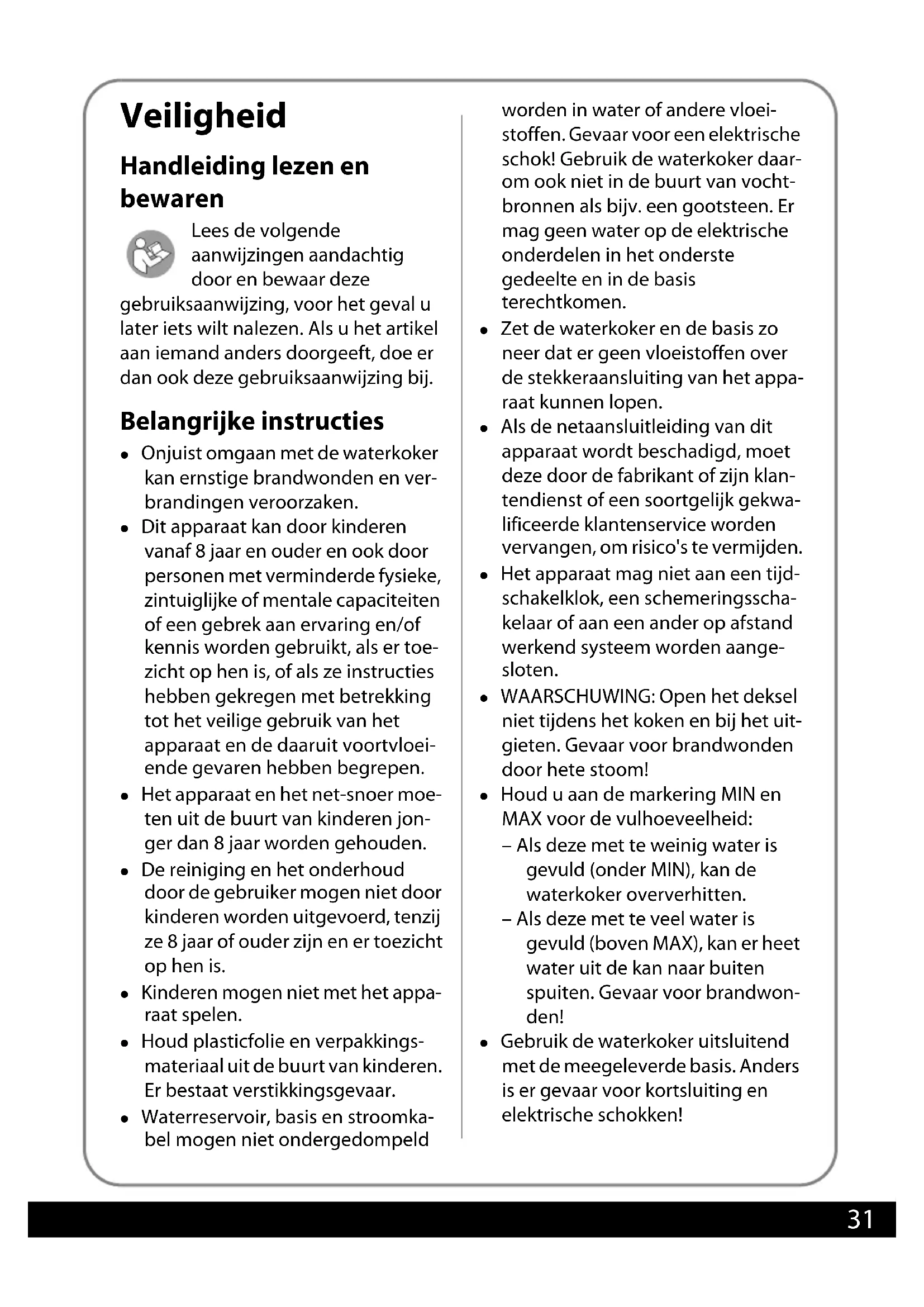 - (à partir de la date d’achat (conservez votre reçu)) Wasserkocher Print BEL Druckbuch.book Seite 29 Donnerstag, 14. November 2024 8:06 0830 Inhoud Veiligheid p. 31
