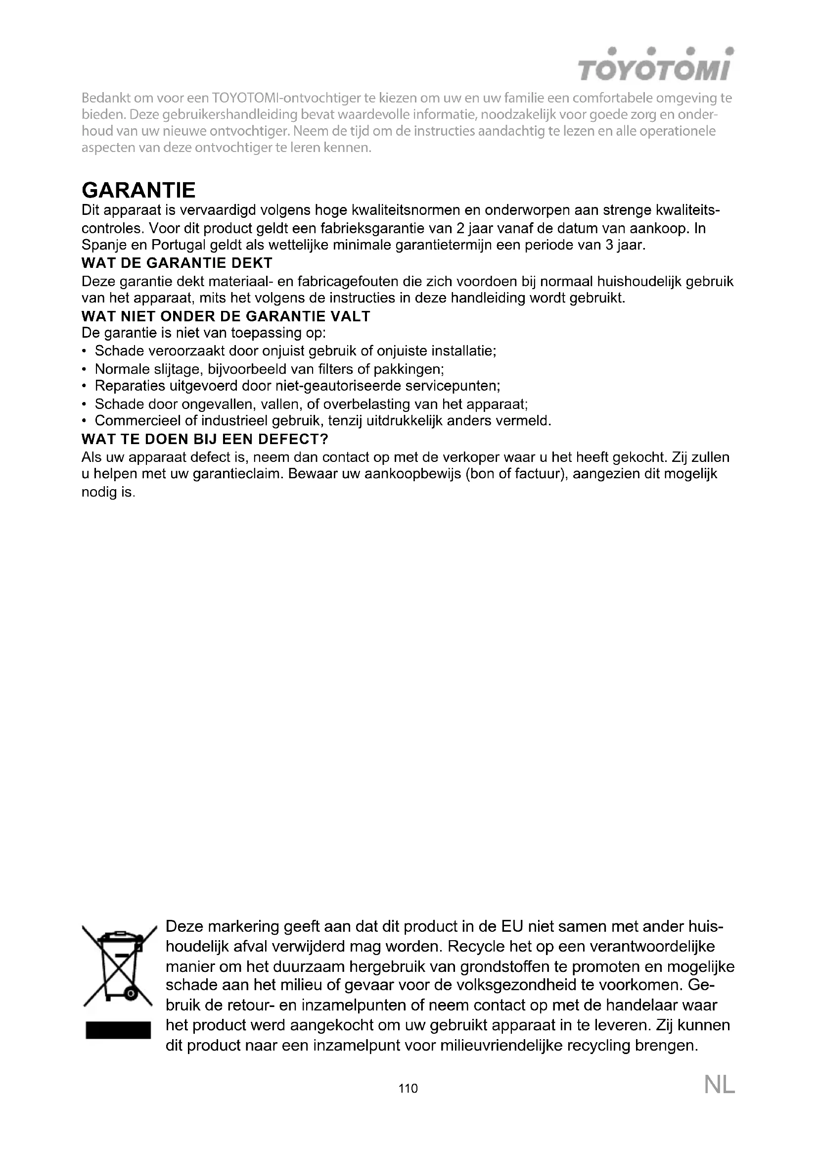 Bedankt om voor een TOYOTOMI-ontvochtiger te kiezen om uw en uw familie een comfortabele omgeving te bieden. Deze gebruikershandleiding bevat waardevolle informatie, noodzakelijk voor goede zorg en onder- houd van uw nieuwe ontvochtiger. Neem de tijd om de instructies aandachtig te lezen en alle operationele aspecten van deze ontvochtiger te leren kennen. GARANTIE Dit apparaat is vervaardigd volgens hoge kwaliteitsnormen en onderworpen aan strenge kwaliteits-controles. Voor dit product geldt een fabrieksgarantie van 2 jaar vanaf de datum van aankoop. In Spanje en Portugal geldt als wettelijke minimale garantietermijn een periode van 3 jaar.WAT DE GARANTIE DEKTDeze garantie dekt materiaal- en fabricagefouten die zich voordoen bij normaal huishoudelijk gebruik van het apparaat, mits het volgens de instructies in deze handleiding wordt gebruikt.WAT NIET ONDER DE GARANTIE VALTDe garantie is niet van toepassing op:• Schade veroorzaakt door onjuist gebruik of onjuiste installatie;• Normale slijtage, bijvoorbeeld van filters of pakkingen;• Reparaties uitgevoerd door niet-geautoriseerde servicepunten;• Schade door ongevallen, vallen, of overbelasting van het apparaat;• Commercieel of industrieel gebruik, tenzij uitdrukkelijk anders vermeld.WAT TE DOEN BIJ EEN DEFECT?Als uw apparaat defect is, neem dan contact op met de verkoper waar u het heeft gekocht. Zij zullen u helpen met uw garantieclaim. Bewaar uw aankoopbewijs (bon of factuur), aangezien dit mogelijk nodig is.