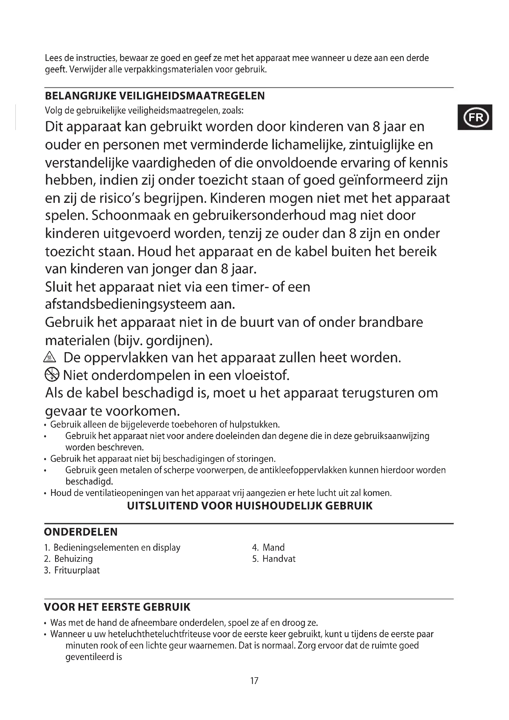 Afin d’éviter les problèmes occasionnés à l’environnement et à la santé par des substances dangereuses, les appareils et les batteries rechargeables et non rechargeables présentant l’un de ces symboles ne doivent pas être éliminés avec les déchets municipaux non triés. Éliminez dans tous les cas les produits électriques et électroniques et, le cas échéant, les batteries rechargeables et non rechargeables, dans un centre officiel et approprié de collecte/recyclage.17 Lees de instructies, bewaar ze goed en geef ze met het apparaat mee wanneer u deze aan een derde geeft. Verwijder alle verpakkingsmaterialen voor gebruik. BELANGRIJKE VEILIGHEIDSMAATREGELEN Volg de gebruikelijke veiligheidsmaatregelen, zoals: Dit apparaat kan gebruikt worden door kinderen van 8 jaar en ouder en personen met verminderde lichamelijke, zintuiglijke en verstandelijke vaardigheden of die onvoldoende ervaring of kennis hebben, indien zij onder toezicht staan of goed geïnformeerd zijn en zij de risico’s begrijpen. Kinderen mogen niet met het apparaat spelen. Schoonmaak en gebruikersonderhoud mag niet door kinderen uitgevoerd worden, tenzij ze ouder dan 8 zijn en onder toezicht staan. Houd het apparaat en de kabel buiten het bereik van kinderen van jonger dan 8 jaar. Sluit het apparaat niet via een timer- of een afstandsbedieningsysteem aan. Gebruik het apparaat niet in de buurt van of onder brandbare materialen (bijv. gordijnen). ¬ De oppervlakken van het apparaat zullen heet worden. i Niet onderdompelen in een vloeistof. Als de kabel beschadigd is, moet u het apparaat terugsturen om gevaar te voorkomen.