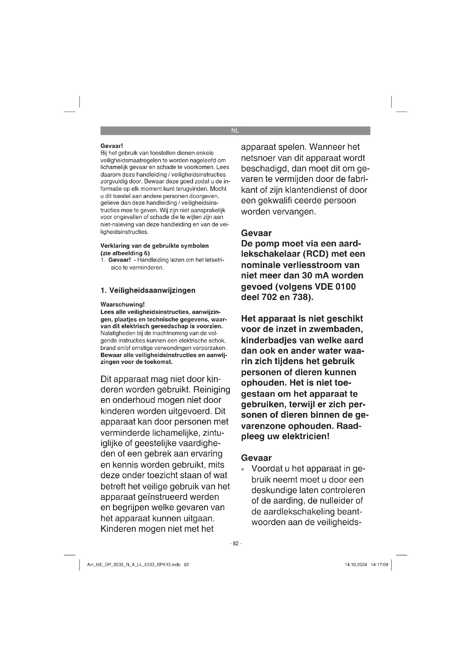 Het door u gekochte apparaat is bedoeld voor het verplaatsen van water met een maximale tempe- ratuur van 35°C. Het apparaat mag niet worden gebruikt voor andere vloeistoff en, vooral niet voor motorbrandstoff en, reinigingsmiddelen en andere chemische producten! Ga na of er eventueel speciale voorwaarden voor de installatie gelden, voordat u de pomp in bedrijf stelt! Wanneer bijv. door stroomonderbreking, vervui- ling of defecte afdichting materiële schade kan worden veroorzaakt, dan moeten extra veiligheid- sinrichtingen worden geïnstalleerd. Deze veiligheidsmaatregelen zijn bijvoorbeeld: parallel lopende pompen op een door een aparte Anl_GE_DP_8235_N_A_LL_ECO_SPK13.indb 83Anl_GE_DP_8235_N_A_LL_ECO_SPK13.indb 83 14.10.2024 14:17:1114.10.2024 14:17:11NL