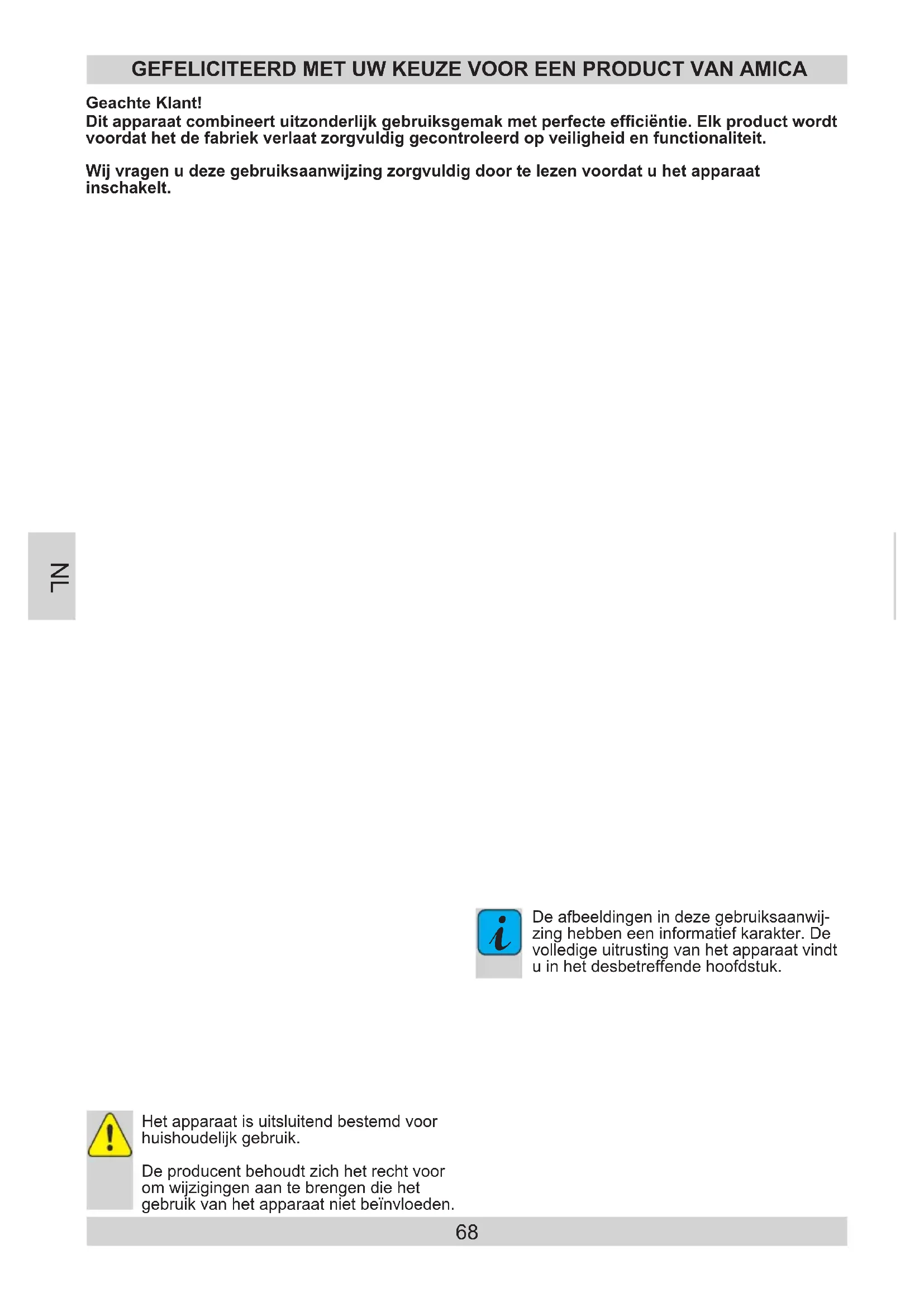 Garantie Le service de garantie est fonction de la carte de garantie. Le fabricant n’est pas responsable des dommages causés par une mauvaise manipulation du produit. FR68 Dit apparaat combineert uitzonderlijk gebruiksgemak met perfecte efciëntie. Elk product wordt voordat het de fabriek verlaat zorgvuldig gecontroleerd op veiligheid en functionaliteit. Wij vragen u deze gebruiksaanwijzing zorgvuldig door te lezen voordat u het apparaat inschakelt. Geachte Klant! GEFELICITEERD MET UW KEUZE VOOR EEN PRODUCT VAN AMICA Het apparaat is uitsluitend bestemd voor huishoudelijk gebruik. De producent behoudt zich het recht voor om wijzigingen aan te brengen die het gebruik van het apparaat niet beïnvloeden.