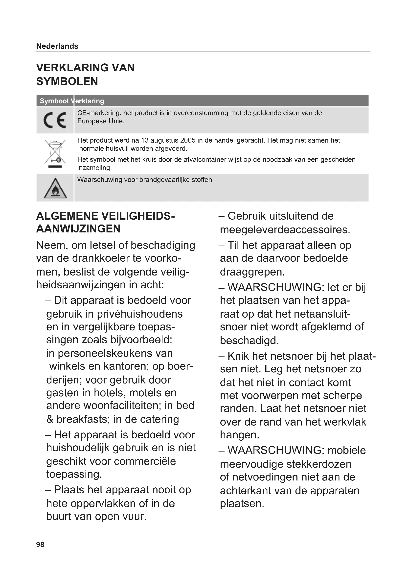 potrebbe essere fortemente ghiacciata. Avviare il processo di scongelamento tramite l'app. Il prerareddamento dura troppo a lungo In caso di temperature ambiente molto elevate, il tempo di prerareddamento può essere prolungato. Lo sportello emette un segnale acustico all'apertura Lo sportello deve essere aperto solo brevemente per inserire la bottiglia, altrimenti la temperatura nella camera di rareddamento aumenta.98 Nederlands VERKLARING VAN SYMBOLEN Symbool Verklaring CE-markering: het product is in overeenstemming met de geldende eisen van de Europese Unie. Het product werd na 13 augustus 2005 in de handel gebracht. Het mag niet samen het normale huisvuil worden afgevoerd. Het symbool met het kruis door de afvalcontainer wijst op de noodzaak van een gescheiden inzameling. Waarschuwing voor brandgevaarlijke stoen ALGEMENE VEILIGHEIDS- AANWIJZINGEN Neem, om letsel of beschadiging van de drankkoeler te voorko- men, beslist de volgende veilig- heidsaanwijzingen in acht: – Dit apparaat is bedoeld voor gebruik in privéhuishoudens en in vergelijkbare toepas- singen zoals bijvoorbeeld: in personeelskeukens van winkels en kantoren; op boer- derijen; voor gebruik door gasten in hotels, motels en andere woonfaciliteiten; in bed & breakfasts; in de catering – Het apparaat is bedoeld voor huishoudelijk gebruik en is niet geschikt voor commerciële toepassing. – Plaats het apparaat nooit op hete oppervlakken of in de buurt van open vuur. – Gebruik uitsluitend de meegeleverde accessoires. – Til het apparaat alleen op aan de daarvoor bedoelde draaggrepen. – WAARSCHUWING: let er bij het plaatsen van het appa- raat op dat het netaansluit- snoer niet wordt afgeklemd of beschadigd. – Knik het netsnoer bij het plaat- sen niet. Leg het netsnoer zo dat het niet in contact komt met voorwerpen met scherpe randen. Laat het netsnoer niet over de rand van het werkvlak hangen. – WAARSCHUWING: mobiele meervoudige stekkerdozen of netvoedingen niet aan de achterkant van de apparaten plaatsen.99 – WAARSCHUWING: ventilatie- openingen in de behuizing van het apparaat of in de inbouw- behuizing niet afsluiten. – Zorg bij de plaatsing voor een voldoende afstand van ca. 5 cm tot de omringende muren of andere begrenzingen. – Gebruikt het apparaat pas als het veilig is opgesteld. Na transport moet het apparaat minstens 12 uur onafgebroken op één plaats staan, voordat het in bedrijf wordt gesteld. – Vervoer het apparaat nooit in liggende positie! Het appa- raat moet altijd rechtop staan, ook als het niet werkt, omdat anders het koelcircuit schade kan oplopen. – Open nooit het onderste deel van het apparaat waarin zich het koelcircuit bevindt. – Dit apparaat kan worden gebruikt door kinderen vanaf 8 jaar en door personen met verminderde fysieke, sensori- sche of geestelijke vermogens of met gebrek aan ervaring en/ of kennis, wanneer ze onder toezicht staan of zijn onder- wezen in het veilig gebruik van het apparaat en begrijpen welke gevaren daarbij kunnen optreden. – Kinderen mogen niet met het apparaat spelen. – Kinderen van 3 tot 8 jaar mogen het apparaat laden en lossen, maar moeten weg worden gehouden van het aansluitsnoer. – Reiniging en gebruikerson- derhoud mogen niet worden uitgevoerd door kinderen, tenzij ze ouder dan 8 jaar zijn en onder toezicht staan. – De BEEZER