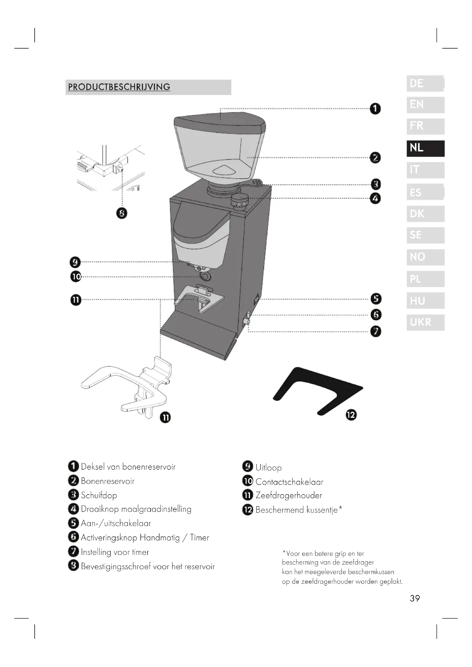 *Voor een betere grip en ter bescherming van de zeefdrager kan het meegeleverde beschermkussen op de zeefdragerhouder worden geplakt.40 VOORWOORD Geachte klant, met de aankoop van deze koffiemolen hebt u een goede keuze gemaakt. U hebt een erkend kwaliteitsproduct aangekocht. Wij danken voor uw aankoop en wensen u veel plezier met uw nieuwe Graef koffiemolen.