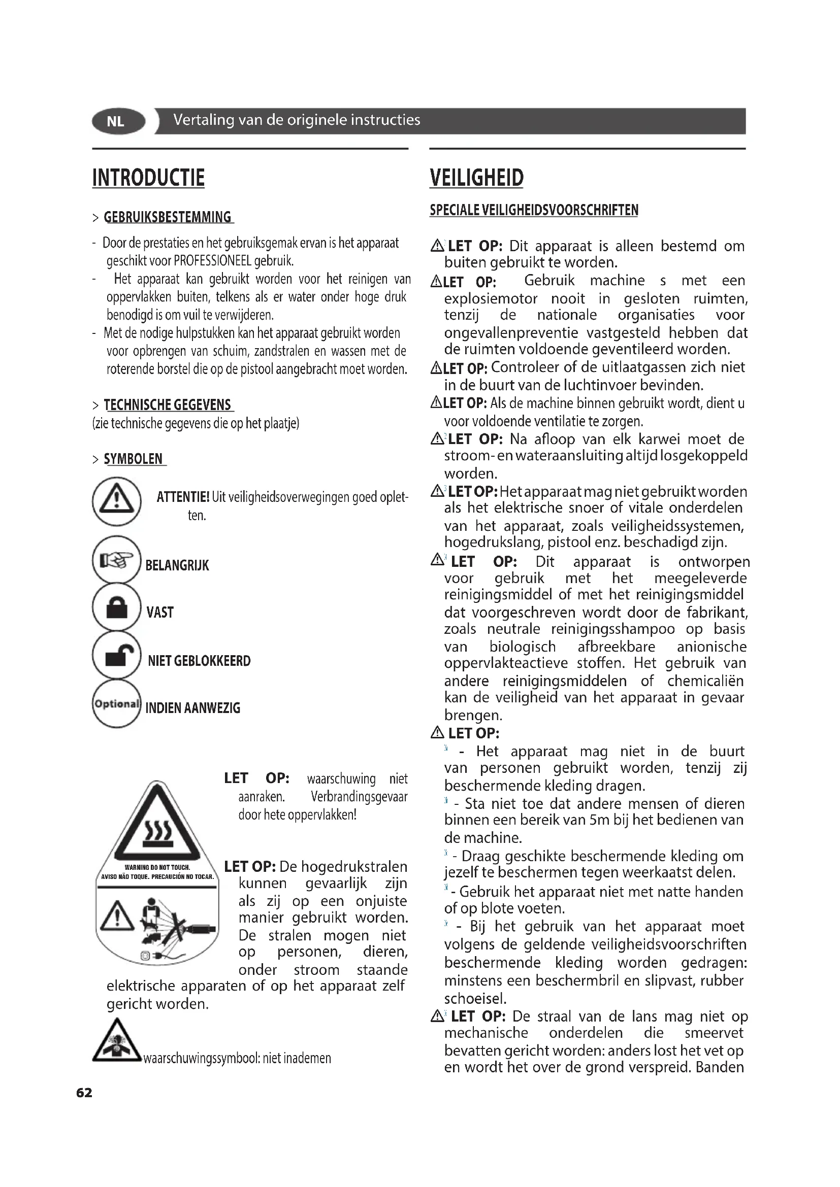 61INTRODUCTIE > GEBRUIKSBESTEMMING - Door de prestaties en het gebruiksgemak ervan is het apparaat geschikt voor PROFESSIONEEL gebruik. - Het apparaat kan gebruikt worden voor het reinigen van oppervlakken buiten, telkens als er water onder hoge druk benodigd is om vuil te verwijderen. - Met de nodige hulpstukken kan het apparaat gebruikt worden voor opbrengen van schuim, zandstralen en wassen met de roterende borstel die op de pistool aangebracht moet worden. > TECHNISCHE GEGEVENS (zie technische gegevens die op het plaatje) > SYMBOLEN ATTENTIE! Uit veiligheidsoverwegingen goed oplet- ten. BELANGRIJK VAST NIET GEBLOKKEERD INDIEN AANWEZIG WARNING DO NOT TOUCH.AVISO NÃO TOQUE. PRECAUCIÓN NO TOCAR. LET OP: waarschuwing niet aanraken. Verbrandingsgevaar door hete oppervlakken! LET OP: De hogedrukstralen kunnen gevaarlijk zijn als zij op een onjuiste manier gebruikt worden. De stralen mogen niet op personen, dieren, onder stroom staande elektrische apparaten of op het apparaat zelf gericht worden. waarschuwingssymbool: niet inademen VEILIGHEID SPECIALE VEILIGHEIDSVOORSCHRIFTEN