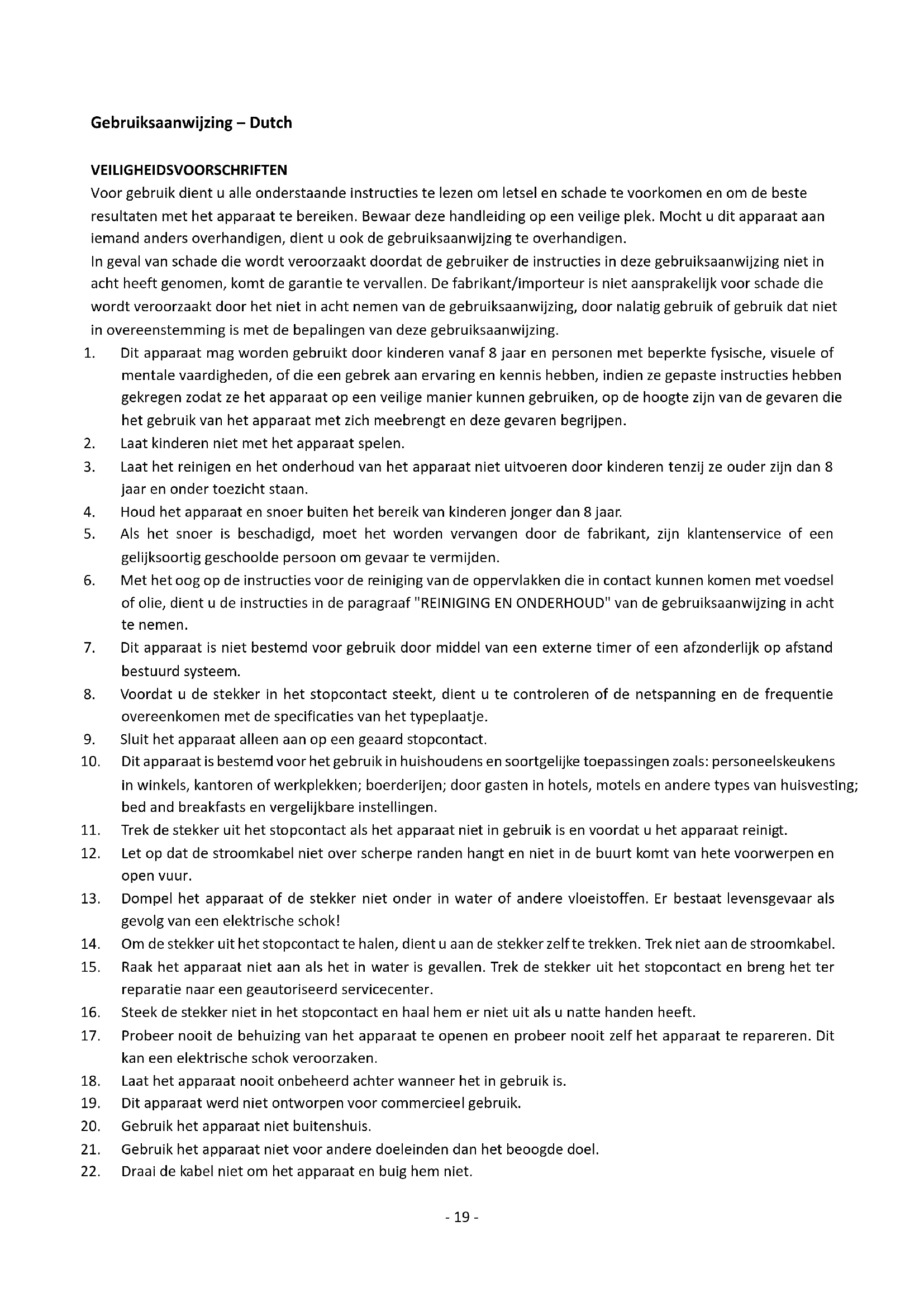 18. Laat het apparaat nooit onbeheerd achter wanneer het in gebruik is.