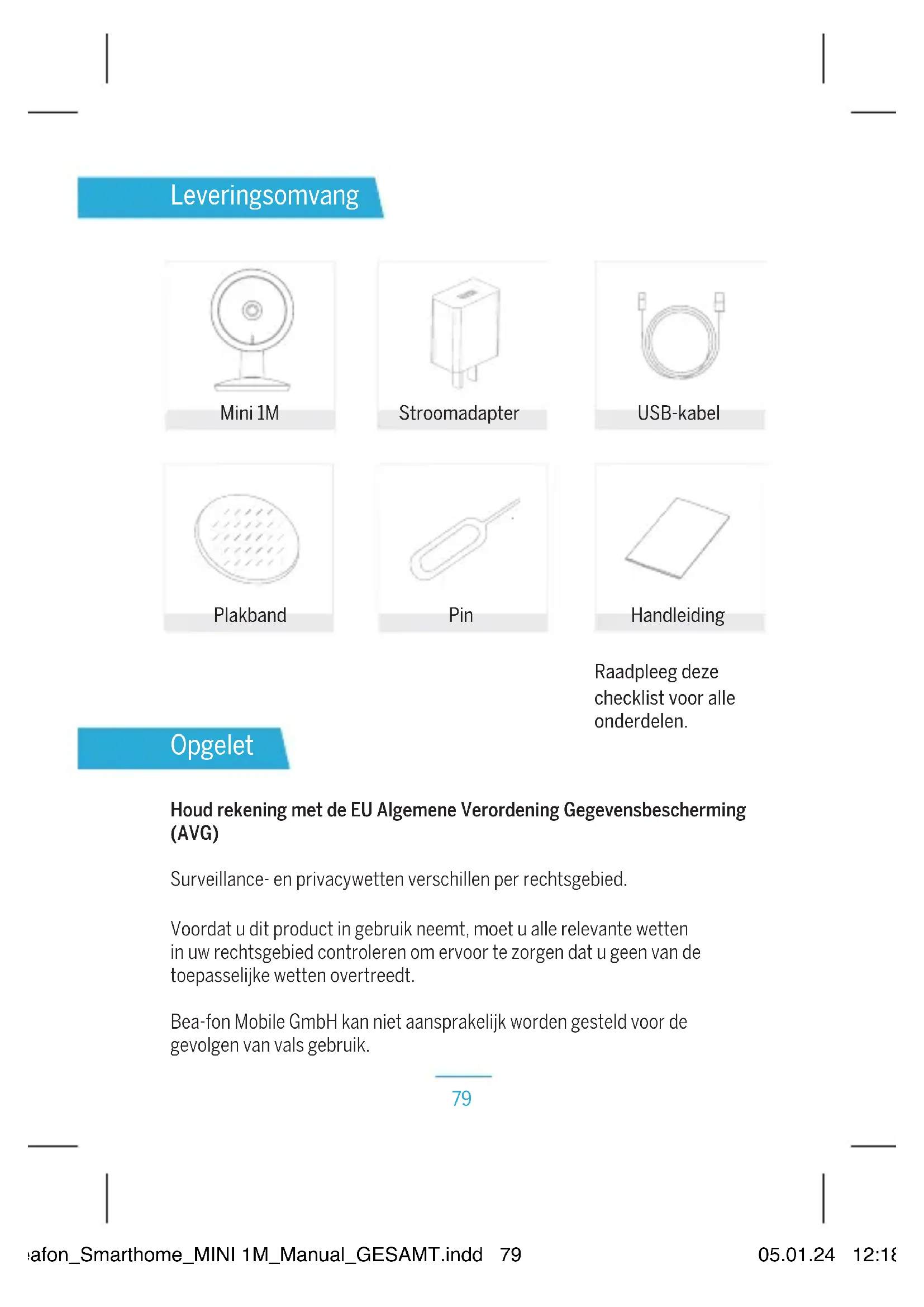Reinhard Handlgruber, COO Peuerbach, 20.11.2023 beafon_Smarthome_MINI 1M_Manual_GESAMT.indd 77beafon_Smarthome_MINI 1M_Manual_GESAMT.indd 77 05.01.24 12:1805.01.24 12:18Smart H me Handleiding MINI1M beafon_Smarthome_MINI 1M_Manual_GESAMT.indd 78beafon_Smarthome_MINI 1M_Manual_GESAMT.indd 78 05.01.24 12:1805.01.24 12:1879 Leveringsomvang Mini 1M Plakband Raadpleeg deze checklist voor alle onderdelen. Stroomadapter Handleiding USB-kabel Opgelet Houd rekening met de EU Algemene Verordening Gegevensbescherming (AVG) Surveillance- en privacywetten verschillen per rechtsgebied. Voordat u dit product in gebruik neemt, moet u alle relevante wetten in uw rechtsgebied controleren om ervoor te zorgen dat u geen van de toepasselijke wetten overtreedt. Bea-fon Mobile GmbH kan niet aansprakelijk worden gesteld voor de gevolgen van vals gebruik. Pin beafon_Smarthome_MINI 1M_Manual_GESAMT.indd 79beafon_Smarthome_MINI 1M_Manual_GESAMT.indd 79 05.01.24 12:1805.01.24 12:1880 Beschrijving Voedingspoort DC 5V +- 10% Statuslampje • Constant rood lampje: de camera is bezig met inschakelen of defect