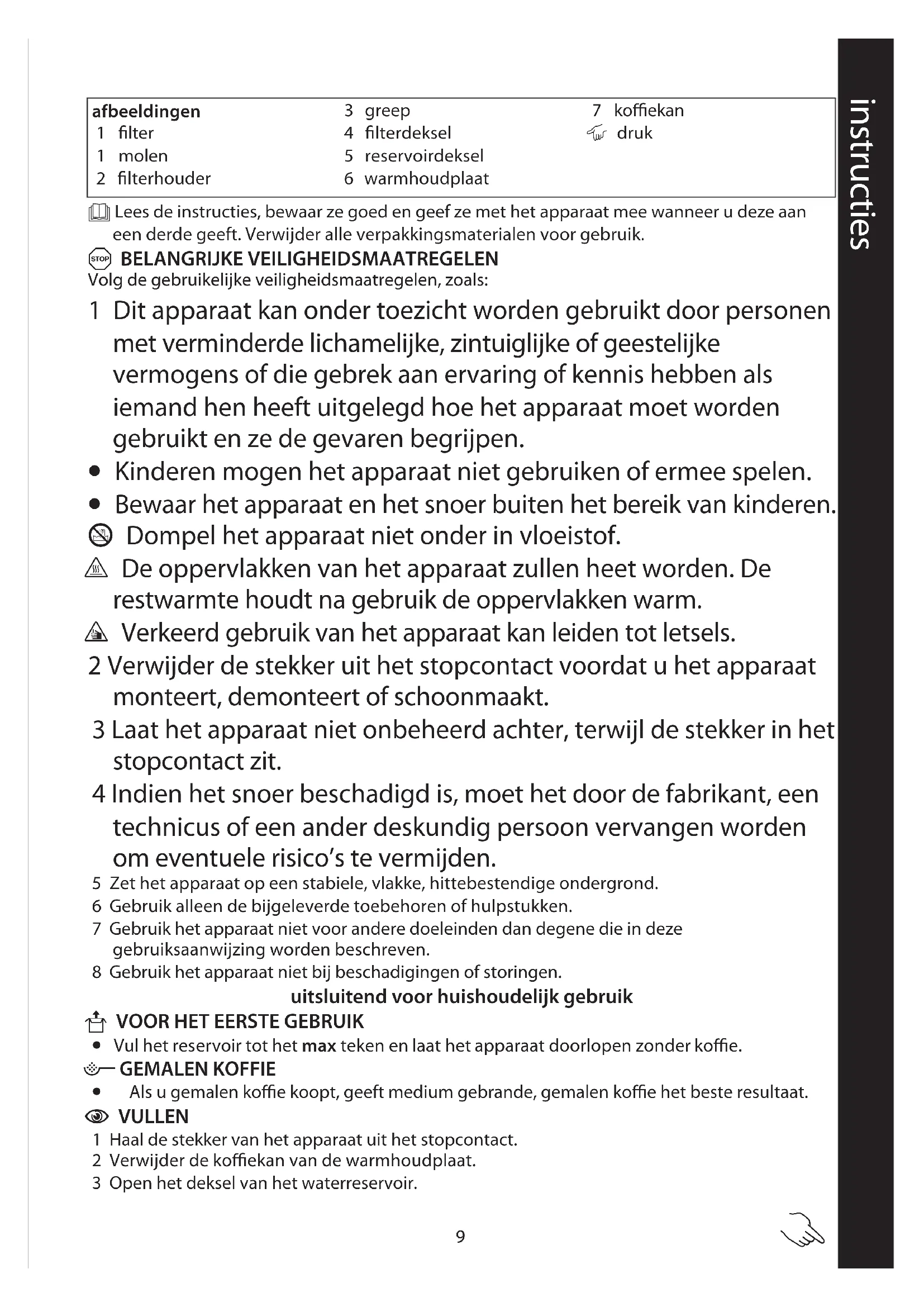 - Als u gemalen koffie koopt, geeft medium gebrande, gemalen koffie het beste resultaat. C VULLEN 1 Haal de stekker van het apparaat uit het stopcontact. 2 Verwijder de koffiekan van de warmhoudplaat. 3 Open het deksel van het waterreservoir. instructies afbeeldingen 1 filter 1 molen 2 filterhouder 3 greep 4 filterdeksel 5 reservoirdeksel 6 warmhoudplaat 7 koffiekan | druk10 4 Vul het waterreservoir met de exacte hoeveelheid water. a) Gebruik minstens 2 kopjes water als u gemalen koffie gebruikt. b) Gebruik minstens 4 kopjes water als u koffiebonen gebruikt. c) Vul het apparaat niet boven de max-markering. 5 Sluit het deksel van het waterreservoir. 6 Druk de greep in het uiteinde van het filterdeksel en open het helemaal. 7 Doe de exacte hoeveelheid koffie in de filter. a) Gebruik 1 afgestreken eetlepel gemalen koffie per kopje. b) Gebruik 1 volle eetlepel koffiebonen per kopje. c) Het aantal eetlepels koffie moet overkomen met het aantal kopjes water. 8 Sluit het filterdeksel en druk omlaag om de greep te vergrendelen. C AANZETTEN 9 Plaats de koffiekan op de warmhoudplaat. 10 Steek de stekker in het stopcontact.
