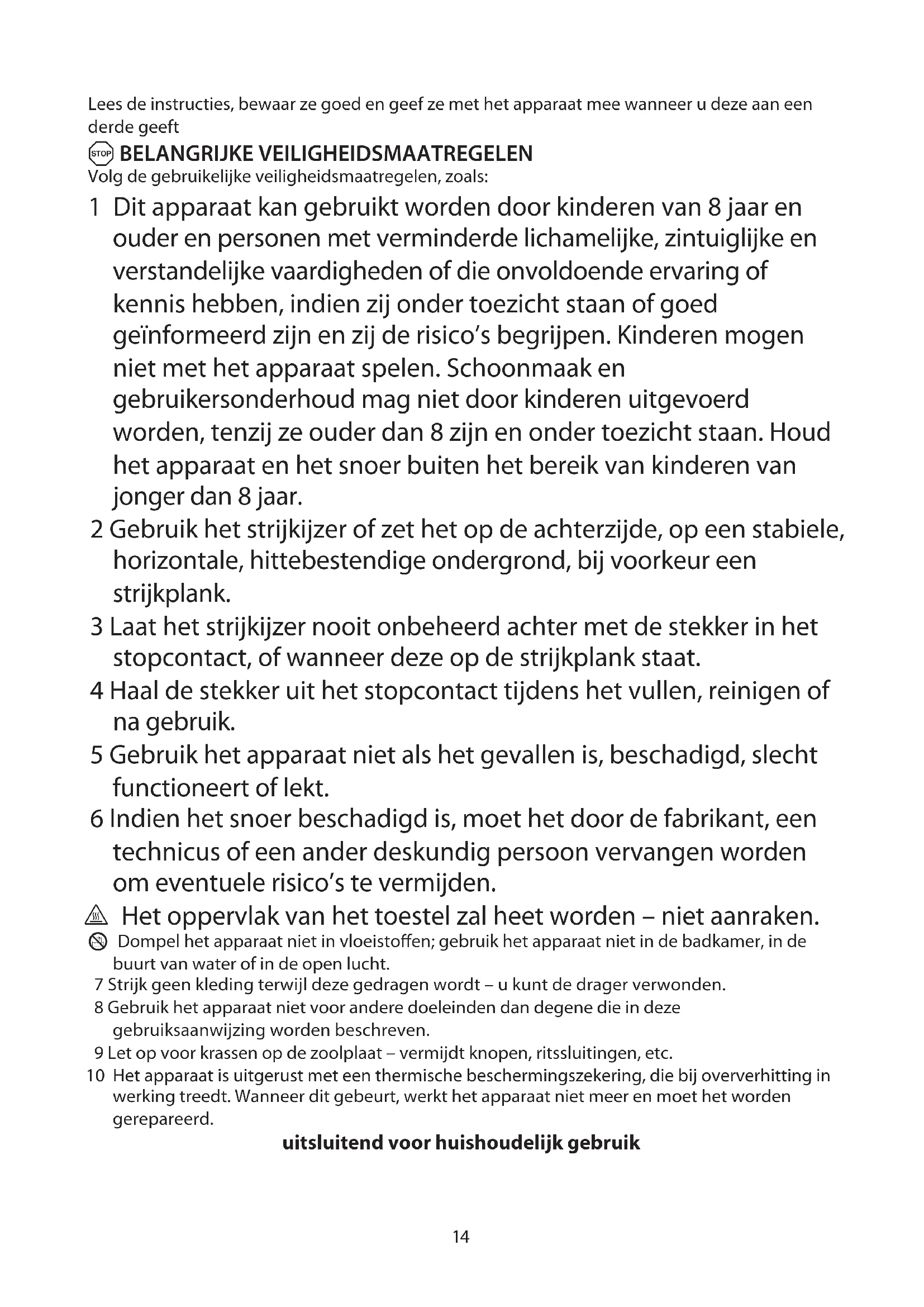 Volg de gebruikelijke veiligheidsmaatregelen, zoals: 1 Dit apparaat kan gebruikt worden door kinderen van 8 jaar en ouder en personen met verminderde lichamelijke, zintuiglijke en verstandelijke vaardigheden of die onvoldoende ervaring of kennis hebben, indien zij onder toezicht staan of goed geïnformeerd zijn en zij de risico’s begrijpen. Kinderen mogen niet met het apparaat spelen. Schoonmaak en gebruikersonderhoud mag niet door kinderen uitgevoerd worden, tenzij ze ouder dan 8 zijn en onder toezicht staan. Houd het apparaat en het snoer buiten het bereik van kinderen van jonger dan 8 jaar. 2 Gebruik het strijkijzer of zet het op de achterzijde, op een stabiele, horizontale, hittebestendige ondergrond, bij voorkeur een strijkplank. 3 Laat het strijkijzer nooit onbeheerd achter met de stekker in het stopcontact, of wanneer deze op de strijkplank staat. 4 Haal de stekker uit het stopcontact tijdens het vullen, reinigen of na gebruik. 5 Gebruik het apparaat niet als het gevallen is, beschadigd, slecht functioneert of lekt. 6 Indien het snoer beschadigd is, moet het door de fabrikant, een technicus of een ander deskundig persoon vervangen worden om eventuele risico’s te vermijden. ¬ Het oppervlak van het toestel zal heet worden – niet aanraken. H Dompel het apparaat niet in vloeistoffen; gebruik het apparaat niet in de badkamer, in de buurt van water of in de open lucht. 7 Strijk geen kleding terwijl deze gedragen wordt – u kunt de drager verwonden. 8 Gebruik het apparaat niet voor andere doeleinden dan degene die in deze gebruiksaanwijzing worden beschreven. 9 Let op voor krassen op de zoolplaat – vermijdt knopen, ritssluitingen, etc. 10 Het apparaat is uitgerust met een thermische beschermingszekering, die bij oververhitting in werking treedt. Wanneer dit gebeurt, werkt het apparaat niet meer en moet het worden gerepareerd. uitsluitend voor huishoudelijk gebruik15