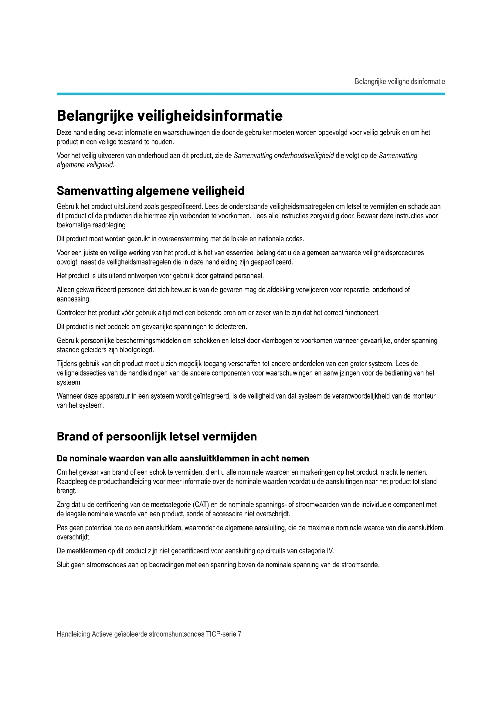 - IAR Systems name may not be used to endorse or promote products derived from this software without specific prior written permission. THE SOFTWARE IS PROVIDED "AS IS" AND THE AUTHOR DISCLAIMS ALL WARRANTIES WITH REGARD TO THIS SOFTWARE INCLUDING ALL IMPLIED WARRANTIES OF MERCHANTABILITY AND FITNESS. IN NO EVENT SHALL THE AUTHOR BE LIABLE FOR ANY SPECIAL, DIRECT, INDIRECT, OR CONSEQUENTIAL DAMAGES OR ANY DAMAGES WHATSOEVER RESULTING FROM LOSS OF USE, DATA OR PROFITS, WHETHER IN AN ACTION OF CONTRACT, NEGLIGENCE OR OTHER TORTIOUS ACTION, ARISING OUT OF OR IN CONNECTION WITH THE USE OR PERFORMANCE OF THIS SOFTWARE. Third Party Software Licenses 6Belangrke veiligheidsinformatie Deze handleiding bevat informatie en waarschuwingen die door de gebruiker moeten worden opgevolgd voor veilig gebruik en om het product in een veilige toestand te houden. Voor het veilig uitvoeren van onderhoud aan dit product, zie de Samenvatting onderhoudsveiligheid die volgt op de Samenvatting algemene veiligheid. Samenvatting algemene veiligheid Gebruik het product uitsluitend zoals gespecificeerd. Lees de onderstaande veiligheidsmaatregelen om letsel te vermijden en schade aan dit product of de producten die hiermee zijn verbonden te voorkomen. Lees alle instructies zorgvuldig door. Bewaar deze instructies voor toekomstige raadpleging. Dit product moet worden gebruikt in overeenstemming met de lokale en nationale codes. Voor een juiste en veilige werking van het product is het van essentieel belang dat u de algemeen aanvaarde veiligheidsprocedures opvolgt, naast de veiligheidsmaatregelen die in deze handleiding zijn gespecificeerd. Het product is uitsluitend ontworpen voor gebruik door getraind personeel. Alleen gekwalificeerd personeel dat zich bewust is van de gevaren mag de afdekking verwijderen voor reparatie, onderhoud of aanpassing. Controleer het product vóór gebruik altijd met een bekende bron om er zeker van te zijn dat het correct functioneert. Dit product is niet bedoeld om gevaarlijke spanningen te detecteren. Gebruik persoonlijke beschermingsmiddelen om schokken en letsel door vlambogen te voorkomen wanneer gevaarlijke, onder spanning staande geleiders zijn blootgelegd. Tijdens gebruik van dit product moet u zich mogelijk toegang verschaffen tot andere onderdelen van een groter systeem. Lees de veiligheidssecties van de handleidingen van de andere componenten voor waarschuwingen en aanwijzingen voor de bediening van het systeem. Wanneer deze apparatuur in een systeem wordt geïntegreerd, is de veiligheid van dat systeem de verantwoordelijkheid van de monteur van het systeem. Brand of persoonlk letsel vermden De nominale waarden van alle aansluitklemmen in acht nemen Om het gevaar van brand of een schok te vermijden, dient u alle nominale waarden en markeringen op het product in acht te nemen. Raadpleeg de producthandleiding voor meer informatie over de nominale waarden voordat u de aansluitingen naar het product tot stand brengt. Zorg dat u de certificering van de meetcategorie (CAT) en de nominale spannings- of stroomwaarden van de individuele component met de laagste nominale waarde van een product, sonde of accessoire niet overschrijdt. Pas geen potentiaal toe op een aansluitklem, waaronder de algemene aansluiting, die de maximale nominale waarde van die aansluitklem overschrijdt. De meetklemmen op dit product zijn niet gecertificeerd voor aansluiting op circuits van categorie IV. Sluit geen stroomsondes aan op bedradingen met een spanning boven de nominale spanning van de stroomsonde. Belangrijke veiligheidsinformatie Handleiding Actieve geïsoleerde stroomshuntsondes TICP-serie 7Niet bedienen zonder afdekkingen Bedien dit product niet als de afdekkingen of panelen zijn verwijderd, of wanneer de behuizing is geopend. Blootstelling aan gevaarlijke spanning is mogelijk. Blootgelegde circuits vermden Raak de blootgelegde aansluitingen en componenten niet aan wanneer er netspanning aanwezig is. Niet bedienen met vermoede storingen Als u vermoedt dat dit product beschadigd is, laat het inspecteren door gekwalificeerd onderhoudspersoneel. Schakel het product uit als het beschadigd is. Gebruik het product niet als het beschadigd is of incorrect functioneert. Als u twijfelt over de veiligheid van het product, schakel het dan uit. Breng een duidelijke markering aan op het product om verder gebruik te voorkomen. Inspecteer vóór gebruik de spanningssondes, testkabels en accessoires op mechanische schade en vervang ze wanneer deze beschadigd zijn. Gebruik de sondes of testkabels niet als deze beschadigd zijn, als er blootgelegd metaal zichtbaar is of als er tekenen van slijtage aanwezig zijn. Inspecteer de buitenkant van het product voordat u het gaat gebruiken. Controleer op scheuren of ontbrekende onderdelen. Gebruik alleen gespecificeerde vervangingsonderdelen. Niet bedienen in natte/vochtige omstandigheden Houd er rekening mee dat condensatie kan optreden wanneer een unit van een koude naar een warme omgeving wordt verplaatst. Niet bedienen in een explosieve atmosfeer Productoppervlakken schoon en droog houden Verwijderd de ingangssignalen voordat u het product reinigt. Vermijd het gebruik van chemische producten bij de sonde en sondetips, omdat dergelijke producten tijdelijke of permanente schade kunnen veroorzaken en de goede werking van de sonde kunnen aantasten. Voor de reiniging wordt het gebruik van perslucht aangeraden. Een veilige werkomgeving bieden Plaats het product altijd op een locatie die geschikt is voor het aflezen van het display en de indicatoren. Vermijd onjuist of langdurig gebruik van toetsenborden, pointers en toetsen. Onjuist of langdurig gebruik van een toetsenbord of pointer kan leiden tot ernstig letsel. Zorg dat uw werkgebied voldoet aan de toepasselijke ergonomische normen. Raadpleeg een professional op het gebied van ergonomie om stressgerelateerd letsel te vermijden. Sondes en testkabels Attentie: Houd de sondedraad zo ver mogelijk uit de buurt van de tip en de hoogspa