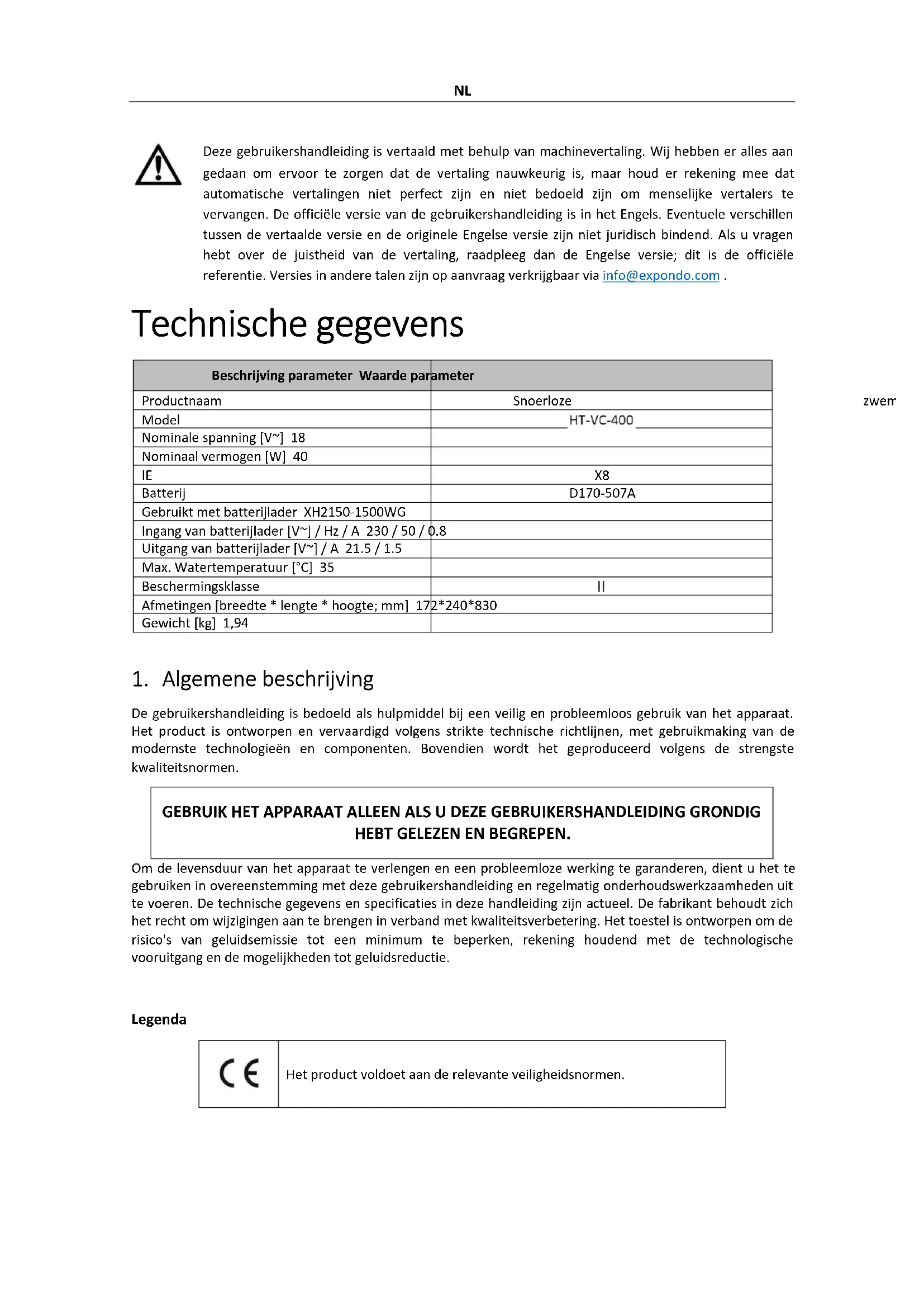 Afvoeren van gebruikte apparaten Gooi dit apparaat niet in gemeentelijke afvalsystemen. Lever het in bij een recycling- en verzamelpunt voor elektrische apparaten. Controleer het symbool op het product, de gebruiksaanwijzing en de verpakking. De kunststoffen die voor de productie van het apparaat zijn gebruikt, kunnen volgens de markeringen worden gerecycled. Door te kiezen voor recycling levert u een belangrijke bijdrage aan de bescherming van het milieu.NL Neem contact op met plaatselijke autoriteiten voor informatie over plaatselijke recycling. 2.5. Problemen oplossen In de meeste gevallen kunt u de problemen eenvoudig zelf oplossen. Probleem Mogelijke oorzaak Oplossing Het afval niet opruimen. De batterij is leeg. Laad het product op en het kan 50-60 minuten werken nadat het volledig is opgeladen. Het waaier is beschadigd. Repareer of vervang de waaier. Het waaier is geblokkeerd. Schakel het product uit en controleer de waaier. De filterzak is vol. Maak het afval in de filterzak schoon. Afval wordt via de voorkant afgevoerd. Controleer of de klep beschadigd is. Vervang het terugslagventiel. Afvalstoffen worden uit het filternet verwijderd. Het filternet is beschadigd. Vervang het filternet. De handgreep/verlengstok kan niet worden aangesloten. Het verbindende V-snoer is beschadigd. Vervang het V-snoer. Het product kan niet worden opgeladen. De batterij is beschadigd. Neem contact op met de dealer om de batterij te vervangen. Waarschuwing! Om schade aan de stofzuiger te voorkomen, raden wij u aan de originele lithiumbatterij te vervangen. De oplader is beschadigd. Vervang de oplader. Waarschuwing! Om te voorkomen dat het product beschadigd raakt door de oplader, raden wij u aan om de originele oplader te kopen ter vervanging.NO Denne brukerhåndboken er oversatt ved hjelp av maskinoversettelse. Vi har gjort vårt ytterste for å sikre at oversettelsen er nøyaktig, men vær oppmerksom på at automatiserte oversettelser ikke er perfekte og ikke er ment å erstatte menneskelige oversettere. Den offisielle versjonen av brukerhåndboken er på engelsk. Eventuelle forskjeller mellom den oversatte versjonen og den originale engelske versjonen er ikke juridisk bindende. Hvis du har spørsmål om nøyaktigheten av oversettelsen, vennligst se den engelske versjonen, som er den offisielle referansen. Flere språkversjoner er tilgjengelig på forespørsel via info@expondo.com . Tekniske data Beskrivelse av parameter Parameterverdi Produktnavn Trådløs bassengstøvsuger Modell Nominell spenning [V~] 18 Nominell effekt [W] 40 IP X8 Batteri D170-507A Brukes med batterilader XH2150-1500WG Inngang for batterilader [V~] / Hz / A 230 / 50 / 0.8 Utgang fra batterilader [V~] / A 21.5 / 1.5 Maks. Vanntemperatur [°C] 35 Beskyttelsesklasse Dimensjoner [bredde * lengde * høyde; mm] 172*240*830 Vekt [kg] 1.94