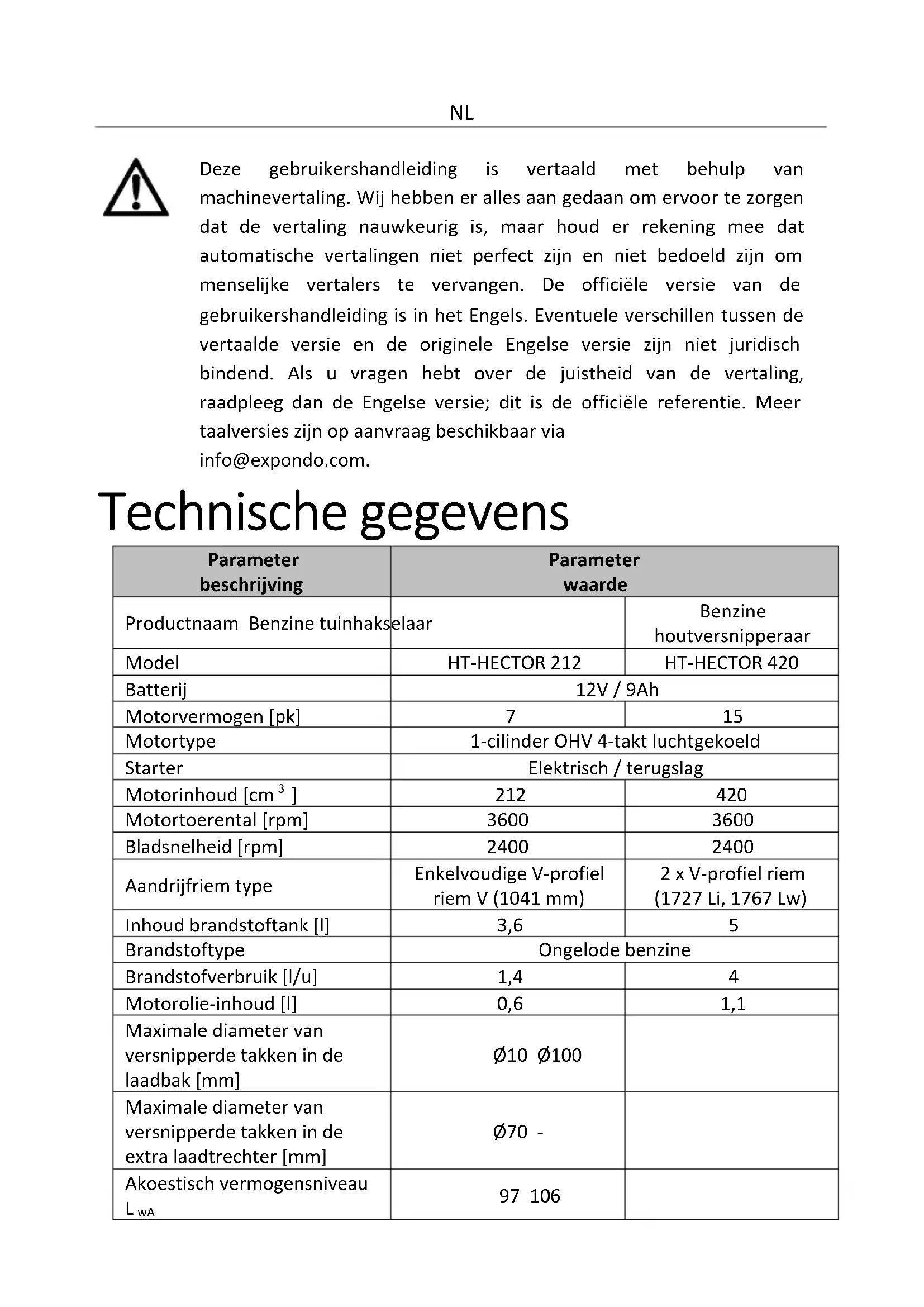 Deze gebruikershandleiding is vertaald met behulp van machinevertaling. Wij hebben er alles aan gedaan om ervoor te zorgen dat de vertaling nauwkeurig is, maar houd er rekening mee dat automatische vertalingen niet perfect zijn en niet bedoeld zijn om menselijke vertalers te vervangen. De officiële versie van de gebruikershandleiding is in het Engels. Eventuele verschillen tussen de vertaalde versie en de originele Engelse versie zijn niet juridisch bindend. Als u vragen hebt over de juistheid van de vertaling, raadpleeg dan de Engelse versie; dit is de officiële referentie. Meer taalversies zijn op aanvraag beschikbaar via info@expondo.com. Technische gegevens Parameter beschrijving Parameter waarde Productnaam Benzine tuinhakselaar Benzine houtversnipperaar Model HT-HECTOR 212 HT-HECTOR 420 Batterij 12V / 9Ah Motorvermogen [pk]