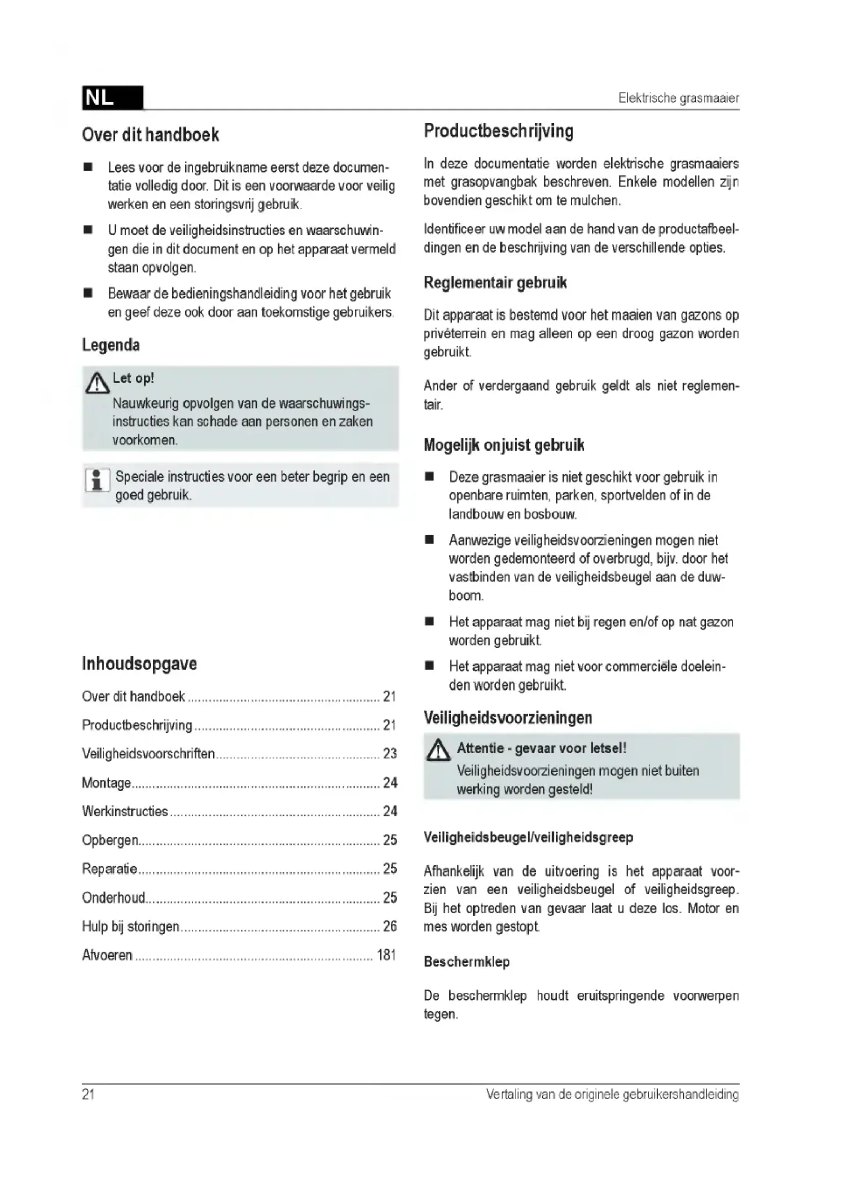 - Afvoeren Productbeschrijving In deze documentatie worden elektrische grasmaaiers met grasopvangbak beschreven. Enkele modellen zijn bovendien geschikt om te mulchen. Identificeer uw model aan de hand van de productafbeel- dingen en de beschrijving van de verschillende opties. Reglementair gebruik Dit apparaat is bestemd voor het maaien van gazons op priveterrein en mag alleen op een droog gazon worden gebruikt. Ander of verdergaand gebruik geldt als niet reglemen- tair. Mogelijk onjuist gebruik ■ Deze grasmaaier is niet geschikt voor gebruik in openbare ruimten, parken, sportvelden of in de landbouw en bosbouw. ■ Aanwezige veiligheidsvoorzieningen mogen niet worden gedemonteerd of overbrugd, bijv. door het vastbinden van de veiligheidsbeugel aan de duw- boom. ■ Het apparaat mag niet bij regen en/of op nat gazon worden gebruikt. ■ Het apparaat mag niet voor commerciele doelein- den worden gebruikt. Veiligheidsvoorzieningen ^ Attentie - gevaar voor letsel! Veiligheidsvoorzieningen mogen niet buiten werking worden gesteld! Veiligheidsbeugel/veiligheidsgreep Afhankelijk van de uitvoering is het apparaat voor- zien van een veiligheidsbeugel of veiligheidsgreep. Bij het optreden van gevaar laat u deze los. Motor en mes worden gestopt. Beschermklep De beschermklep houdt eruitspringende voorwerpen tegen. Let op! Nauwkeurig opvolgen van de waarschuwings- instructies kan schade aan personen en zaken voorkomen. J Speciale instructies voor een beter begrip en een goed gebruik. p. 181