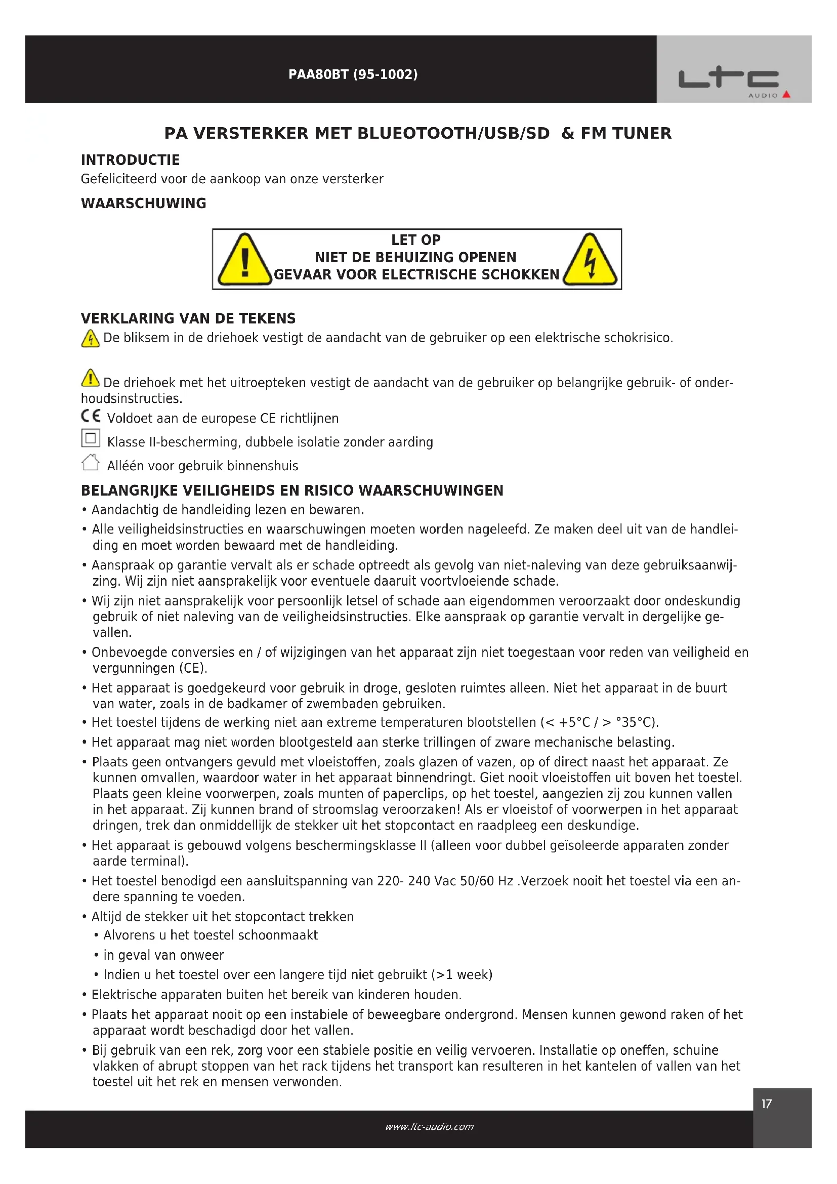 www.ltc-audio.com PA VERSTERKER MET BLUEOTOOTH/USB/SD & FM TUNER INTRODUCTIE Gefeliciteerd voor de aankoop van onze versterker WAARSCHUWING LET OP