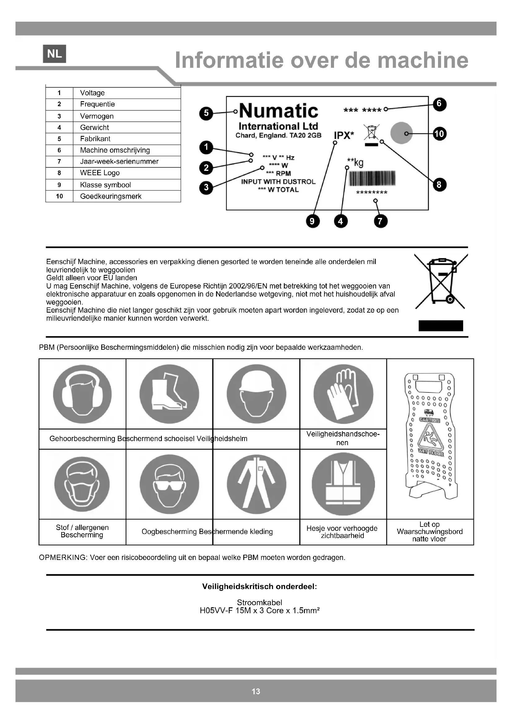Veiligheidskritisch onderdeel: Stroomkabel H05VV-F 15M x 3 Core x 1.5mm² Gehoorbescherming Beschermend schoeisel VeiligheidshelmVeiligheidshandschoe- nen Stof / allergenenBeschermingOogbescherming Beschermende kledingHesje voor verhoogde zichtbaarheidLet op Waarschuwingsbord natte vloerPBM (Persoonlijke Beschermingsmiddelen) die misschien nodig zijn voor bepaalde werkzaamheden.OPMERKING: Voer een risicobeoordeling uit en bepaal welke PBM moeten worden gedragen.Eenschijf Machine, accessories en verpakking dienen gesorted te worden teneinde alle onderdelen mil leuvriendelijk te weggoolienGeldt alleen voor EU landenU mag Eenschijf Machine, volgens de Europese Richtijn 2002/96/EN met betrekking tot het weggooien van elektronische apparatuur en zoals opgenomen in de Nederlandse wetgeving, niet met het huishoudelijk afval weggooien.Eenschijf Machine die niet langer geschikt zijn voor gebruik moeten apart worden ingeleverd, zodat ze op een milieuvriendelijke manier kunnen worden verwerkt. Type plaatje