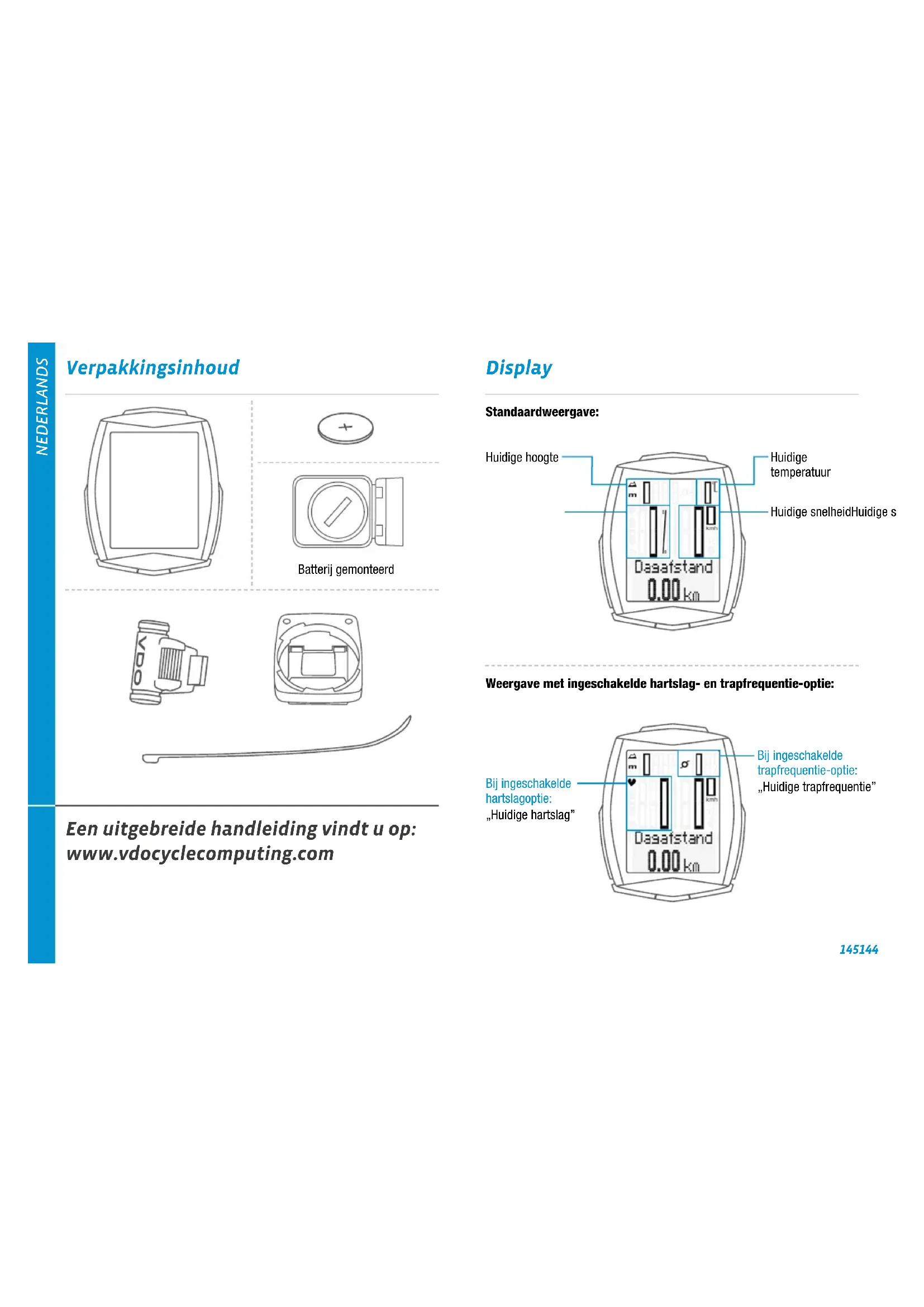 Verpakkingsinhoud Batterij gemonteerd Een uitgebreide handleiding vindt u op: www.vdocyclecomputing.com Display Huidige snelheidHuidige stijging Huidige temperatuur Huidige hoogte Standaardweergave: Bij ingeschakelde hartslagoptie: „Huidige hartslag” Bij ingeschakelde trapfrequentie-optie: „Huidige trapfrequentie” Weergave met ingeschakelde hartslag- en trapfrequentie-optie:NEDERLANDS