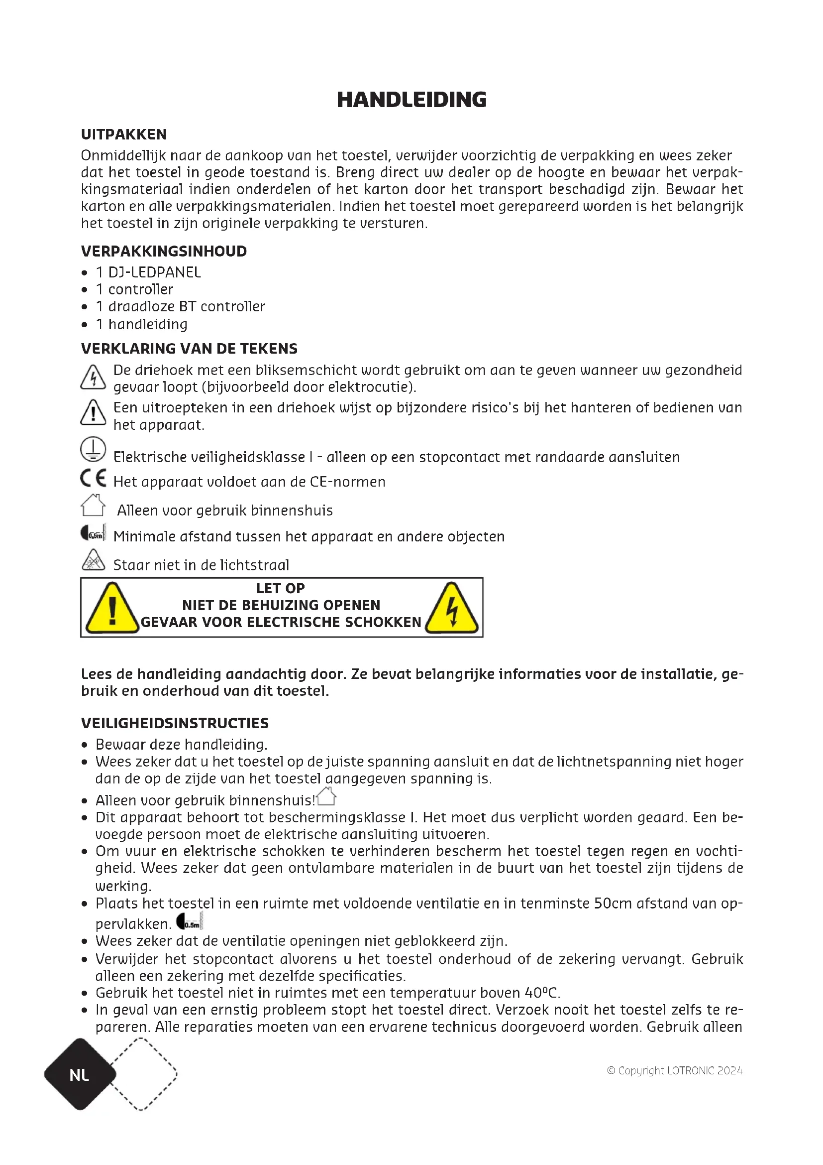 Lees de handleiding aandachtig door. Ze bevat belangrijke informaties voor de installatie, ge- bruik en onderhoud van dit toestel. VEILIGHEIDSINSTRUCTIES