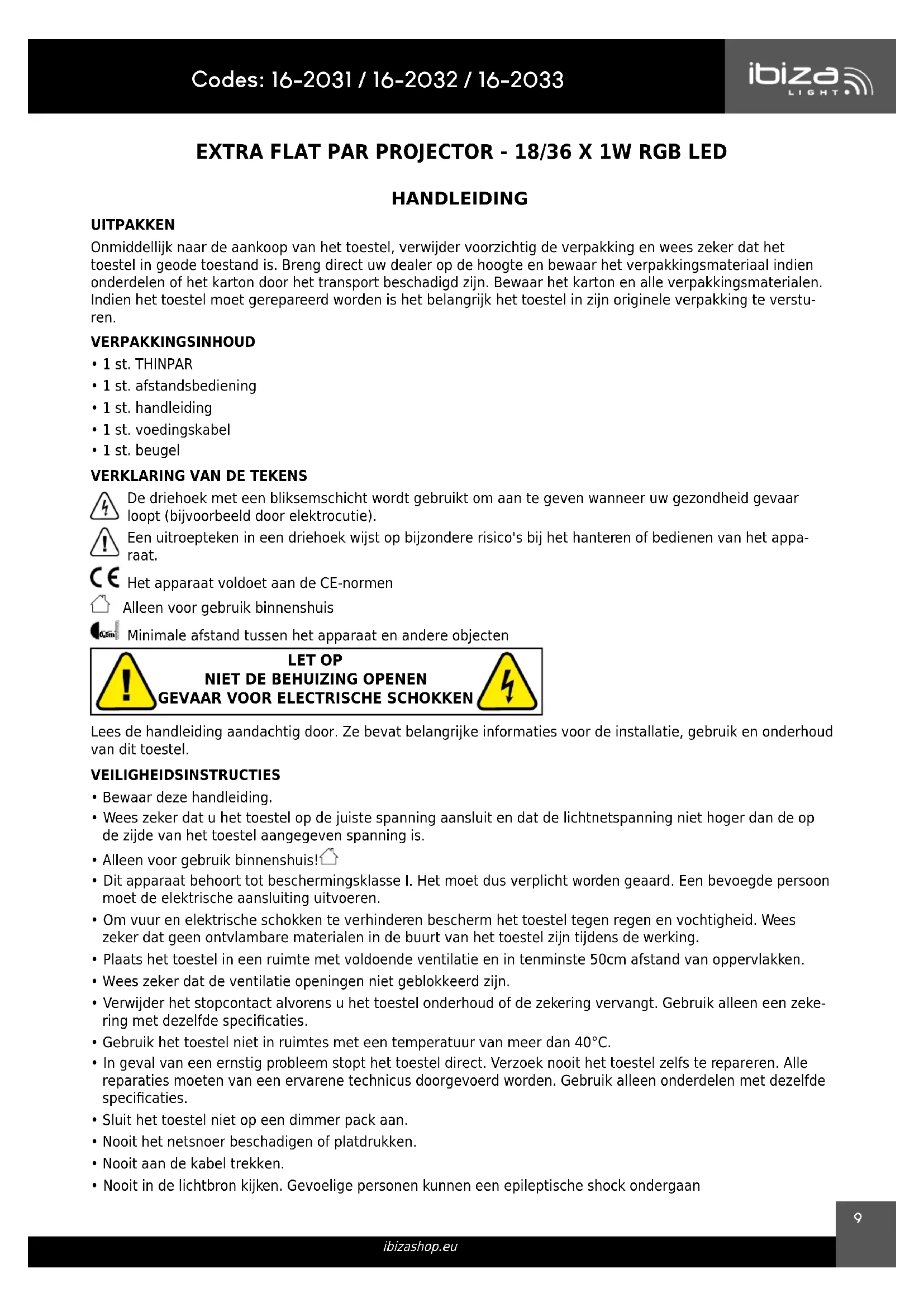 ibizashop.eu EXTRA FLAT PAR PROJECTOR - 18/36 X 1W RGB LED HANDLEIDING UITPAKKEN Onmiddellijk naar de aankoop van het toestel, verwijder voorzichtig de verpakking en wees zeker dat het toestel in geode toestand is. Breng direct uw dealer op de hoogte en bewaar het verpakkingsmateriaal indien onderdelen of het karton door het transport beschadigd zijn. Bewaar het karton en alle verpakkingsmaterialen. Indien het toestel moet gerepareerd worden is het belangrijk het toestel in zijn originele verpakking te verstu- ren. VERPAKKINGSINHOUD