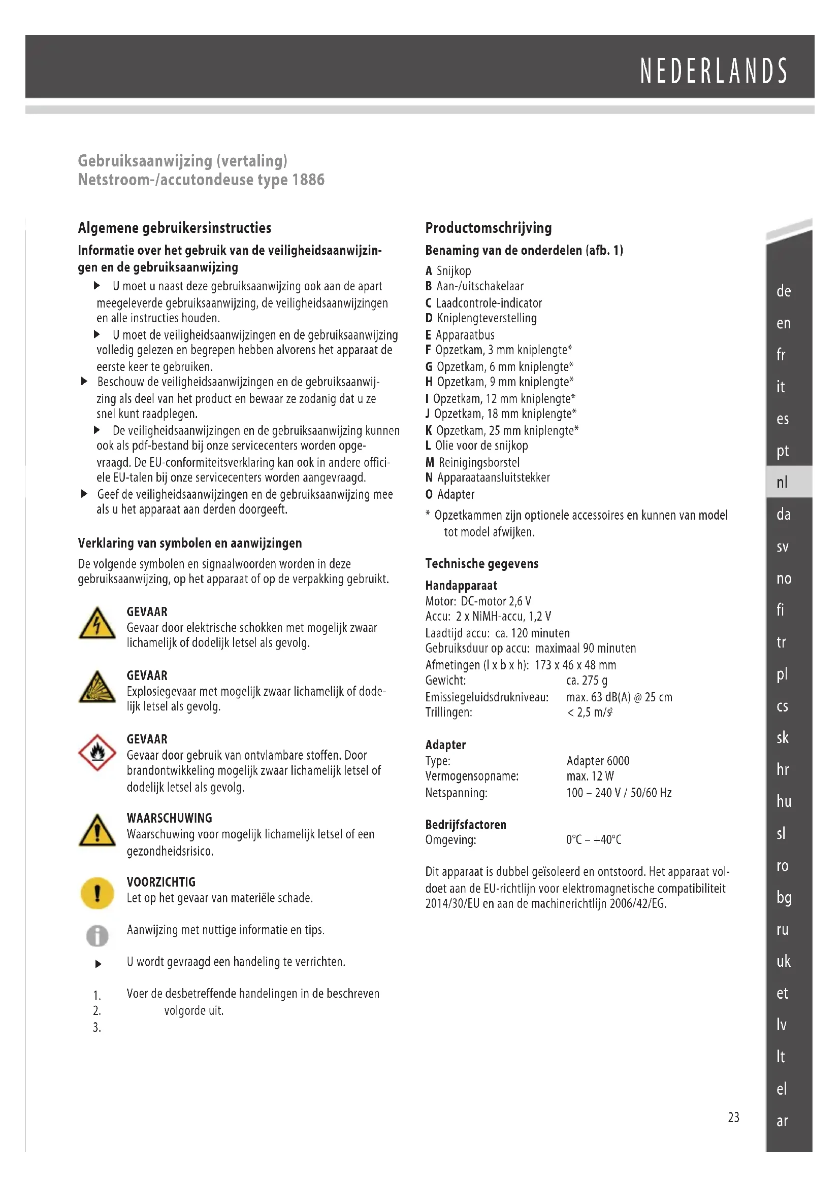 Gebruiksaanwijzing (vertaling) Netstroom-/accutondeuse type 1886 Algemene gebruikersinstructies Informatie over het gebruik van de veiligheidsaanwijzin- gen en de gebruiksaanwijzing f U moet u naast deze gebruiksaanwijzing ook aan de apart meegeleverde gebruiksaanwijzing, de veiligheidsaanwijzingen en alle instructies houden. f U moet de veiligheidsaanwijzingen en de gebruiksaanwijzing volledig gelezen en begrepen hebben alvorens het apparaat de eerste keer te gebruiken. f Beschouw de veiligheidsaanwijzingen en de gebruiksaanwij- zing als deel van het product en bewaar ze zodanig dat u ze snel kunt raadplegen. f De veiligheidsaanwijzingen en de gebruiksaanwijzing kunnen ook als pdf-bestand bij onze servicecenters worden opge- vraagd. De EU-conformiteitsverklaring kan ook in andere offici- ele EU-talen bij onze servicecenters worden aangevraagd. f Geef de veiligheidsaanwijzingen en de gebruiksaanwijzing mee als u het apparaat aan derden doorgeeft. Verklaring van symbolen en aanwijzingen De volgende symbolen en signaalwoorden worden in deze gebruiksaanwijzing, op het apparaat of op de verpakking gebruikt. GEVAAR Gevaar door elektrische schokken met mogelijk zwaar lichamelijk of dodelijk letsel als gevolg. GEVAAR Explosiegevaar met mogelijk zwaar lichamelijk of dode- lijk letsel als gevolg. GEVAAR Gevaar door gebruik van ontvlambare stoffen. Door brandontwikkeling mogelijk zwaar lichamelijk letsel of dodelijk letsel als gevolg. WAARSCHUWING Waarschuwing voor mogelijk lichamelijk letsel of een gezondheidsrisico. VOORZICHTIG Let op het gevaar van materiële schade. Aanwijzing met nuttige informatie en tips. U wordt gevraagd een handeling te verrichten. Voer de desbetreffende handelingen in de beschreven volgorde uit.