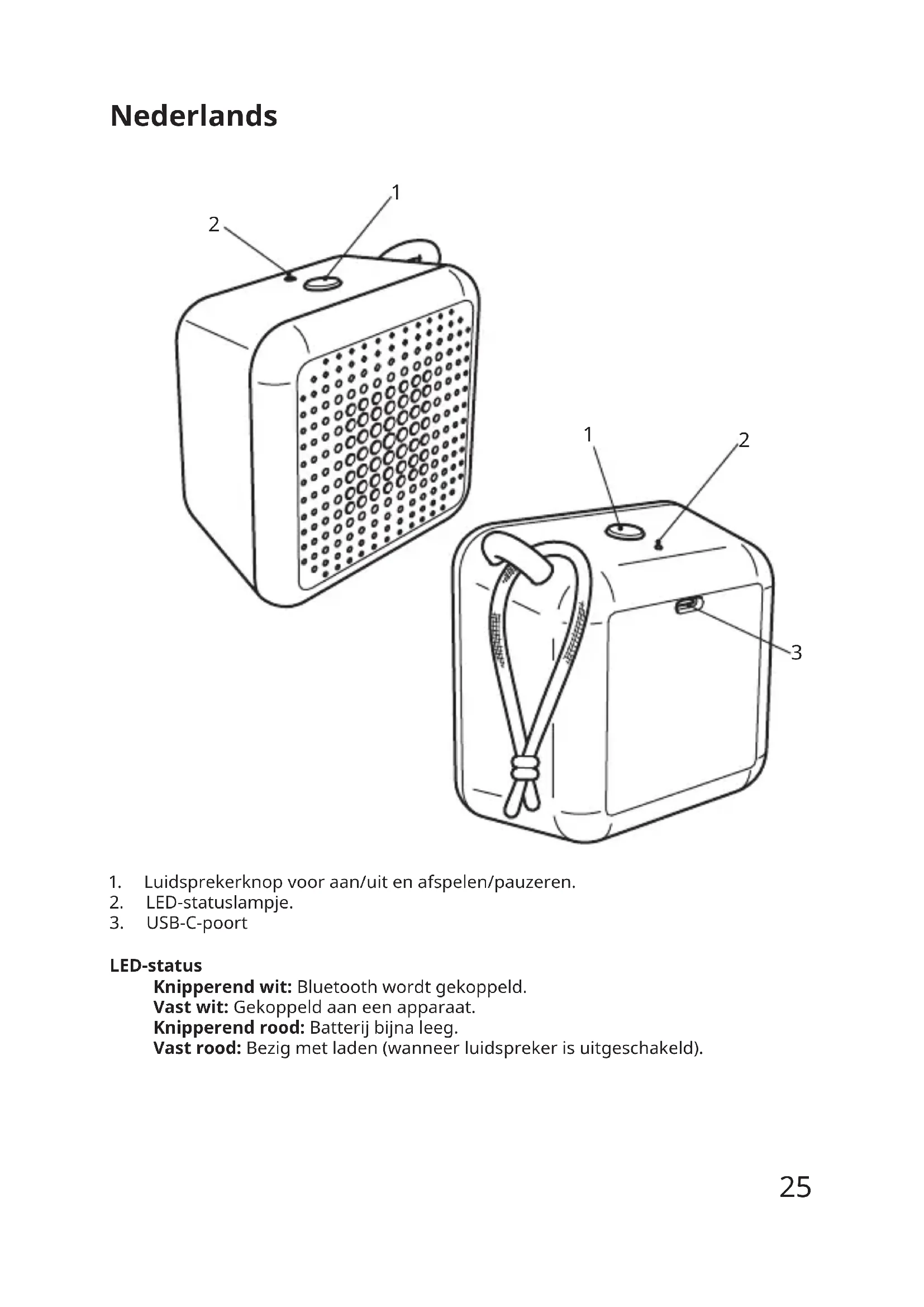 LED-status Knipperend wit:Bluetoothwordtgekoppeld. Vast wit:Gekoppeldaaneenapparaat. Knipperend rood:Batterijbijnaleeg. Vast rood:Bezigmetladen(wanneerluidsprekerisuitgeschakeld). Nederlands26 Aan de slag OmjeproductopteladenvoorheteerstegebruikentelkenswanneerdeLED roodknippertomaantegevendatdebatterijbijnaleegis,moetjeeenUSB-C- kabelaansluitenopdeingangspoortenhetandereuiteindevandekabelopeen voedingsbron(eencomputerofeenvoeding).TijdenshetopladenblijfthetLED- lampjeconstantroodbrandenalsdeluidsprekeruitstaatengaatuitwanneerde batterijvolledigisopgeladen. Aanbevolenvoeding: 5,0VDC,1,0A(nietinbegrepen) Speakerfuncties Aan-enuitzetten Houddeaan/uit-knop(1)ingedruktomjeluidsprekeraanenuittezetten. Afspelen/Pauzeren Eenkortedrukopdeaan/uit-knopzalmuziekafspelenofpauzeren. Automatischuitzetten Alsdeluidsprekernietaaneenapparaatisgekoppeld,gaathijautomatisch na5minutenuit.Alsdeluidsprekerisgekoppeld,maarerwordtgeenmuziek afgespeeld,gaathijna20minutenautomatischuit. Bluetooth-koppeling Omjeluidsprekertekoppelenaaneenbronapparaat,moetdeluidsprekerinde Bluetooth-koppelingsstandstaan.Omtekoppelen,openjedeBluetooth-instellingop jebronapparaatenmaakjeverbindingmet"VAPPEBYPortable". DeluidsprekergaatautomatischnaardeBluetooth-koppelingsstandwanneerhij voordeeerstekeerwordtaangezetenwanneereeneerdergekoppeldapparaatniet kanwordengevonden. Fabrieksinstellingenherstellen AlsjeeerdereBluetooth-koppelingenwiltverwijderen,steljedeluidspreker opnieuwindoordeknop(1)langerdan5secondeningedrukttehouden.Een succesvollefabrieksresetwordtbevestigddoordatdeLEDroodknippertenmeteen geluidssignaal. JekuntooknaarhetBluetooth-menuopjebronapparaatgaanenontkoppelen. Stereo-koppeling: TweeVAPPEBYPortableskunneninstereowordengekoppeld: 1.ZorgervoordatbeideluidsprekersindeBluetooth-zoekmodusstaan. 2.Druktweemaalopdeaan/uit-knopopeenvandeluidsprekers.Eengeluid bevestigtdesuccesvollestereo-koppeling. 3.MaakverbindingmethetbronapparaatdoordeBluetooth-koppelingsinstructies tevolgen.27 Goed om te weten