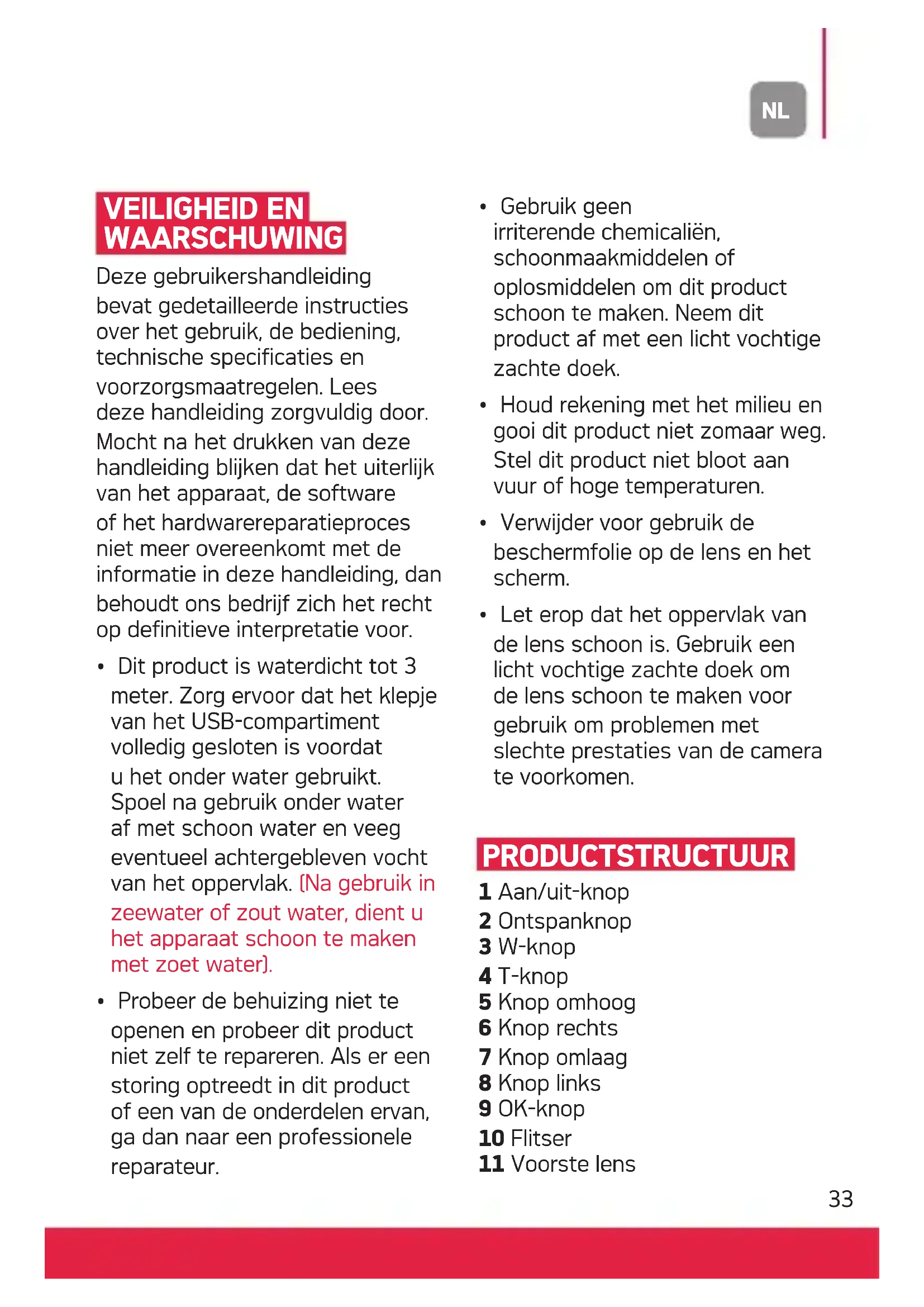 - Dit product is waterdicht tot 3 meter. Zorg ervoor dat het klepje van het USB-compartiment volledig gesloten is voordat u het onder water gebruikt. Spoel na gebruik onder water af met schoon water en veeg eventueel achtergebleven vocht van het oppervlak. (Na gebruik in zeewater of zout water, dient u het apparaat schoon te maken met zoet water).