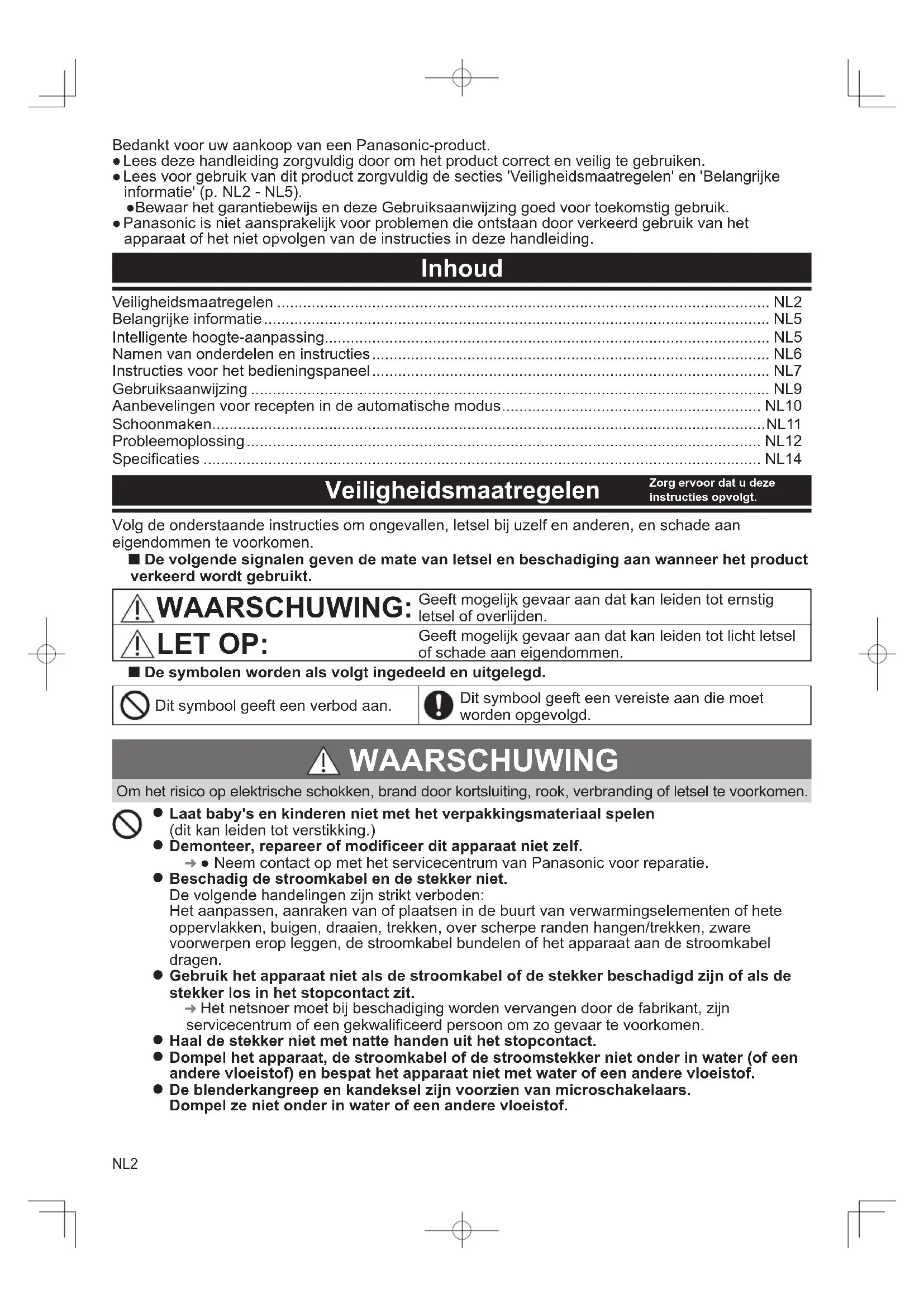 Als het voedsel naar beneden moet worden geduwd, gebruik dan een geschikt hulpmiddel zoals een spatel.NL4 LET OP Om het risico op lekstroom, elektrische schokken, brand door kortsluiting, verbranding, letsel of schade aan eigendommen te voorkomen.