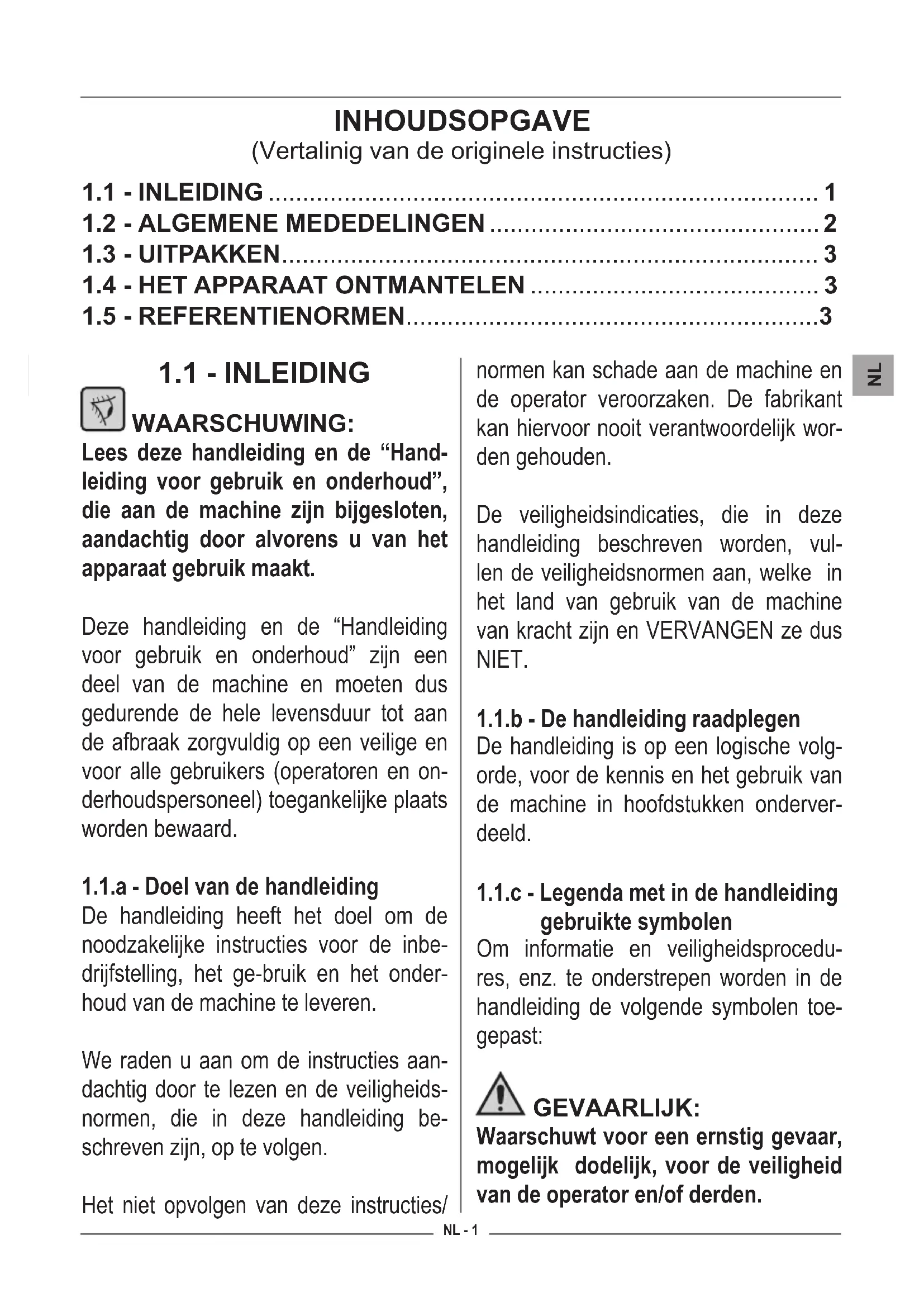 De handleiding heeft het doel om de noodzakelijke instructies voor de inbe- drijfstelling, het ge-bruik en het onder- houd van de machine te leveren. We raden u aan om de instructies aan- dachtig door te lezen en de veiligheids- normen, die in deze handleiding be- schreven zijn, op te volgen. Het niet opvolgen van deze instructies/ normen kan schade aan de machine en de operator veroorzaken. De fabrikant kan hiervoor nooit verantwoordelijk wor- den gehouden. De veiligheidsindicaties, die in deze handleiding beschreven worden, vul- len de veiligheidsnormen aan, welke in het land van gebruik van de machine van kracht zijn en VERVANGEN ze dus NIET.
