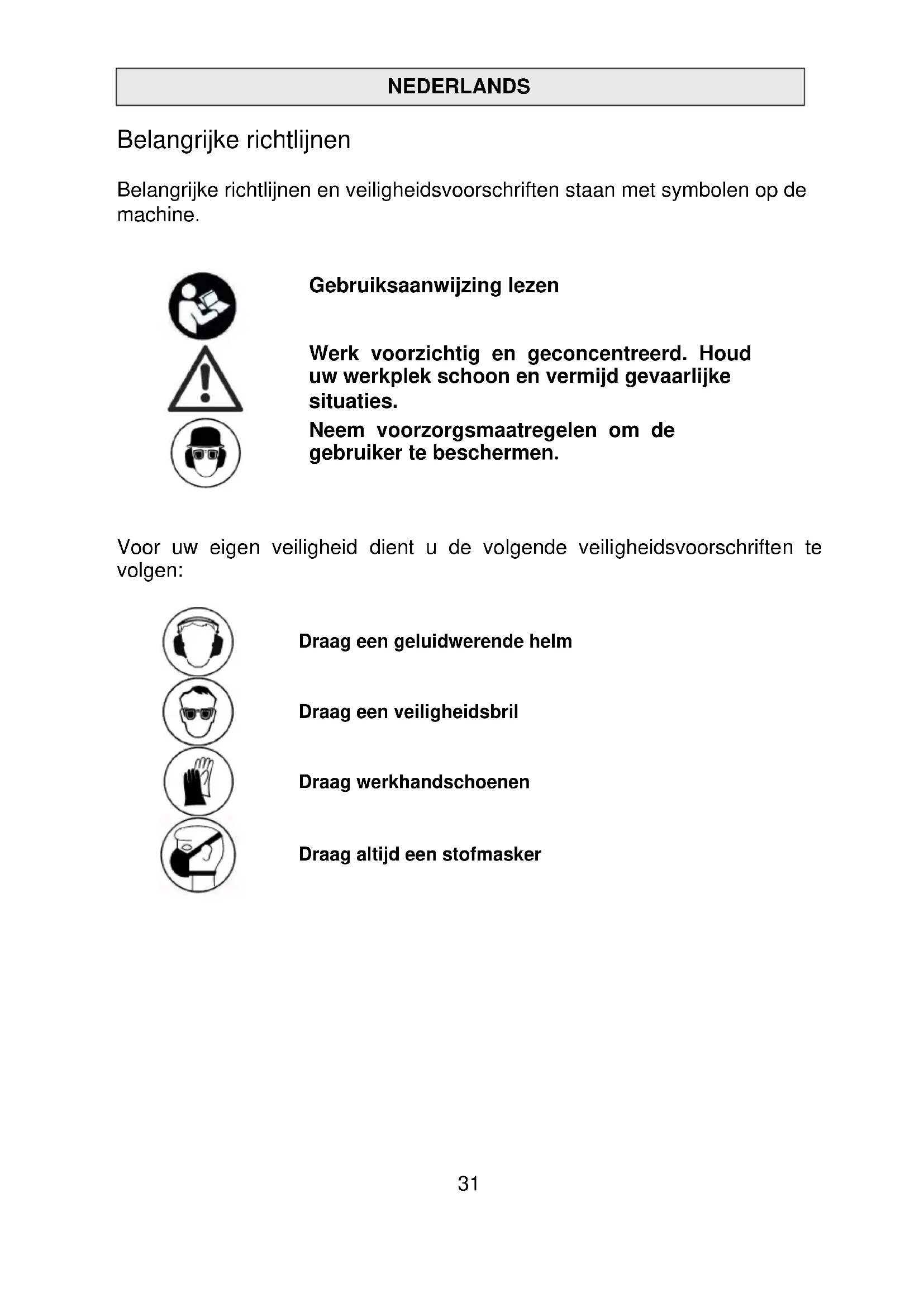 Con ogni riserva di modifiche tecniche.31 NEDERLANDS Belangrijke richtlijnen Belangrijke richtlijnen en veiligheidsvoorschriften staan met symbolen op de machine.