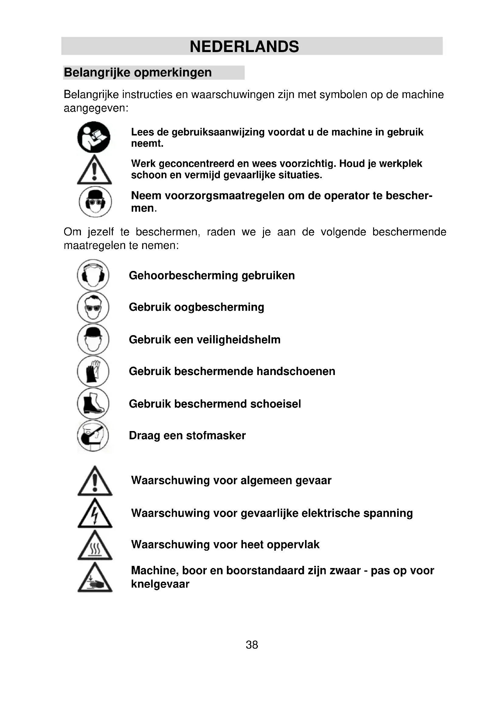 Lothar Lässig Frank Markert Directeur général Responsable de l'ingénierie Eibenstock, 25.06.2025 Sous réserve de modifications.38 NEDERLANDS Belangrijke opmerkingen Belangrijke instructies en waarschuwingen zijn met symbolen op de machine aangegeven: