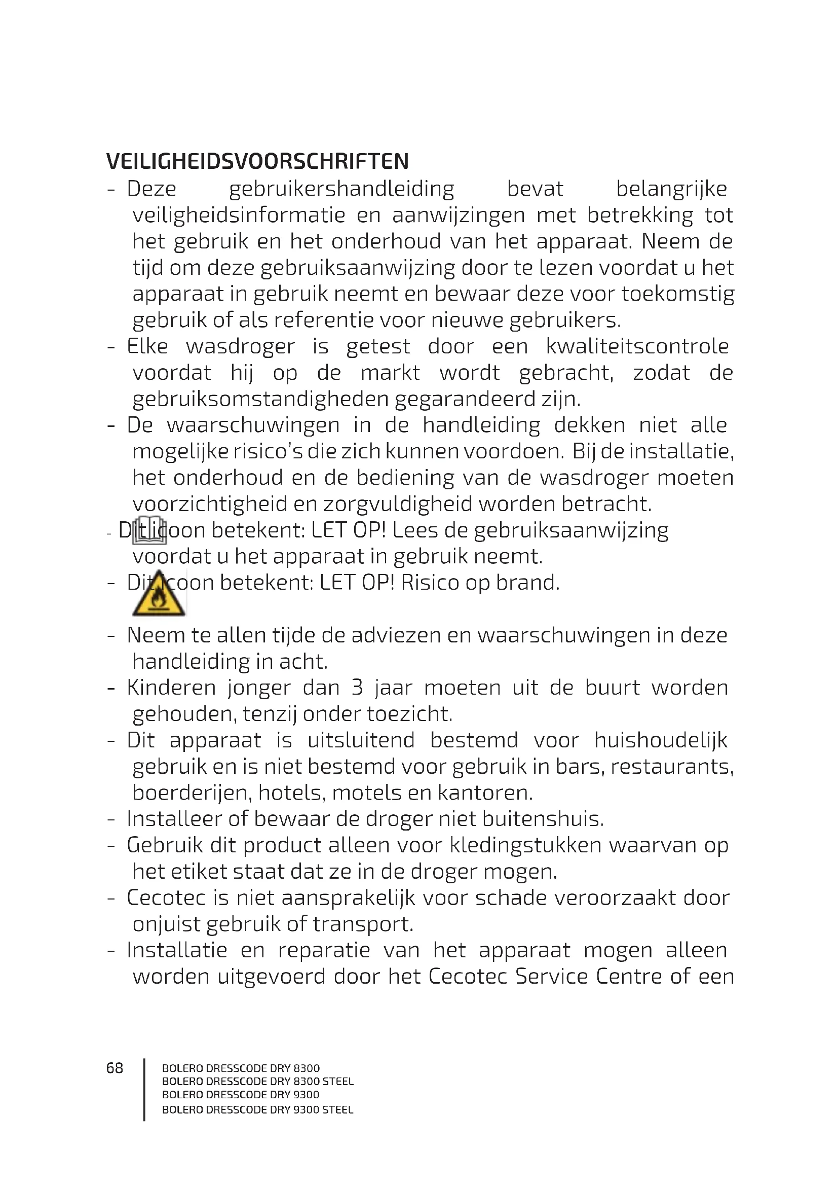 VEILIGHEIDSVOORSCHRIFTEN - Deze gebruikershandleiding bevat belangrijke veiligheidsinformatie en aanwijzingen met betrekking tot het gebruik en het onderhoud van het apparaat. Neem de tijd om deze gebruiksaanwijzing door te lezen voordat u het apparaat in gebruik neemt en bewaar deze voor toekomstig gebruik of als referentie voor nieuwe gebruikers. - Elke wasdroger is getest door een kwaliteitscontrole voordat hij op de markt wordt gebracht, zodat de gebruiksomstandigheden gegarandeerd zijn. - De waarschuwingen in de handleiding dekken niet alle mogelijke risico’s die zich kunnen voordoen. Bij de installatie, het onderhoud en de bediening van de wasdroger moeten voorzichtigheid en zorgvuldigheid worden betracht. - Dit icoon betekent: LET OP! Lees de gebruiksaanwijzing voordat u het apparaat in gebruik neemt. - Dit icoon betekent: LET OP! Risico op brand. - Neem te allen tijde de adviezen en waarschuwingen in deze handleiding in acht. - Kinderen jonger dan 3 jaar moeten uit de buurt worden gehouden, tenzij onder toezicht. - Dit apparaat is uitsluitend bestemd voor huishoudelijk gebruik en is niet bestemd voor gebruik in bars, restaurants, boerderijen, hotels, motels en kantoren. - Installeer of bewaar de droger niet buitenshuis. - Gebruik dit product alleen voor kledingstukken waarvan op het etiket staat dat ze in de droger mogen. - Cecotec is niet aansprakelijk voor schade veroorzaakt door onjuist gebruik of transport. - Installatie en reparatie van het apparaat mogen alleen worden uitgevoerd door het Cecotec Service Centre of een69