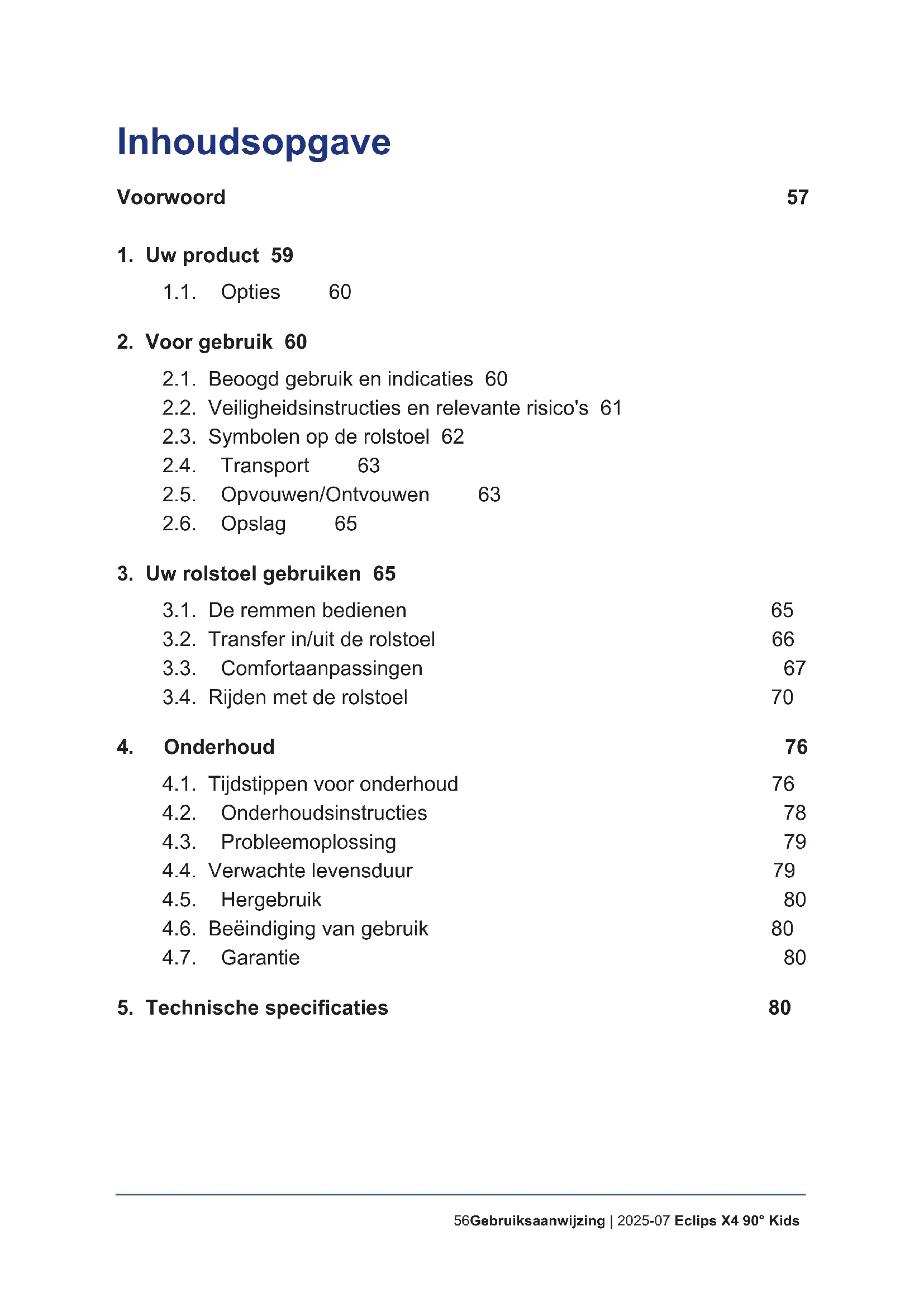 Voorwoord Prociat! U bent eigenaar van een Vermeiren-rolstoel! Deze rolstoel werd vervaardigd door gekwaliceerd en toegewijd personeel. Hij werd ontworpen en geproduceerd volgens hoge kwaliteitsnormen, bewaakt door Vermeiren. Bedankt voor uw vertrouwen in de producten van Vermeiren. Om u te ondersteunen bij het gebruik van deze rolstoel en zijn bedieningsmogelijkheden, bieden we u deze handleiding aan. Lees deze informatie zorgvuldig door: het zal u helpen om vertrouwd te raken met de besturing, mogelijkheden en beperkingen van uw rolstoel. Indien u na het lezen van deze handleiding nog vragen heeft, aarzel dan niet om contact op te nemen met uw vakhandelaar. Hij/Zij zal u met plezier verder helpen. Belangrijke opmerking Om uw veiligheid te garanderen, en om de levensduur van uw product te verlengen, raden we u aan om er goed zorg voor te dragen en om regelmatig nazicht en onderhoud te laten uitvoeren. Deze handleiding houdt rekening met de recentste productontwikkelingen. De Firma Vermeiren behoudt zich het recht voor om wijzigingen aan dit type product door te voeren zonder verplicht te zijn om voordien geleverde producten aan te passen of te vervangen. Afbeeldingen van het product worden gebruikt om de instructies in deze handleiding te verduidelijken. Details van het afgebeelde product kunnen afwijken van uw aangekochte product.58Gebruiksaanwijzing | 2025-07 Eclips X4 90° Kids Beschikbare informatie Op onze website http://www.vermeiren.com/ kan u steeds de meest recente versie terugvinden van de informatie in deze handleiding. Contacteer deze website regelmatig voor mogelijke updates. Personen met een visuele beperking kunnen de elektronische versie van de handleiding downloaden en met behulp van een tekst-naar-spraak softwareapplicatie laten voorlezen. Gebruiksaanwijzing Voor gebruiker en vakhandelaar Installatiehandleiding Voor de vakhandelaar Servicehandleiding voor rolstoelen Voor de vakhandelaar EC-conformiteitsverklaring59 Eclips X4 90° KidsGebruiksaanwijzing | 2025-07