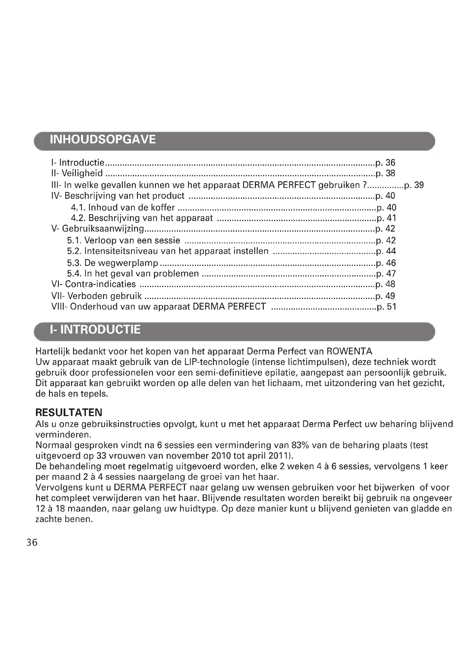Uw apparaat maakt gebruik van de LIP-technologie (intense lichtimpulsen), deze techniek wordt gebruik door professionelen voor een semi-definitieve epilatie, aangepast aan persoonlijk gebruik. Dit apparaat kan gebruikt worden op alle delen van het lichaam, met uitzondering van het gezicht, de hals en tepels. RESULTATEN Als u onze gebruiksinstructies opvolgt, kunt u met het apparaat Derma Perfect uw beharing blijvend verminderen. Normaal gesproken vindt na 6 sessies een vermindering van 83% van de beharing plaats (test uitgevoerd op 33 vrouwen van november 2010 tot april 2011). De behandeling moet regelmatig uitgevoerd worden, elke 2 weken 4 à 6 sessies, vervolgens 1 keer per maand 2 à 4 sessies naargelang de groei van het haar. Vervolgens kunt u DERMA PERFECT naar gelang uw wensen gebruiken voor het bijwerken of voor het compleet verwijderen van het haar. Blijvende resultaten worden bereikt bij gebruik na ongeveer 12 à 18 maanden, naar gelang uw huidtype. Op deze manier kunt u blijvend genieten van gladde en zachte benen. INHOUDSOPGAVE I- INTRODUCTIE