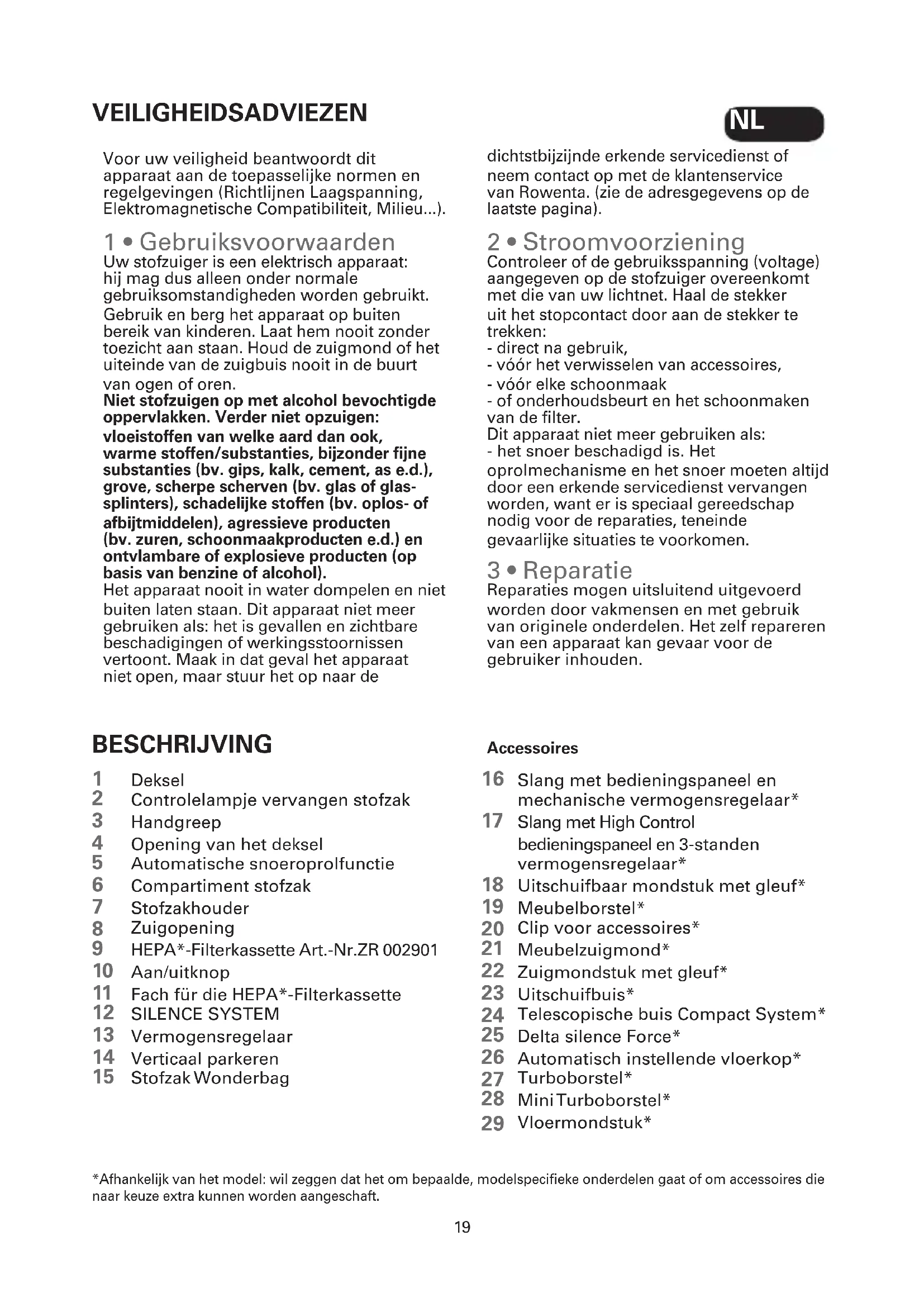 ACCESSORIES* VACUUMING FITTING AN ACCESSORY PURCHASE LOCATIONS Wonderbag bag Furniture brush Upholstery nozzle Telescopic crevice tool Floor nozzle Mini turbobrush Turbobrush To clean furniture. To clean furniture. To get into corners and places that are hard to reach. For fragile floors. To clean upholstery fabrics in depth. To remove threads and animal hairs ingrained into mats and carpets. Universal bag. Fit the furniture brush onto the end of the power nozzle or tube. Fit the furniture crevice tool onto the end of the power nozzle or the tube. Fit the telescopic crevice tool onto the end of the power nozzle or the tube. Fit the hardfloor tool to the end of the tube. Fit the mini turbobrush to the end of the tube. Fit the turbobrush to the end of the tube. Fit the ring onto the Wonderbag then place it inside the compartment. Rowenta Approved Service Centres (see the attached address list). ENVIRONMENT In accordance with current regulations, before disposing of an appliance no longer needed, the appliance must be rendered inoperative (by unplugging it and cutting off the supply cord). Environment protection first! Your appliance contains valuable materials which can be recovered or recycled. Leave it at a local civic waste collection point. *Depending on model: this is either equipment specific to certain models or available as an optional accessory. GB19 Voor uw veiligheid beantwoordt dit apparaat aan de toepasselijke normen en regelgevingen (Richtlijnen Laagspanning, Elektromagnetische Compatibiliteit, Milieu...). 1 • Gebruiksvoorwaarden Uw stofzuiger is een elektrisch apparaat: hij mag dus alleen onder normale gebruiksomstandigheden worden gebruikt. Gebruik en berg het apparaat op buiten bereik van kinderen. Laat hem nooit zonder toezicht aan staan. Houd de zuigmond of het uiteinde van de zuigbuis nooit in de buurt van ogen of oren. Niet stofzuigen op met alcohol bevochtigde oppervlakken. Verder niet opzuigen: vloeistoffen van welke aard dan ook, warme stoffen/substanties, bijzonder fijne substanties (bv. gips, kalk, cement, as e.d.), grove, scherpe scherven (bv. glas of glas- splinters), schadelijke stoffen (bv. oplos- of afbijtmiddelen), agressieve producten (bv. zuren, schoonmaakproducten e.d.) en ontvlambare of explosieve producten (op basis van benzine of alcohol). Het apparaat nooit in water dompelen en niet buiten laten staan. Dit apparaat niet meer gebruiken als: het is gevallen en zichtbare beschadigingen of werkingsstoornissen vertoont. Maak in dat geval het apparaat niet open, maar stuur het op naar de dichtstbijzijnde erkende servicedienst of neem contact op met de klantenservice van Rowenta. (zie de adresgegevens op de laatste pagina). 2 • Stroomvoorziening Controleer of de gebruiksspanning (voltage) aangegeven op de stofzuiger overeenkomt met die van uw lichtnet. Haal de stekker uit het stopcontact door aan de stekker te trekken: - direct na gebruik, - vóór het verwisselen van accessoires, - vóór elke schoonmaak - of onderhoudsbeurt en het schoonmaken van de filter. Dit apparaat niet meer gebruiken als: - het snoer beschadigd is. Het oprolmechanisme en het snoer moeten altijd door een erkende servicedienst vervangen worden, want er is speciaal gereedschap nodig voor de reparaties, teneinde gevaarlijke situaties te voorkomen. 3 • Reparatie Reparaties mogen uitsluitend uitgevoerd worden door vakmensen en met gebruik van originele onderdelen. Het zelf repareren van een apparaat kan gevaar voor de gebruiker inhouden. VEILIGHEIDSADVIEZEN BESCHRIJVING Deksel Controlelampje vervangen stofzak Handgreep Opening van het deksel Automatische snoeroprolfunctie Compartiment stofzak Stofzakhouder Zuigopening HEPA*-Filterkassette Art.-Nr.ZR 002901 Aan/uitknop Fach für die HEPA*-Filterkassette SILENCE SYSTEM Vermogensregelaar Verticaal parkeren Stofzak Wonderbag Slang met bedieningspaneel en mechanische vermogensregelaar* Slang met High Control bedieningspaneel en 3-standen vermogensregelaar* Uitschuifbaar mondstuk met gleuf* Meubelborstel* Clip voor accessoires* Meubelzuigmond* Zuigmondstuk met gleuf* Uitschuifbuis* Telescopische buis Compact System* Delta silence Force* Automatisch instellende vloerkop* Turboborstel* Mini Turboborstel* Vloermondstuk*