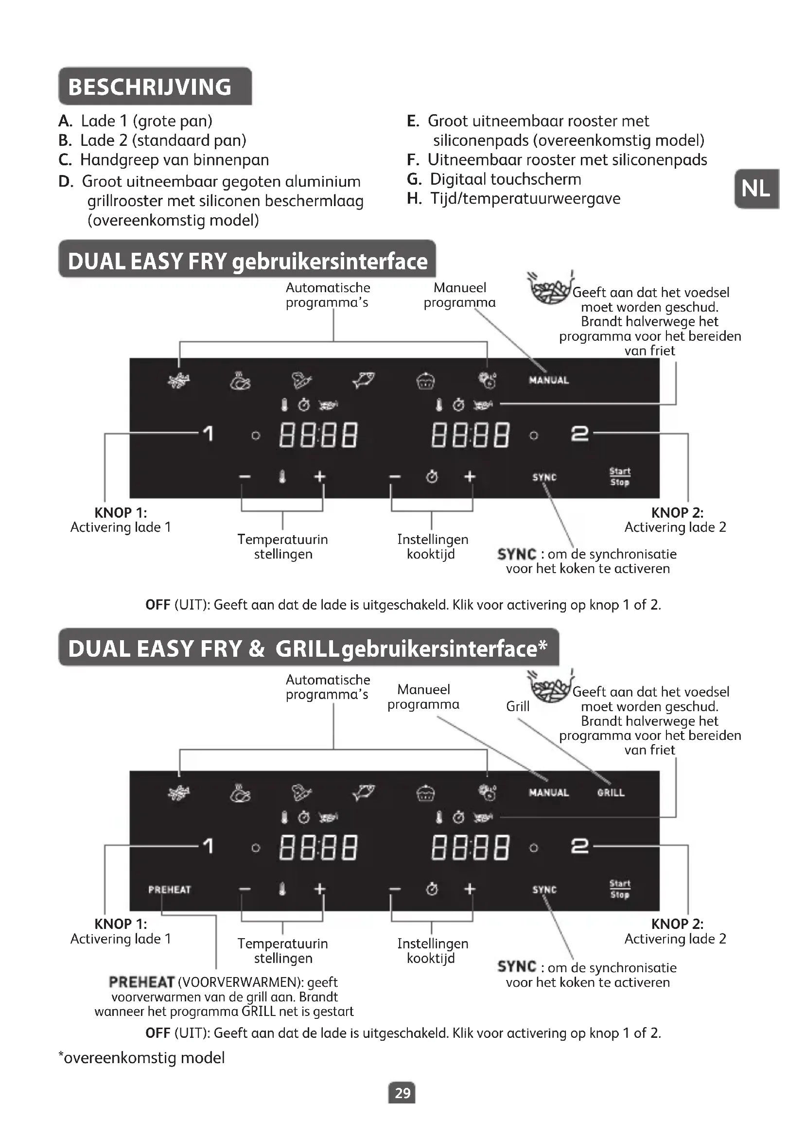 BESCHRIJVING A. Lade 1 (grote pan) B. Lade 2 (standaard pan) C. Handgreep van binnenpan D. Groot uitneembaar gegoten aluminium grillrooster met siliconen beschermlaag (overeenkomstig model) E. Groot uitneembaar rooster met siliconenpads (overeenkomstig model) F. Uitneembaar rooster met siliconenpads G. Digitaal touchscherm H. Tijd/temperatuurweergave DUAL EASY FRY gebruikersinterface