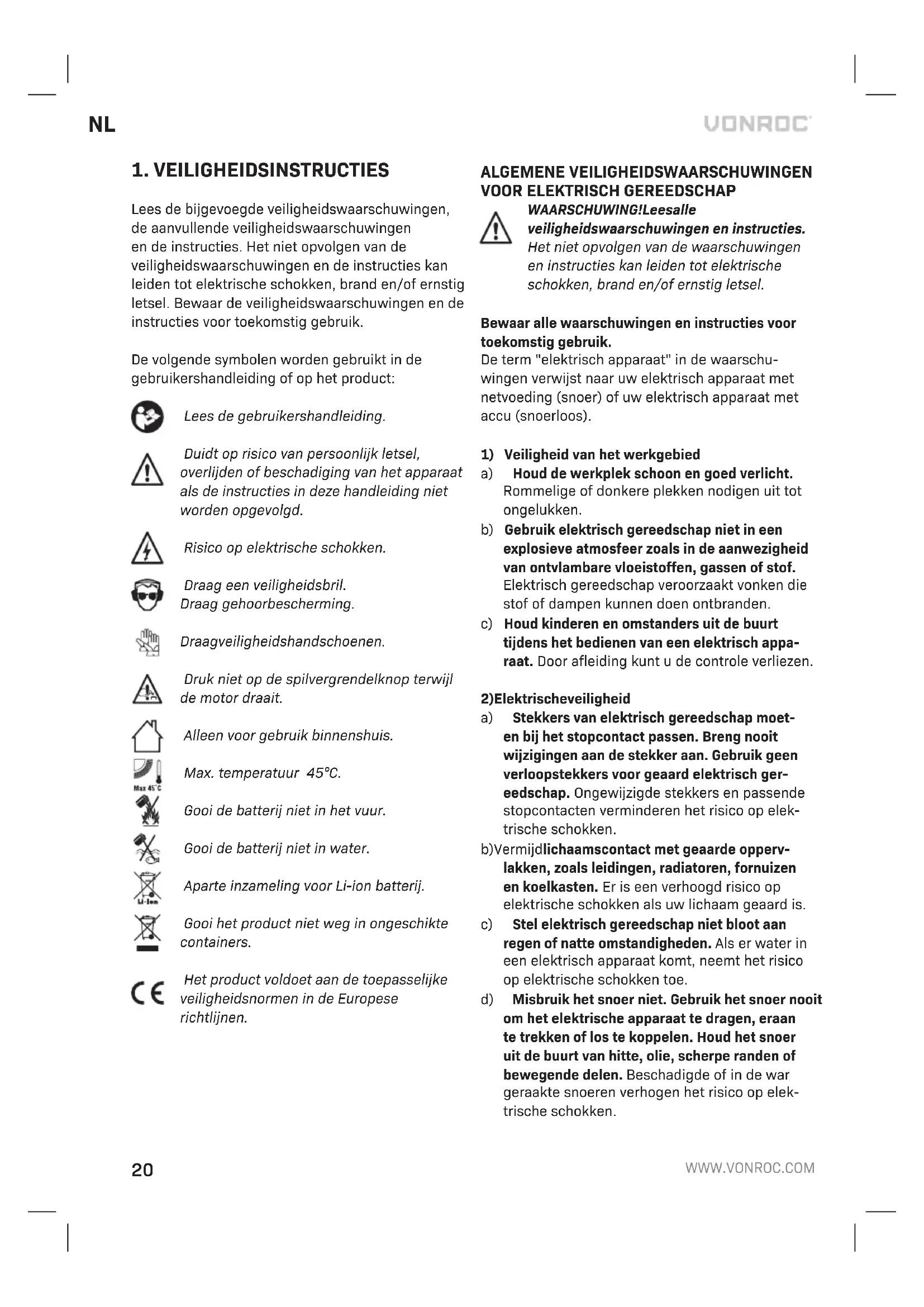Schakel voor reiniging en onderhoud altijd de machine uit en verwijder de accu uit de machine. Reinig de behuizing van de Machine regelmatig met een zachte doek, bij voorkeur na elk gebruik. Zorg ervoor dat de ventilatieopeningen vrij zijn van stof en vuil. Verwijder hardnekkig vuil met een zachte doek die bevochtigd is met zeepsop. Gebruik geen oplosmiddelen zoals benzine, alcohol, ammoniak, enz. Dergelijke chemicaliën beschadigen de synthetische onderdelen. GARANTIE VONROC-producten zijn ontwikkeld volgens de hoogste kwaliteitsnormen en zijn gegarandeerd vrij van materiaal- en fabricagefouten voor de wettelijk vastgestelde periode vanaf de datum van oorspronkelijke aankoop. Mocht het product tijdens deze periode defecten vertonen die te wijten zijn aan materiaal- en/of fabricagefouten, neem dan rechtstreeks contact op met VONROC. De volgende omstandigheden zijn uitgesloten van deze garantie: - Er zijn reparaties en/of wijzigingen aan de machine uitgevoerd of geprobeerd door onbevoegde servicecentra; - Normale slijtage; - Het gereedschap is misbruikt, verkeerd gebruikt of niet goed onderhouden; - Er zijn niet-originele reserveonderdelen gebruikt.28