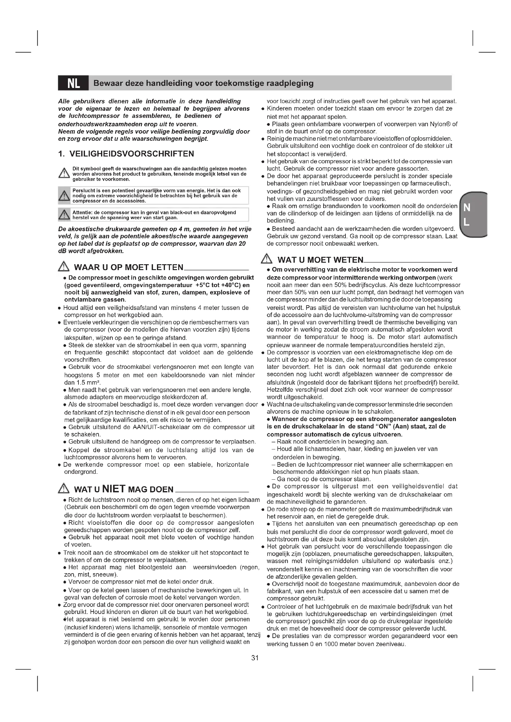 ● Om oververhitting van de elektrische motor te voorkomen werd deze compressor voor intermitterende werking ontworpen (werk nooit aan meer dan een 50% bedrijfscyclus. Als deze luchtcompressor meer dan 50% van een uur lucht pompt, dan bedraagt het vermogen van de compressor minder dan de luchtuitstroming die door de toepassing vereist wordt. Pas altijd de vereisten van luchtvolume van het hulpstuk of de accessoire aan de luchtvolume-uitstroming van de compressor aan). In geval van oververhitting treedt de thermische beveiliging van de motor in werking zodat de stroom automatisch afgesloten wordt wanneer de temperatuur te hoog is. De motor start automatisch opnieuw wanneer de normale temperatuurcondities hersteld zijn. ● De compressor is voorzien van een elektromagnetische klep om de lucht uit de kop af te blazen, die het terug starten van de compressor later bevordert. Het is dan ook normaal dat gedurende enkele seconden nog lucht wordt afgeblazen wanneer de compressor de afsluitdruk (ingesteld door de fabrikant tijdens het proefbedrijf) bereikt. Hetzelfde verschijnsel doet zich ook voor wanneer de compressor wordt uitgeschakeld. ● Wacht na de uitschakeling van de compressor tenminste drie seconden alvorens de machine opnieuw in te schakelen. ● Wanneer de compressor op een stroomgenerator aangesloten is en de drukschakelaar in de stand “ON” (Aan) staat, zal de compressor automatisch de cylcus uitvoeren. – Raak nooit onderdelen in beweging aan. – Houd alle lichaamsdelen, haar, kleding en juwelen ver van onderdelen in beweging. – Bedien de luchtcompressor niet wanneer alle schermkappen en beschermende afdekkingen niet op hun plaats staan. – Ga nooit op de compressor staan. ● De compressor is uitgerust met een veiligheidsventiel dat ingeschakeld wordt bij slechte werking van de drukschakelaar om de machineveiligheid te garanderen. ● De rode streep op de manometer geeft de maximumbedrijfsdruk van het reservoir aan, en niet de geregelde druk. ● Tijdens het aansluiten van een pneumatisch gereedschap op een buis met perslucht die door de compressor wordt geleverd, moet de luchtstroom die uit deze buis komt absoluut afgesloten zijn. ● Het gebruik van perslucht voor de verschillende toepassingen die mogelijk zijn (opblazen, pneumatische gereedschappen, lakspuiten, wassen met reinigingsmiddelen uitsluitend op waterbasis enz.) veronderstelt kennis en inachtneming van de voorschriften die voor de afzonderlijke gevallen gelden. ● Overschrijd nooit de toegestane maximumdruk, aanbevolen door de fabrikant, van een hulpstuk of een accessoire dat u samen met de compressor gebruikt. ● Controleer of het luchtgebruik en de maximale bedrijfsdruk van het te gebruiken luchtdrukgereedschap en verbindingsleidingen (met de compressor) geschikt zijn voor de op de drukregelaar ingestelde druk en met de hoeveelheid door de compressor geleverde lucht. ● De prestaties van de compressor worden gegarandeerd voor een werking tussen 0 en 1000 meter boven zeeniveau. Bewaar deze handleiding voor toekomstige raadpleging NL32