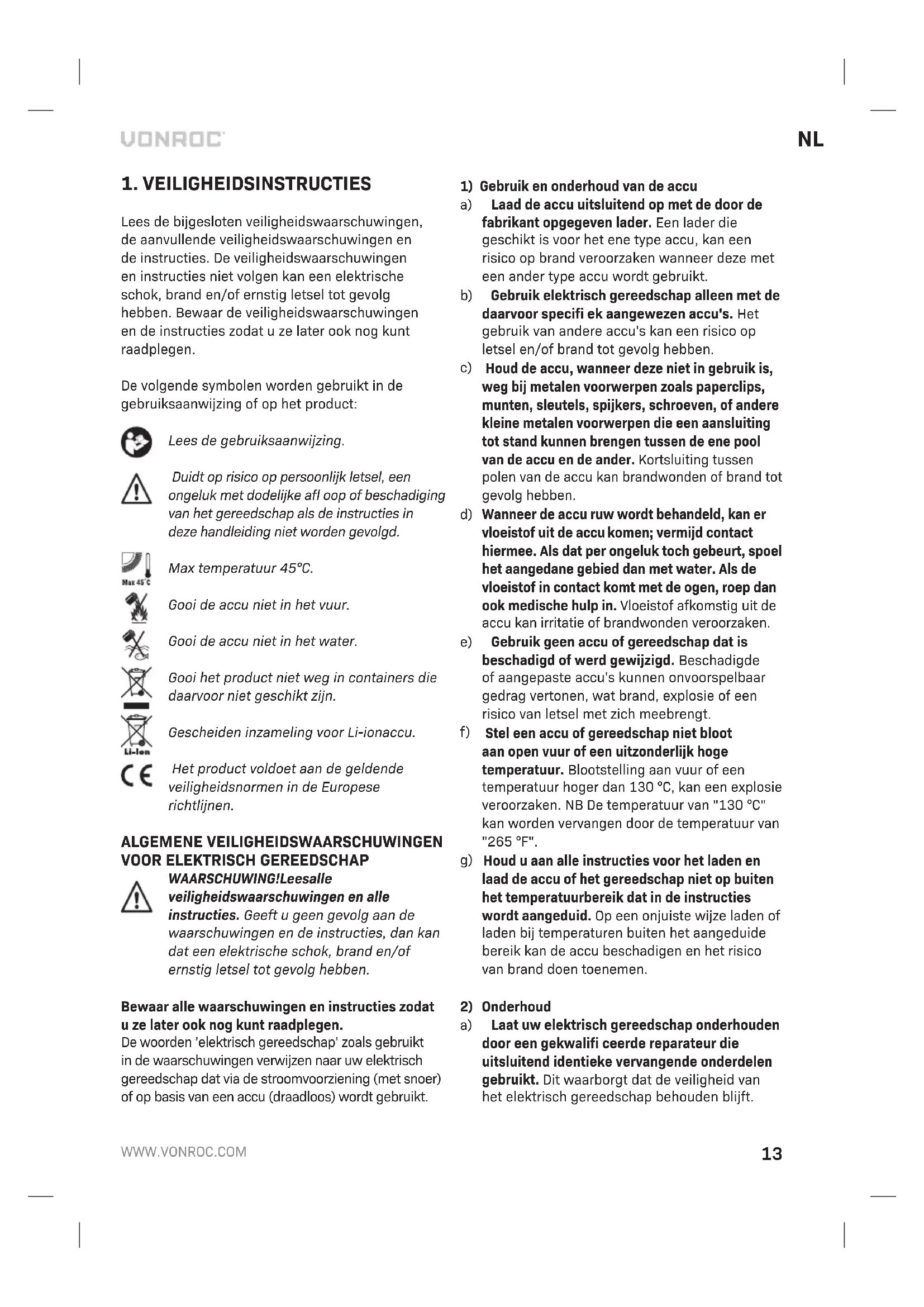 Lees de bijgesloten veiligheidswaarschuwingen, de aanvullende veiligheidswaarschuwingen en de instructies. De veiligheidswaarschuwingen en instructies niet volgen kan een elektrische schok, brand en/of ernstig letsel tot gevolg hebben. Bewaar de veiligheidswaarschuwingen en de instructies zodat u ze later ook nog kunt raadplegen. De volgende symbolen worden gebruikt in de gebruiksaanwijzing of op het product: Lees de gebruiksaanwijzing. Duidt op risico op persoonlijk letsel, een ongeluk met dodelijke afl oop of beschadiging van het gereedschap als de instructies in deze handleiding niet worden gevolgd. Max temperatuur 45°C. Gooi de accu niet in het vuur. Gooi de accu niet in het water. Gooi het product niet weg in containers die daarvoor niet geschikt zijn. Gescheiden inzameling voor Li-ionaccu. Het product voldoet aan de geldende veiligheidsnormen in de Europese richtlijnen. ALGEMENE VEILIGHEIDSWAARSCHUWINGEN