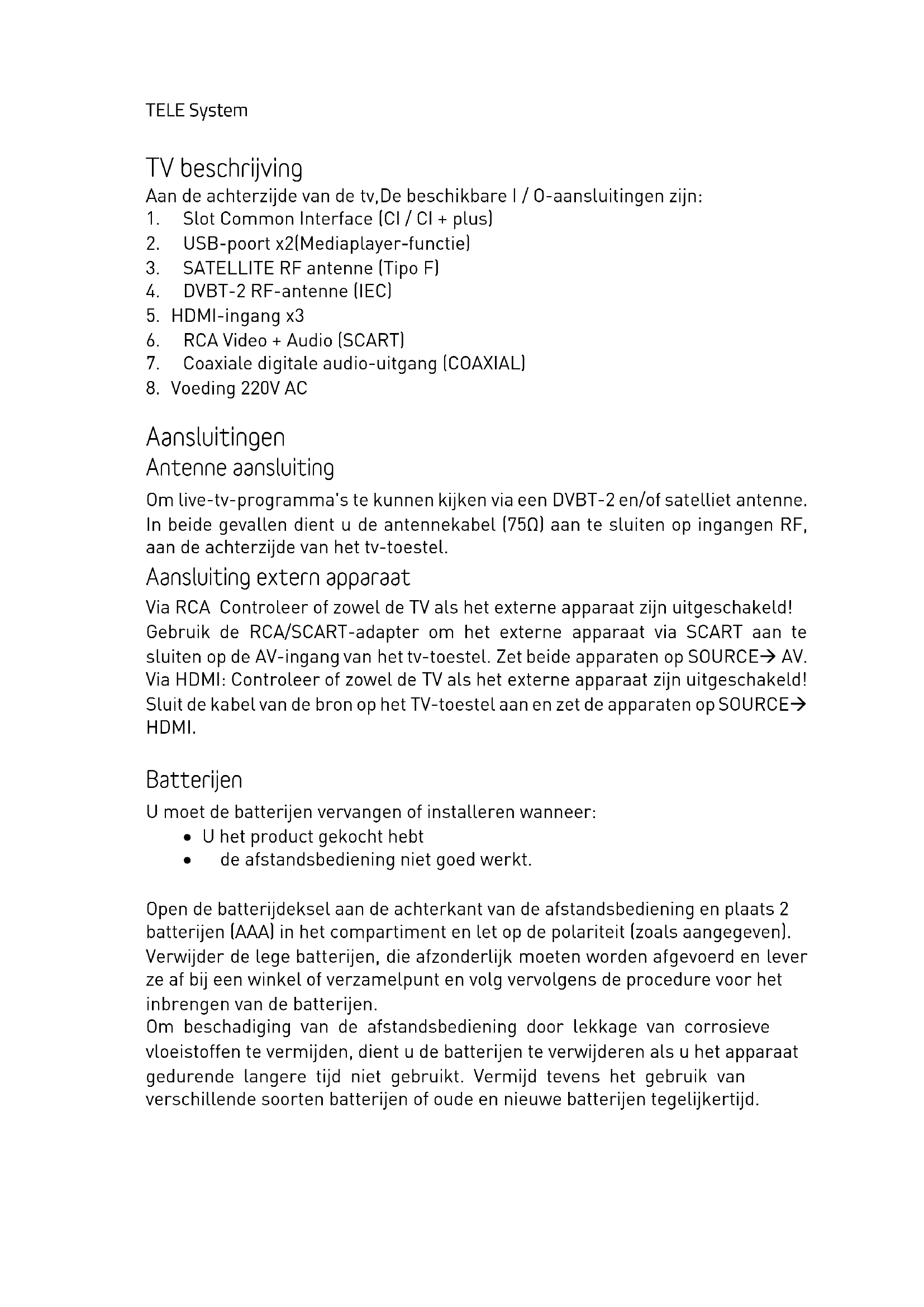 Aansluitingen Antenne aansluiting Om live-tv-programma's te kunnen kijken via een DVBT-2 en/of satelliet antenne. In beide gevallen dient u de antennekabel (75Ω) aan te sluiten op ingangen RF, aan de achterzijde van het tv-toestel. Aansluiting extern apparaat Via RCA Controleer of zowel de TV als het externe apparaat zijn uitgeschakeld! Gebruik de RCA/SCART-adapter om het externe apparaat via SCART aan te sluiten op de AV-ingang van het tv-toestel. Zet beide apparaten op SOURCEà AV. Via HDMI: Controleer of zowel de TV als het externe apparaat zijn uitgeschakeld! Sluit de kabel van de bron op het TV-toestel aan en zet de apparaten op SOURCEà HDMI. Batterijen U moet de batterijen vervangen of installeren wanneer: