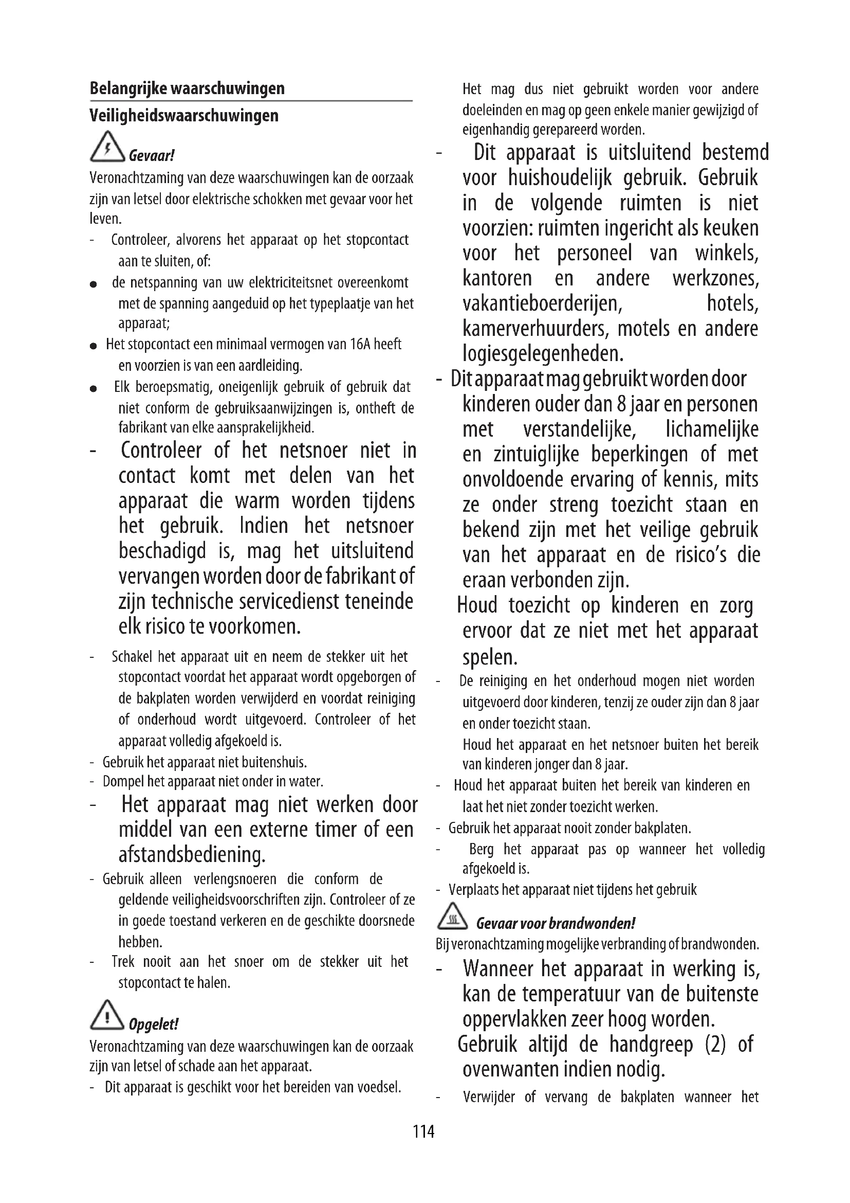 DOSI PER: 8 -10 cialde PREPARAZIONE: 10min TEMPO DI COTTURA: 15min INGREDIENTI: - farina 2 tazze / 460gr - sale 1 cucchiaino - lievito 1 cucchiaino / 3gr - zucchero 170gr - uova 2 - latte tiepido 1 tazza e 1/2 / 345ml - burro 80gr - estratto di vaniglia 1 cucchiaino - cioccolato fondente 140gr - cacao in polvere 60gr - cannella 6gr PREPARAZIONE: Porre il cioccolato e il burro in una ciotola da microonde e scaldare in forno alla massima potenza per 30 secondi. Miscelare no a quando il cioccolato e il burro si sono fusi completamente e il composto risulta liscio. Lasciare rareddare leggermente. Amalgamare con una frusta le uova, il latte e la vaniglia in una ciotola capiente e incorporare accuratamente il composto burro-cioccolato. Passare al setaccio la farina, lo zucchero, il cacao in polvere, la cannella, il lievito e il sale insieme in una ciotola capiente. Aggiungere la miscela di farina e altri ingredienti alle uova e amalgamare il tutto con una frusta no a quando il composto risulti sucientemente liscio. Preriscaldare la piastra per cialde. Quando sul display appare la scritta ready, imburrare la piastra o applicare uno spray antiaderente, quindi versare un misurino in ciascuna delle formelle della piastra aiutandosi con un cucchiaio se necessario; stendere l'impasto con una spatola. Cuocere le cialde no a quando risultino dorate e croccanti (5 min). Continuare no ad esaurimento del composto. Servire immediatamente.114 Belangrijke waarschuwingen Veiligheidswaarschuwingen Gevaar! Veronachtzaming van deze waarschuwingen kan de oorzaak zijn van letsel door elektrische schokken met gevaar voor het leven. - Controleer, alvorens het apparaat op het stopcontact aan te sluiten, of: ● de netspanning van uw elektriciteitsnet overeenkomt met de spanning aangeduid op het typeplaatje van het apparaat; ● Het stopcontact een minimaal vermogen van 16A heeft en voorzien is van een aardleiding. ● Elk beroepsmatig, oneigenlijk gebruik of gebruik dat niet conform de gebruiksaanwijzingen is, ontheft de fabrikant van elke aansprakelijkheid. - Controleer of het netsnoer niet in contact komt met delen van het apparaat die warm worden tijdens het gebruik. Indien het netsnoer beschadigd is, mag het uitsluitend vervangen worden door de fabrikant of zijn technische servicedienst teneinde elk risico te voorkomen. - Schakel het apparaat uit en neem de stekker uit het stopcontact voordat het apparaat wordt opgeborgen of de bakplaten worden verwijderd en voordat reiniging of onderhoud wordt uitgevoerd. Controleer of het apparaat volledig afgekoeld is. - Gebruik het apparaat niet buitenshuis. - Dompel het apparaat niet onder in water. - Het apparaat mag niet werken door middel van een externe timer of een afstandsbediening. - Gebruik alleen verlengsnoeren die conform de geldende veiligheidsvoorschriften zijn. Controleer of ze in goede toestand verkeren en de geschikte doorsnede hebben. - Trek nooit aan het snoer om de stekker uit het stopcontact te halen. Opgelet! Veronachtzaming van deze waarschuwingen kan de oorzaak zijn van letsel of schade aan het apparaat. - Dit apparaat is geschikt voor het bereiden van voedsel. Het mag dus niet gebruikt worden voor andere doeleinden en mag op geen enkele manier gewijzigd of eigenhandig gerepareerd worden. - Dit apparaat is uitsluitend bestemd voor huishoudelijk gebruik. Gebruik in de volgende ruimten is niet voorzien: ruimten ingericht als keuken voor het personeel van winkels, kantoren en andere werkzones, vakantieboerderijen, hotels, kamerverhuurders, motels en andere logiesgelegenheden. - Dit apparaat mag gebruikt worden door kinderen ouder dan 8 jaar en personen met verstandelijke, lichamelijke en zintuiglijke beperkingen of met onvoldoende ervaring of kennis, mits ze onder streng toezicht staan en bekend zijn met het veilige gebruik van het apparaat en de risico’s die eraan verbonden zijn. Houd toezicht op kinderen en zorg ervoor dat ze niet met het apparaat spelen. - De reiniging en het onderhoud mogen niet worden uitgevoerd door kinderen, tenzij ze ouder zijn dan 8 jaar en onder toezicht staan. Houd het apparaat en het netsnoer buiten het bereik van kinderen jonger dan 8 jaar. - Houd het apparaat buiten het bereik van kinderen en laat het niet zonder toezicht werken. - Gebruik het apparaat nooit zonder bakplaten. - Berg het apparaat pas op wanneer het volledig afgekoeld is. - Verplaats het apparaat niet tijdens het gebruik Gevaar voor brandwonden! Bij veronachtzaming mogelijke verbranding of brandwonden. - Wanneer het apparaat in werking is, kan de temperatuur van de buitenste oppervlakken zeer hoog worden. Gebruik altijd de handgreep (2) of ovenwanten indien nodig. - Verwijder of vervang de bakplaten wanneer het115 apparaat volledig is afgekoeld. Nota Bene : Dit symbool duidt op belangrijke tips en informatie voor de gebruiker. - Bereid geen voedsel dat gewikkeld is in plasticfolie, aluminiumfolie of polyethyleen zakjes, om brandgevaar te voorkomen. Dit product is in overeenstemming met Verordening (EG) nr. 1935/2004 inzake materialen en voorwerpen bestemd om in aanraking te komen met levensmiddelen. Verwerking van het apparaat Verwerk het apparaat niet samen met het huishoudelijk afval, maar breng het naar een ocieel centrum voor gescheiden afvalinzameling. BESCHRIJVING