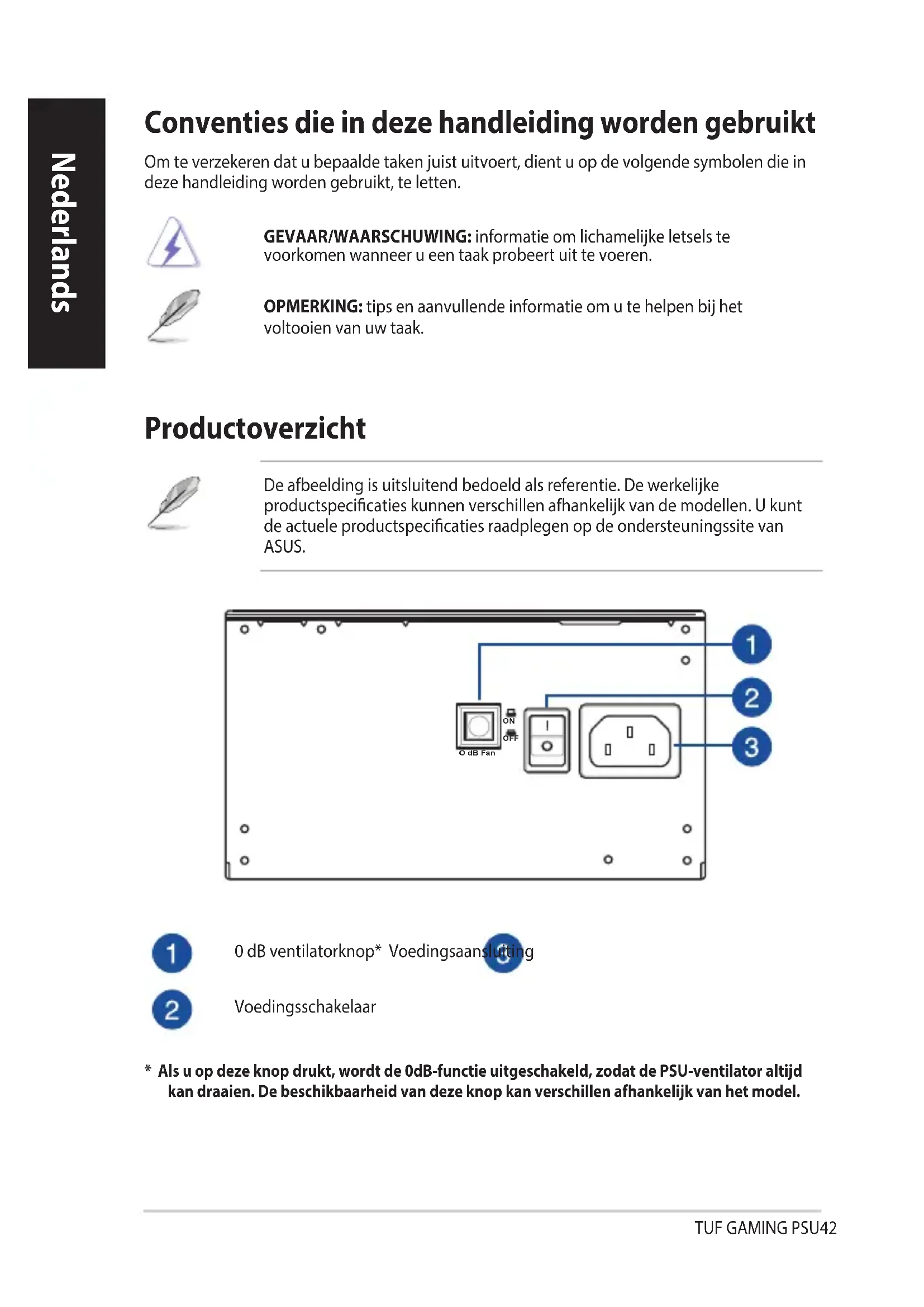 - Manglende overholdelse af producentvejledningerne og sikkerhedsvejledningerne annullerer øjeblikkeligt alle garantier.TUF GAMING PSU42 Nederlands Nederlands Conventies die in deze handleiding worden gebruikt Om te verzekeren dat u bepaalde taken juist uitvoert, dient u op de volgende symbolen die in deze handleiding worden gebruikt, te letten. GEVAAR/WAARSCHUWING: informatie om lichamelijke letsels te voorkomen wanneer u een taak probeert uit te voeren. OPMERKING: tips en aanvullende informatie om u te helpen bij het voltooien van uw taak. Productoverzicht 0 dB ventilatorknop* Voedingsaansluiting Voedingsschakelaar