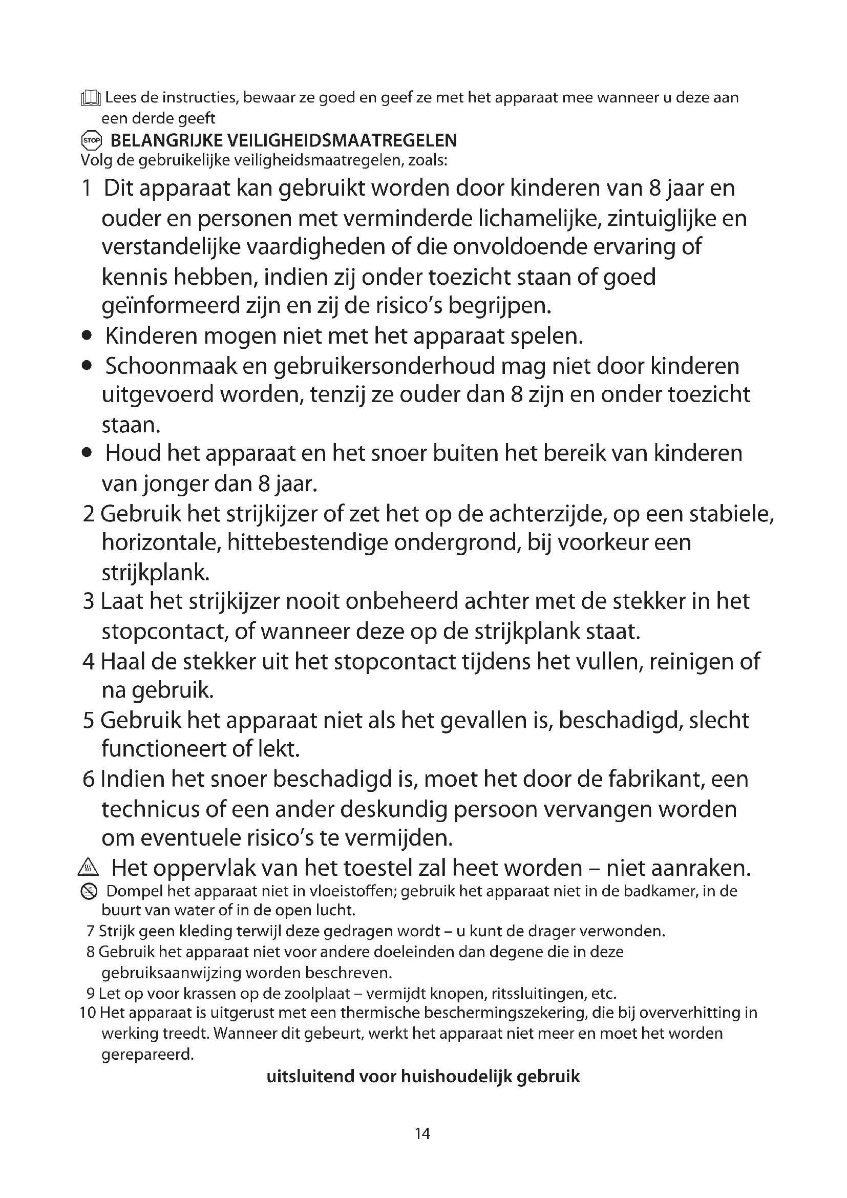 - Houd het apparaat en het snoer buiten het bereik van kinderen van jonger dan 8 jaar. 2 Gebruik het strijkijzer of zet het op de achterzijde, op een stabiele, horizontale, hittebestendige ondergrond, bij voorkeur een strijkplank. 3 Laat het strijkijzer nooit onbeheerd achter met de stekker in het stopcontact, of wanneer deze op de strijkplank staat. 4 Haal de stekker uit het stopcontact tijdens het vullen, reinigen of na gebruik. 5 Gebruik het apparaat niet als het gevallen is, beschadigd, slecht functioneert of lekt. 6 Indien het snoer beschadigd is, moet het door de fabrikant, een technicus of een ander deskundig persoon vervangen worden om eventuele risico’s te vermijden. h Het oppervlak van het toestel zal heet worden – niet aanraken. L Dompel het apparaat niet in vloeistoffen; gebruik het apparaat niet in de badkamer, in de buurt van water of in de open lucht. 7 Strijk geen kleding terwijl deze gedragen wordt – u kunt de drager verwonden. 8 Gebruik het apparaat niet voor andere doeleinden dan degene die in deze gebruiksaanwijzing worden beschreven. 9 Let op voor krassen op de zoolplaat – vermijdt knopen, ritssluitingen, etc. 10 Het apparaat is uitgerust met een thermische beschermingszekering, die bij oververhitting in werking treedt. Wanneer dit gebeurt, werkt het apparaat niet meer en moet het worden gerepareerd. uitsluitend voor huishoudelijk gebruik15