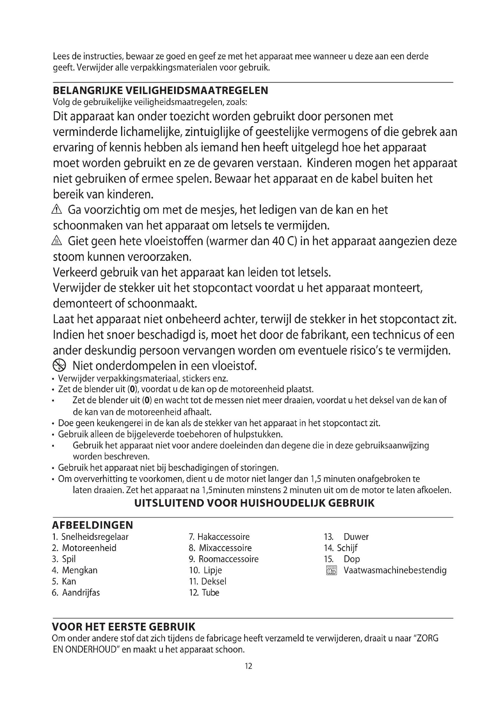 AE12 Lees de instructies, bewaar ze goed en geef ze met het apparaat mee wanneer u deze aan een derde geeft. Verwijder alle verpakkingsmaterialen voor gebruik. BELANGRIJKE VEILIGHEIDSMAATREGELEN Volg de gebruikelijke veiligheidsmaatregelen, zoals: Dit apparaat kan onder toezicht worden gebruikt door personen met verminderde lichamelijke, zintuiglijke of geestelijke vermogens of die gebrek aan ervaring of kennis hebben als iemand hen heeft uitgelegd hoe het apparaat moet worden gebruikt en ze de gevaren verstaan. Kinderen mogen het apparaat niet gebruiken of ermee spelen. Bewaar het apparaat en de kabel buiten het bereik van kinderen. c Ga voorzichtig om met de mesjes, het ledigen van de kan en het schoonmaken van het apparaat om letsels te vermijden. h Giet geen hete vloeistoffen (warmer dan 40 C) in het apparaat aangezien deze stoom kunnen veroorzaken. Verkeerd gebruik van het apparaat kan leiden tot letsels. Verwijder de stekker uit het stopcontact voordat u het apparaat monteert, demonteert of schoonmaakt. Laat het apparaat niet onbeheerd achter, terwijl de stekker in het stopcontact zit. Indien het snoer beschadigd is, moet het door de fabrikant, een technicus of een ander deskundig persoon vervangen worden om eventuele risico’s te vermijden.