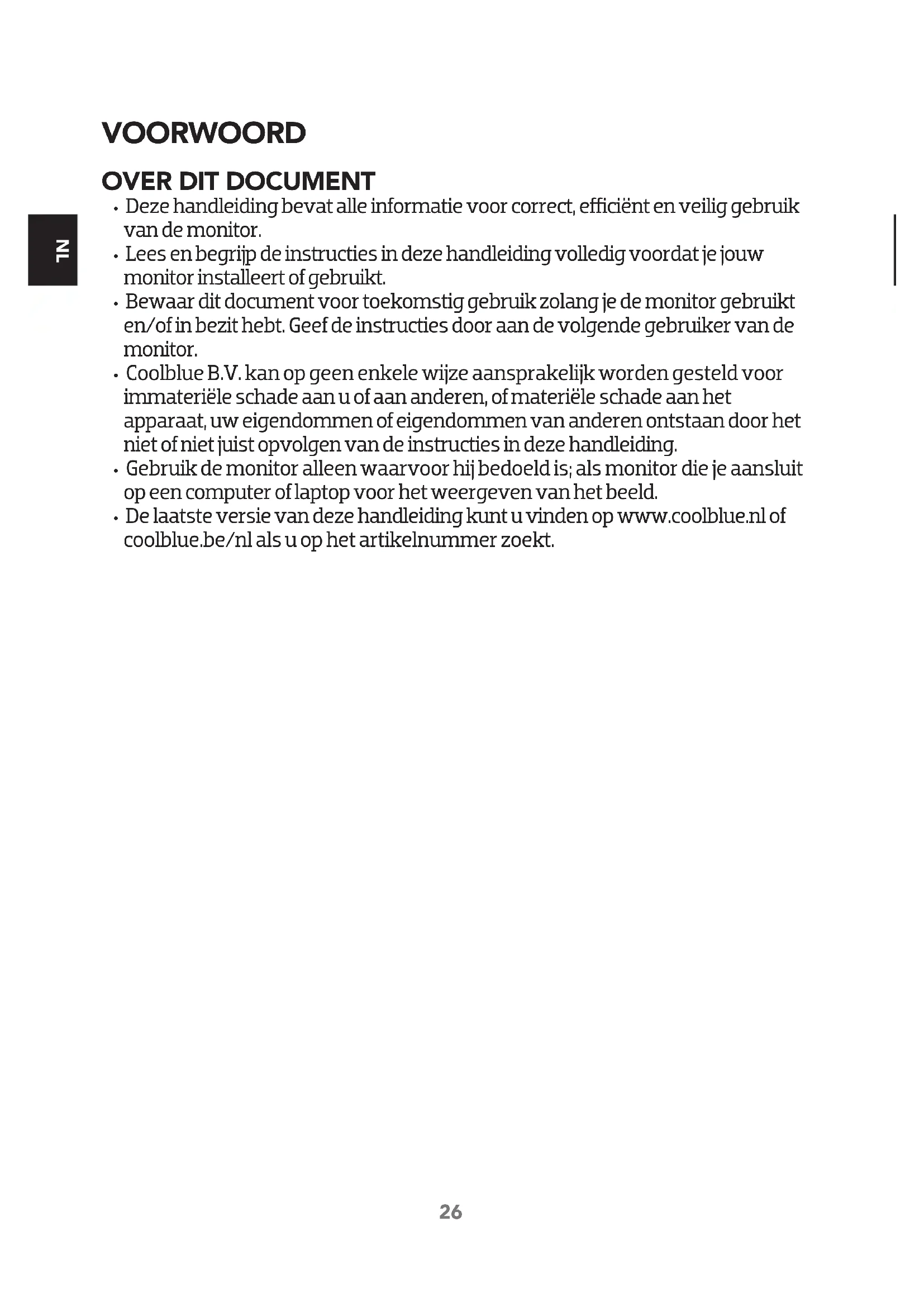 - Bewaar dit document voor toekomstig gebruik zolang je de monitor gebruikt en/of in bezit hebt. Geef de instructies door aan de volgende gebruiker van de monitor.