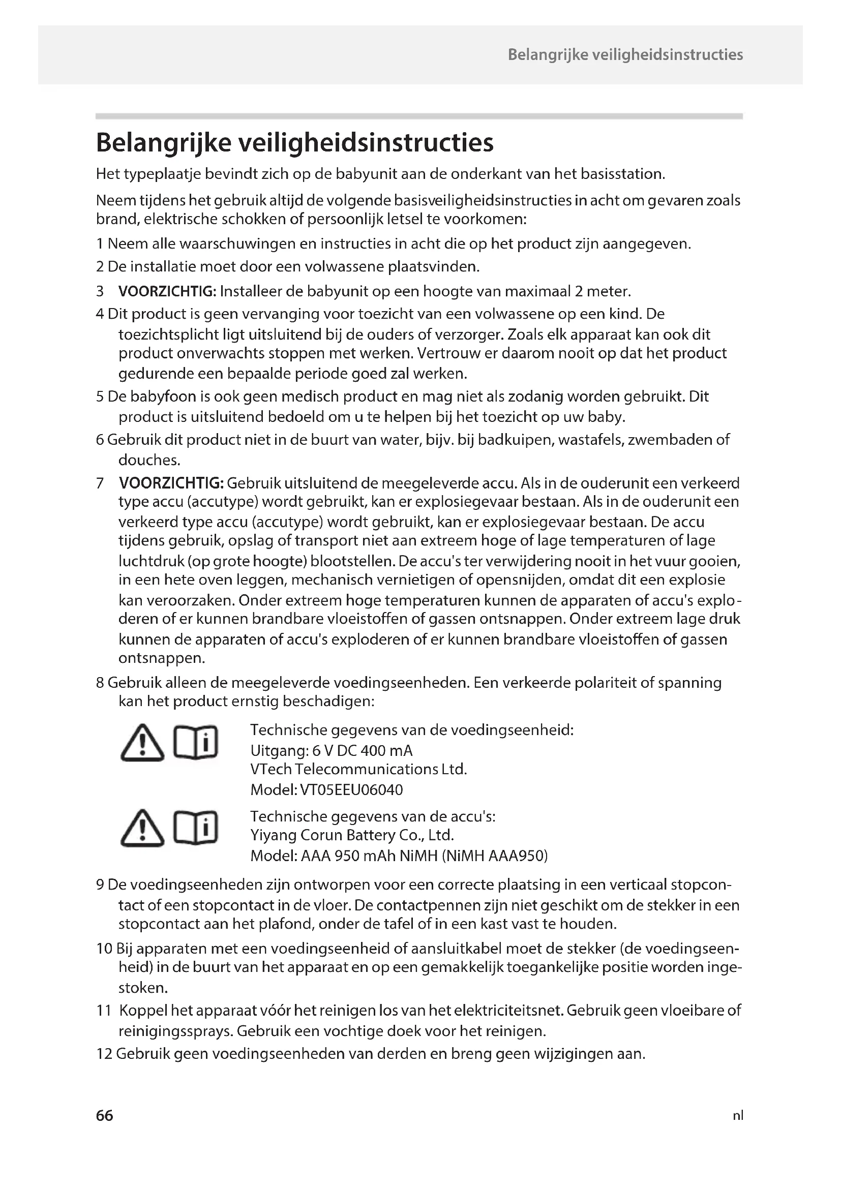 deren of er kunnen brandbare vloeistoffen of gassen ontsnappen. Onder extreem lage druk kunnen de apparaten of accu's exploderen of er kunnen brandbare vloeistoffen of gassen ontsnappen. 8 Gebruik alleen de meegeleverde voedingseenheden. Een verkeerde polariteit of spanning kan het product ernstig beschadigen: 9 De voedingseenheden zijn ontworpen voor een correcte plaatsing in een verticaal stopcon- tact of een stopcontact in de vloer. De contactpennen zijn niet geschikt om de stekker in een stopcontact aan het plafond, onder de tafel of in een kast vast te houden. 10 Bij apparaten met een voedingseenheid of aansluitkabel moet de stekker (de voedingseen- heid) in de buurt van het apparaat en op een gemakkelijk toegankelijke positie worden inge- stoken. 11 Koppel het apparaat vóór het reinigen los van het elektriciteitsnet. Gebruik geen vloeibare of reinigingssprays. Gebruik een vochtige doek voor het reinigen. 12 Gebruik geen voedingseenheden van derden en breng geen wijzigingen aan. Technische gegevens van de voedingseenheid: Uitgang: 6 V DC 400 mA VTech Telecommunications Ltd. Model: VT05EEU06040 Technische gegevens van de accu's: Yiyang Corun Battery Co., Ltd. Model: AAA 950 mAh NiMH (NiMH AAA950)Template Module, Version 2.2, 15.11.2022 / Template Basiseinstellungen - 29.11.2022 Belangrijke veiligheidsinstructies Gigaset BABY100 Audio / ALL DE de / A31008-N1225-B101-1-43 / BABY100_nl.fm / 5/22/25