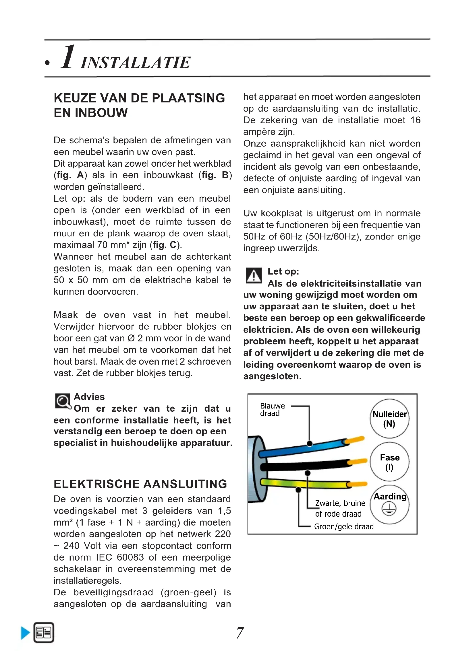 EN INBOUW De schema's bepalen de afmetingen van een meubel waarin uw oven past.Dit apparaat kan zowel onder het werkblad (g. A) als in een inbouwkast (g. B) worden geïnstalleerd. Let op: als de bodem van een meubel open is (onder een werkblad of in een inbouwkast), moet de ruimte tussen de muur en de plank waarop de oven staat, maximaal 70 mm* zijn (g. C).Wanneer het meubel aan de achterkant gesloten is, maak dan een opening van 50 x 50 mm om de elektrische kabel te kunnen doorvoeren.Maak de oven vast in het meubel. Verwijder hiervoor de rubber blokjes en boor een gat van Ø 2 mm voor in de wand van het meubel om te voorkomen dat het hout barst. Maak de oven met 2 schroeven vast. Zet de rubber blokjes terug.Advies Om er zeker van te zijn dat u een conforme installatie heeft, is het verstandig een beroep te doen op een specialist in huishoudelijke apparatuur. ELEKTRISCHE AANSLUITING De oven is voorzien van een standaard voedingskabel met 3 geleiders van 1,5 mm² (1 fase + 1 N + aarding) die moeten worden aangesloten op het netwerk 220 ~ 240 Volt via een stopcontact conform de norm IEC 60083 of een meerpolige schakelaar in overeenstemming met de installatieregels.De beveiligingsdraad (groen-geel) is aangesloten op de aardaansluiting van het apparaat en moet worden aangesloten op de aardaansluiting van de installatie. De zekering van de installatie moet 16 ampère zijn.Onze aansprakelijkheid kan niet worden geclaimd in het geval van een ongeval of incident als gevolg van een onbestaande, defecte of onjuiste aarding of ingeval van een onjuiste aansluiting.Uw kookplaat is uitgerust om in normale staat te functioneren bij een frequentie van 50Hz of 60Hz (50Hz/60Hz), zonder enige ingreep uwerzijds.Let op: Als de elektriciteitsinstallatie van uw woning gewijzigd moet worden om uw apparaat aan te sluiten, doet u het beste een beroep op een gekwaliceerde elektricien. Als de oven een willekeurig probleem heeft, koppelt u het apparaat af of verwijdert u de zekering die met de leiding overeenkomt waarop de oven is aangesloten. Blauwe draad Nulleider (N) Fase (l) Zwarte, bruine of rode draad Groen/gele draad Aarding8