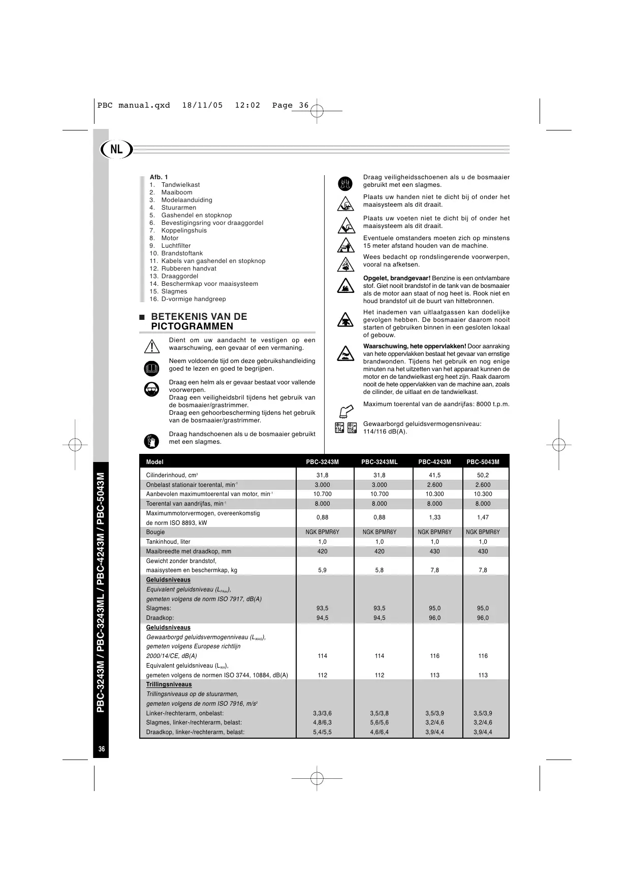 PICTOGRAMMEN Dient om uw aandacht te vestigen op een waarschuwing, een gevaar of een vermaning. Waarschuwing, hete oppervlakken! Door aanraking van hete oppervlakken bestaat het gevaar van ernstige brandwonden. Tijdens het gebruik en nog enige minuten na het uitzetten van het apparaat kunnen de motor en de tandwielkast erg heet zijn. Raak daarom nooit de hete oppervlakken van de machine aan, zoals de cilinder, de uitlaat en de tandwielkast. Neem voldoende tijd om deze gebruikshandleiding goed te lezen en goed te begrijpen. Draag een helm als er gevaar bestaat voor vallende voorwerpen. Draag een veiligheidsbril tijdens het gebruik van de bosmaaier/grastrimmer. Draag een gehoorbescherming tijdens het gebruik van de bosmaaier/grastrimmer. Maximum toerental van de aandrijfas: 8000 t.p.m. Gewaarborgd geluidsvermogensniveau: 114/116 dB(A). Draag handschoenen als u de bosmaaier gebruikt met een slagmes. PBC-3243M / PBC-3243ML / PBC-4243M / PBC-5043M Model