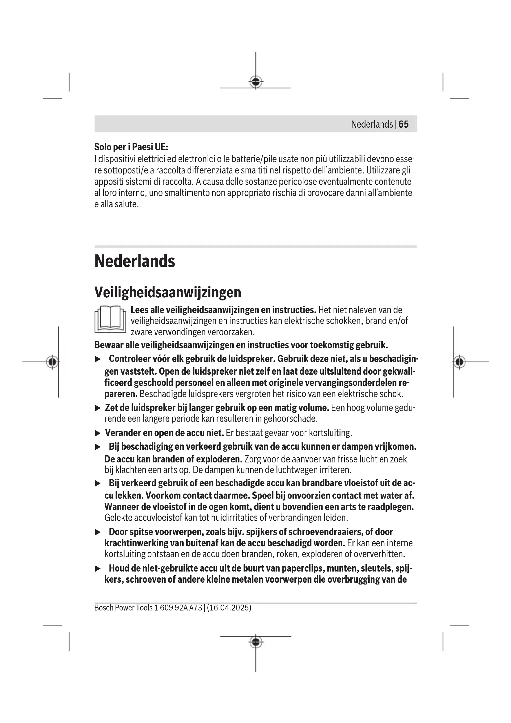 De LED's van de accu-oplaadaanduidingen kunnen naast de laadtoestand van de accu het risico voor een accudefect aangeven. Bosch Power Tools 1 609 92A A7S | (16.04.2025)70 | Nederlands Om de functie te activeren houdt u de toets voor de oplaadaanduiding 3seconden lang ingedrukt. De analyse van de accu wordt aangegeven door een looplicht van de ac- cu-oplaadaanduiding. Het resultaat wordt aangegeven op de accu-oplaadaanduiding. 1 LED: de accu heeft een hoog defectrisico. Vermogen en looptijd kunnen al verminderd zijn. Er wordt aangeraden de accu te vervan- gen. 5 LED's: de accu bevindt zich in goede staat met een gering defectri- sico. Let op: de inschatting van een accudefect werkt in twee trappen en biedt een vereenvou- digde beoordeling van de toestand. De accu wordt ofwel beoordeeld als zijnde in goede staat of vertoont een verhoogd defectrisico. Er wordt geen percentage van de accutoe- stand aangegeven. Accu afdekken Als er geen kabel op de USB Type‑C®-bus(15) aangesloten is, dan kunt u de luidspreker en accu met de accuafdekking(11) beschermen tegen stof en spatwater. Breng de accuafdekking(11) aan en sluit deze met de vergrendelingshendels(10). Voor het vervangen van de accu of voor werking met voedingsadapter opent u de vergrendelingshendels(10) van de accuafdekking en neemt u de accuafdekking(11) weg. Aanwijzingen voor de optimale omgang met de accu Bescherm de accu tegen vocht en water. Bewaar de accu alleen bij een temperatuur tussen –20 °C en 50 °C. Laat de accu bijvoor- beeld in de zomer niet in de auto liggen. Reinig de ventilatieopeningen van de accu af en toe met een zachte, schone en droge doek. Een duidelijk kortere gebruiksduur na het opladen duidt erop dat de accu versleten is en moet worden vervangen. Neem de aanwijzingen met betrekking tot afvalverwijdering in acht. Gebruik met voedingsadapter u Let op de netspanning! De spanning van de stroombron moet overeenkomen met de gegevens op het typeplaatje van de voedingsadapter. u Gebruik voor werking op het elektriciteitsnet uitsluitend een USB TypeC®-voe- dingsadapter met Power Delivery (USB‑PD). Deze moet wat betreft uit- gangsspanning, minimale uitgangsstroom en uitgangsvermogen voldoen aan de 1 609 92A A7S | (16.04.2025) Bosch Power ToolsNederlands | 71 minimumvereisten in het hoofdstuk "Technische gegevens". Neem goed nota van de gebruiksaanwijzing van de voedingsadapter. Bij gebruik van andere voe- dingsadapters kan de luidspreker worden beschadigd. Bij een te gering vermogen van de voedingsadapter wordt de luidspreker uitgeschakeld. Open de afdekking van de USB Type‑C®-bus(15). Verbind de voedingsadapter via een geschikte kabel met de USB Type‑C®-bus(15) van de luidspreker. Sluit de voedings- adapter op het elektriciteitsnet aan. Sluit ter bescherming tegen vuil de afdekking van de USB Type‑C®-bus(15) weer, wan- neer u de kabel van de voedingsadapter verwijdert. Gebruik u Bescherm de luidspreker tegen direct contact met water. Het binnendringen van water in de luidspreker verhoogt het risico van een elektrische schok. u Houd de accuafdekking en de afdekking van de USB Type‑C®-bus indien mogelijk gesloten. De gesloten afdekkingen beschermen de luidspreker tegen water en stof. Audiomodus In-/uitschakelen en volume regelen Druk voor het inschakelen van de luidspreker zo lang op de aan/uit-toets(2) tot de statusaanduiding(3) kort groen oplicht. Druk voor het uitschakelen van de luidspreker zo lang op de aan/uit-toets(2) tot de statusaanduiding(3) uitgaat. De luidspreker wordt na 20minuten automatisch uitgeschakeld, wanneer gedurende de- ze tijd geen verbinding per Bluetooth® of Multi-Speaker Sound tot stand kan worden ge- bracht. Voor het regelen van het volume drukt u zo vaak kort op de toetsen voor volume verhogen(5) of volume verlagen(7) tot het gewenste volume bereikt is. Na het inscha- kelen van de luidspreker is altijd een laag volume ingesteld. Overzicht audiofuncties De luidspreker beschikt over de volgende audiofuncties: – Weergave van per Bluetooth® verbonden apparaten (standaard ingesteld) – Weergave via Multi-Speaker Sound – Overdracht van de huidige weergave per Bluetooth® via Multi-Speaker Sound naar an- dere apparaten met deze functie Bosch Power Tools 1 609 92A A7S | (16.04.2025)72 | Nederlands De huidige audiofunctie is te herkennen aan de statusaanduiding(3): – Blauw: weergave van een Bluetooth®-signaal – Lichtblauw: weergave van een Multi-Speaker Stream – Paars: overdracht van de huidige weergave per Multi-Speaker Sound Externe audiobronnen via Bluetooth® afspelen/regelen Na het inschakelen van de luidspreker is de weergave via Bluetooth® standaard inge- steld. Om van een andere audiofunctie naar Bluetooth® te wisselen, drukt u kort op de toets Bluetooth®(1). – Opbouwen van een nieuwe verbinding: start zoeken van een verbinding, wanneer geen opgeslagen audiobron beschikbaar is of een beschikbare verbinding met een au- diobron via Bluetooth® beëindigd en een nieuwe audiobron gezocht moet worden. Druk hiervoor langer dan 0,5s op de toets Bluetooth®(1). Tijdens het zoeken knippert de statusaanduiding(3) in een snel ritme blauw. Activeer de nieuwe verbinding via de externe audiobron. Dat is bij smartphones mee- stal mogelijk binnen de instellingen in het menu Bluetooth®. De luidspreker verschijnt als beschikbaar apparaat onder de naam GPB18V‑1Cxxxx. Neem hiervoor goed no- ta van de gebruiksaanwijzing van uw audiobron/smartphone. – Opnieuw verbinden: als de luidspreker al via Bluetooth® met een externe audiobron (bijv. smartphone) verbonden was en als deze audiobron beschikbaar is, dan wordt automatisch een verbinding met deze audiobron tot stand gebracht. Tijdens het op- bouwen van de verbinding knippert de statusaanduiding(3) in een langzaam ritme blauw. Als de opgeslagen audiobron niet beschikbaar is, dan wordt na 2min automatisch het zoeken van een verbinding gestart. Als de verbinding met succes tot stand werd gebracht, is een oplopend geluidssignaa